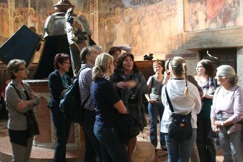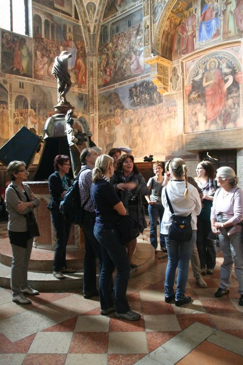Dem Besuch in dieser Kirche und beim Grab des heiligen Antonius galt dann auch der erste Ausflug gleich nach der Ankunft in Padua und dem Bezug des Hotels, das glücklicherweise in unmittelbarer Nähe der Basilika und im Kern der Altstadt lag. Am nächsten Morgen wurden beim Stadtrundgang mit einer kundigen Fremdenführerin zahlreiche Details und Geschichten der Stadt lebendig. Mit viel Humor und Temperament wurden den Reiseteilnehmenden der riesige Justizpalast, das Baptisterium (Taufkirche) beim Dom und das berühmte „Cafè Pedrocchi“ nähergebracht. Natürlich wurde die gleichnamige Spezialität des Hauses auch gleich probiert. Am Nachmittag lockten dann der Botanische Garten, das feine Glace oder andere „Dolci“ sowie die zahlreichen Geschäfte und der Markt. Zum Abendessen traf dann auch Gemeindeleiterin Christina Burger in Padua ein – gerade rechtzeitig, um mit dem Besuch der von Giotto ausgemalten Scrovegni-Kapelle einen weiteren Höhepunkt mitzuerleben. Die Bilder und Farben sprechen noch nach über 600 Jahren eine ganz eigene Sprache und bezaubern die Betrachtenden.