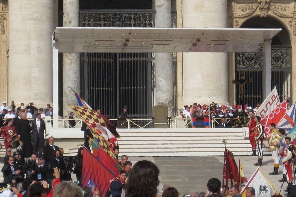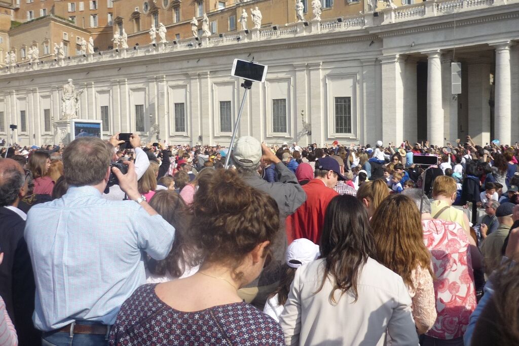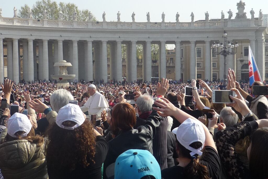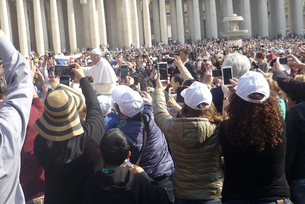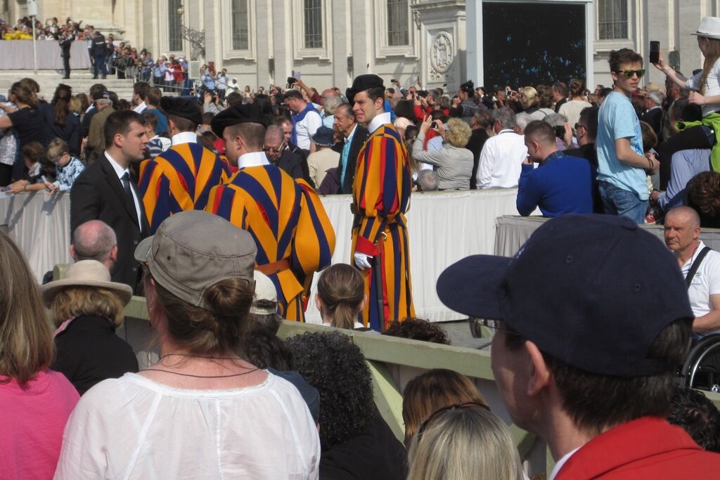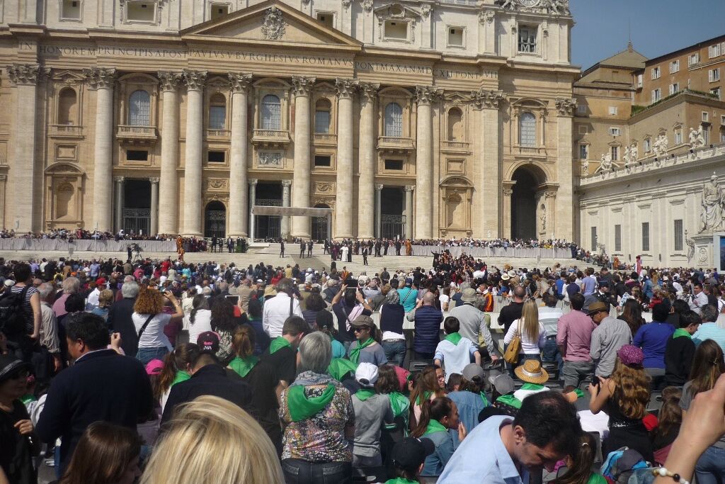 Der Mittwoch war dann der „Vatican-Day“. Bereits um halb sieben gab es Frühstück, damit man rechtzeitig zum nahegelegenen Vatikan aufbrechen und dort einen guten Platz für die Generalaudienz auf dem Petersplatz bekommen konnte. Die Zeit bis zum Beginn der Audienz und dem Eintreffen von Papst Franziskus wurde mit dem Schreiben von Postkarten und dem Blättern im Reisetagebuch überbrückt. Es ist immer wieder ein unbeschreibliches Gefühl, inmitten der vielen tausend Menschen aus aller Welt zu stehen, zu beten, zu singen. Verschiedene Gruppierungen boten Musikstücke und andere Vorführungen dar; die Jugendlichen jubelten laut, als die „Firmanden aus Leuggern und Kleindöttingen“ offiziell begrüsst wurden. Noch grösserer Jubel erklang aber, als wenig später der Papst in seinem „Papamobil“ erschien und einige Runden auf dem Platz drehte um die Pilger zu begrüssen. Nach seiner Ansprache, den Grussworten in vielen verschiedenen Sprachen und dem gemeinsamen Vaterunser endete die Audienz mit dem päpstlichen Segen. Während sich der Petersplatz allmählich leerte, brachen die Jugendlichen zu ihrem nächsten Termin auf. Im nur wenige hundert Meter entfernt in der „Via della Conciliazione“ liegenden Sitz des „Päpstlichen Rates für die Einheit der Christen“ trafen sie den ehemaligen Bischof von Basel und jetzigen Präsidenten des Rates, Kardinal Kurt Koch. Trotz seines vollen Terminkalenders hatte er sich Zeit genommen, um den Jugendlichen von seiner Tätigkeit in der Kurie zu berichten, die ihn in viele verschiedene Länder führt. Aber er hörte auch ihnen zu und beantwortete ihre Fragen. Er freute sich sichtlich über die Gäste aus seiner Heimat, die noch dazu eine ganze Sammlung Schweizer Schokolade als Dankeschön mitgebracht hatten. Nach einem Gruppenfoto versprach er dann auch, dem Papst mindestens eine Tafel Schokolade zu überreichen, zusammen mit einem herzlichen Gruss.