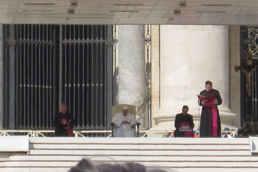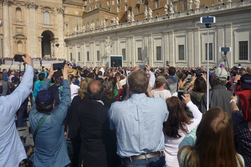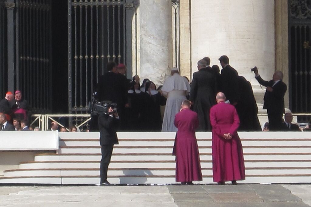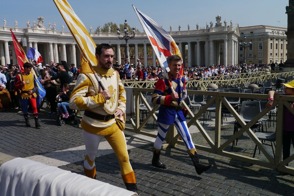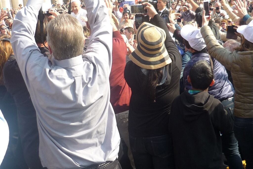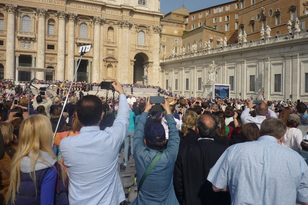 Der Mittwoch war dann der „Vatican-Day“. Bereits um halb sieben gab es Frühstück, damit man rechtzeitig zum nahegelegenen Vatikan aufbrechen und dort einen guten Platz für die Generalaudienz auf dem Petersplatz bekommen konnte. Die Zeit bis zum Beginn der Audienz und dem Eintreffen von Papst Franziskus wurde mit dem Schreiben von Postkarten und dem Blättern im Reisetagebuch überbrückt. Es ist immer wieder ein unbeschreibliches Gefühl, inmitten der vielen tausend Menschen aus aller Welt zu stehen, zu beten, zu singen. Verschiedene Gruppierungen boten Musikstücke und andere Vorführungen dar; die Jugendlichen jubelten laut, als die „Firmanden aus Leuggern und Kleindöttingen“ offiziell begrüsst wurden. Noch grösserer Jubel erklang aber, als wenig später der Papst in seinem „Papamobil“ erschien und einige Runden auf dem Platz drehte um die Pilger zu begrüssen. Nach seiner Ansprache, den Grussworten in vielen verschiedenen Sprachen und dem gemeinsamen Vaterunser endete die Audienz mit dem päpstlichen Segen. Während sich der Petersplatz allmählich leerte, brachen die Jugendlichen zu ihrem nächsten Termin auf. Im nur wenige hundert Meter entfernt in der „Via della Conciliazione“ liegenden Sitz des „Päpstlichen Rates für die Einheit der Christen“ trafen sie den ehemaligen Bischof von Basel und jetzigen Präsidenten des Rates, Kardinal Kurt Koch. Trotz seines vollen Terminkalenders hatte er sich Zeit genommen, um den Jugendlichen von seiner Tätigkeit in der Kurie zu berichten, die ihn in viele verschiedene Länder führt. Aber er hörte auch ihnen zu und beantwortete ihre Fragen. Er freute sich sichtlich über die Gäste aus seiner Heimat, die noch dazu eine ganze Sammlung Schweizer Schokolade als Dankeschön mitgebracht hatten. Nach einem Gruppenfoto versprach er dann auch, dem Papst mindestens eine Tafel Schokolade zu überreichen, zusammen mit einem herzlichen Gruss.