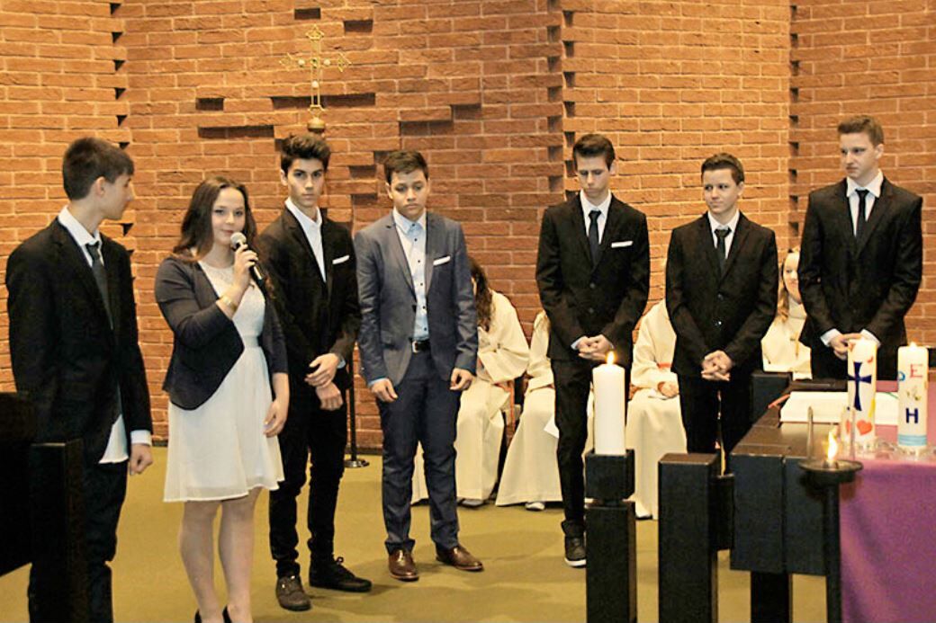 Dann kamen erstmals die Firmandinnen und Firmanden selbst zu Wort. Sie begrüssten ihre Angehörigen und Firmpatinnen und –paten sowie die zahlreich zu den beiden Gottesdiensten erschienenen Gläubigen. Sie bedankten sich bei allen Personen, die sie in den vergangenen Jahren auf diesen Tag der Firmung vorbereitet hatten, besonders bei den Frauen und Männern, mit denen sie das letzte halbe Jahr in den Firmgruppen viel Schönes erleben und erfahren durften.