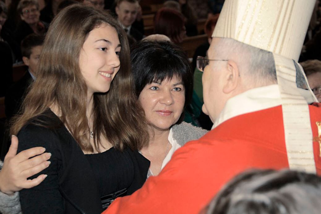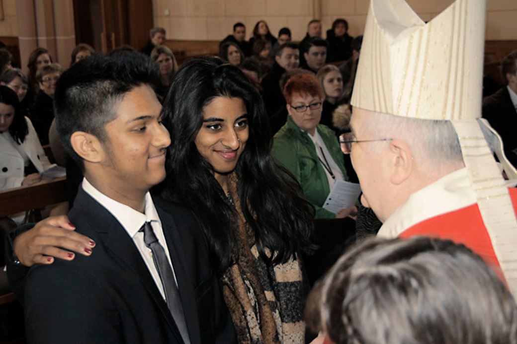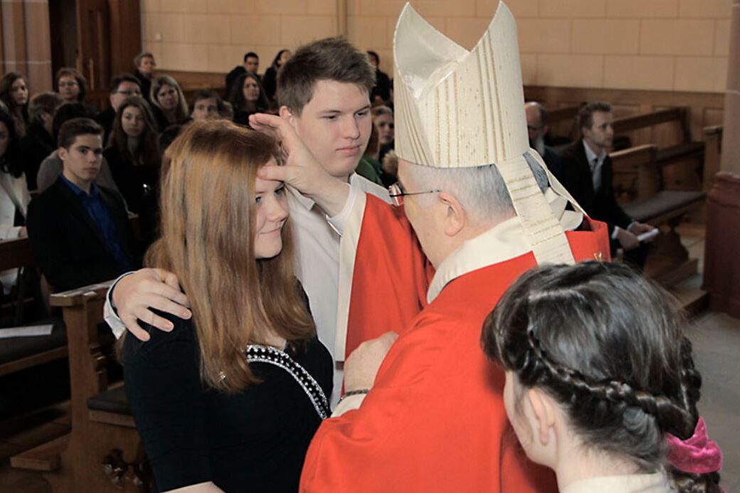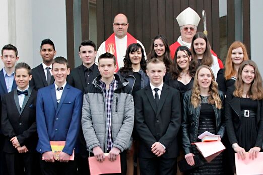 Dass sie dazu bereit sind und auf Gottes Nähe und Hilfe in ihrem Leben vertrauen, machten sie in kurzen Glaubenszeugnissen deutlich, die jede und jeder für sich selbst formuliert hatte und vortrug. Voller Überzeugung antworteten sie dem Bischof auf die Fragen des anschliessenden Firmversprechens mit „Ja, ich glaube es.“ und „Ja, ich verspreche es.“ Die einzelnen Fragen sowie das Apostolische Glaubensbekenntnis, das nun von allen gemeinsam gebetet wurde, waren zentrale Themen in den Firmgruppentreffen der letzten Wochen und Monate. Nach dem Gebet des Bischofs um den Heiligen Geist und einem weiteren Lied folgte der Höhepunkt der Feier. Zur Firmspendung traten die jungen Frauen und Männer zusammen mit ihrer Patin oder ihrem Paten vor den Bischof, der ihnen die Hand auflegte und sie mit dem Chrisamöl salbte und sich auch jeweils noch Zeit für einige persönliche Worte nahm. Gemeindeleiterin Christina Burger, Pfarrer Stefan Essig und Katechetin Claudia Rüegsegger gratulierten den Neugefirmten und überreichten ihnen neben ihrer Firmurkunde als Geschenk eine Bibel mit persönlicher Widmung.