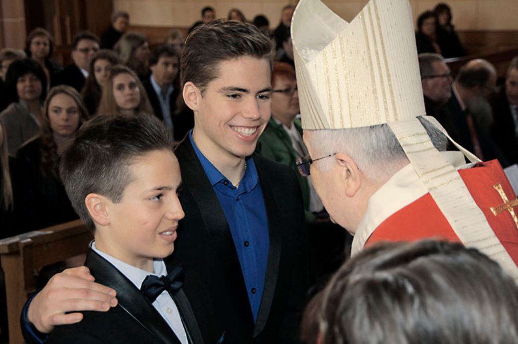 Am Ende beider Firmgottesdienste hatten alle Beteiligten noch Grund zum Danken: Die Neugefirmten bedankten sich bei Weihbischof Denis Theurillat nicht nur mit Worten, sondern auch mit insgesamt sieben Flaschen Wein, für die jede Firmgruppe ein Etikett gestaltet hatte. Der Bischof freute sich sehr und erinnerte schmunzelnd daran, dass man ja am Sonntag auch in der Fastenzeit nicht fasten müsse. Er bedankte sich herzlich, auch bei allen, die bei der Vorbereitung der Jugendlichen auf die Firmung und bei Vorbereitung und Gestaltung der Firmgottesdienste mitgeholfen hatten. Und entsprechend der Bitte im Schlusslied „Bleibe bei uns, o Gott“ erbat er den Segen Gottes, bevor er die Feier mit einem letzten Wunsch an die Neugefirmten und ihre Familien beendete. Organist Markus Florian begleitete den Aufbruch der Neugefirmten in ihr eigenverantwortliches Leben als Christinnen und Christen mit der Titelmusik aus dem Film „Piraten der Karibik“ – was auf der Orgel natürlich sehr gewaltig klang.