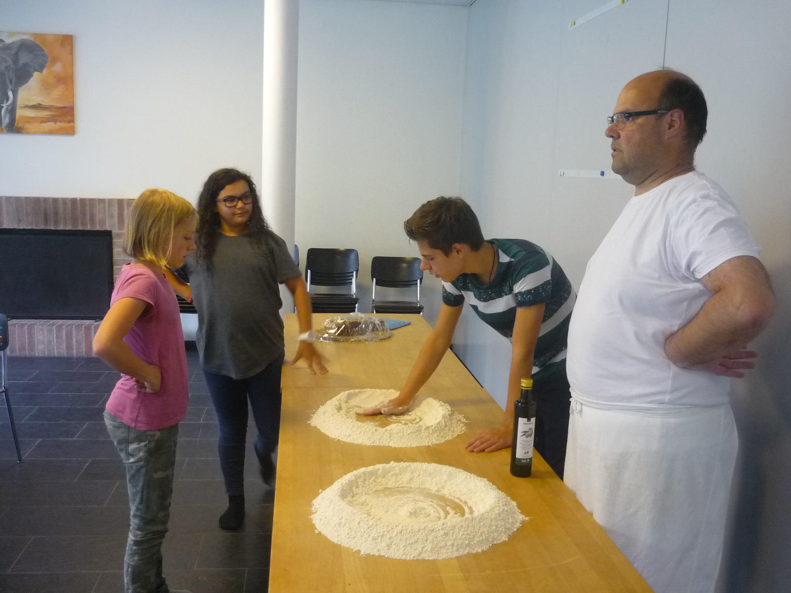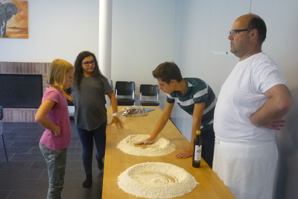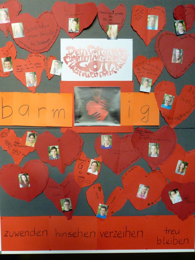 in diesem "Heiligen Jahr der Barmherzigkeit" stand ein Bibelwort aus dem alttestamentlichen Buch Deuteronomium im Mittelpunkt: "Dein Gott ist ein barmherziger Gott; er lässt dich nicht fallen." (Dtn 4,31) Die Jugendlichen konnten auf mehrfache Weise erfahren, dass dieser Zuspruch jeder und jedem Einzelnen von ihnen gilt. Sie hörten die neutestamentliche Geschichte, die am kommenden Sonntag auch im Gottesdienst vorgelesen wird. Eine Frau macht sich mutig zu Jesus auf den Weg machte, obwohl sie in den Augen ihrer Mitmenschen als Sünderin gilt und keinerlei Achtung geniesst. Aber Jesus kümmert sich genauso um sie wie um alle anderen, vermeintlich "gerechten" oder "frommen" Menschen; so macht er die Barmherzigkeit Gottes erfahrbar. Die Kirche kennt verschiedene "Werke der Barmherzigkeit", welche die Jugendlichen zunächst theoretisch und spielerisch erfahren durften. Wenn dann aber drei ältere Oberstufenschülerinnen und -schüler zusammen mit Pfarrer Stefan Essig Pizza backen, 9 kg Kartoffeln in Pommer Frites verwandeln und nebenbei noch Zopf fürs z'Morge am Sonntag backen, dann wird "Hungrige Speisen" plötzllich ganz konkret. Wenn Leiterinner und Leiter von Jungwacht und Blauring Leuggern extra am Samstag anreisen, um ein Nachmittagsprogramm mit den Jugendlichen zu gestalten, dann könnte man das durchaus als "Kranke besuchen" durchgehen lassen. Und "Trauernde trösten" könnte auch heissen, jemandem über Heimweh hinweghelfen. Viele Beispiele aus ihrem Alltag konnten auch die 9 Buben und 14 Mädchen beisteuern, in denen sie ertragen, trösten, teilen und helfen.