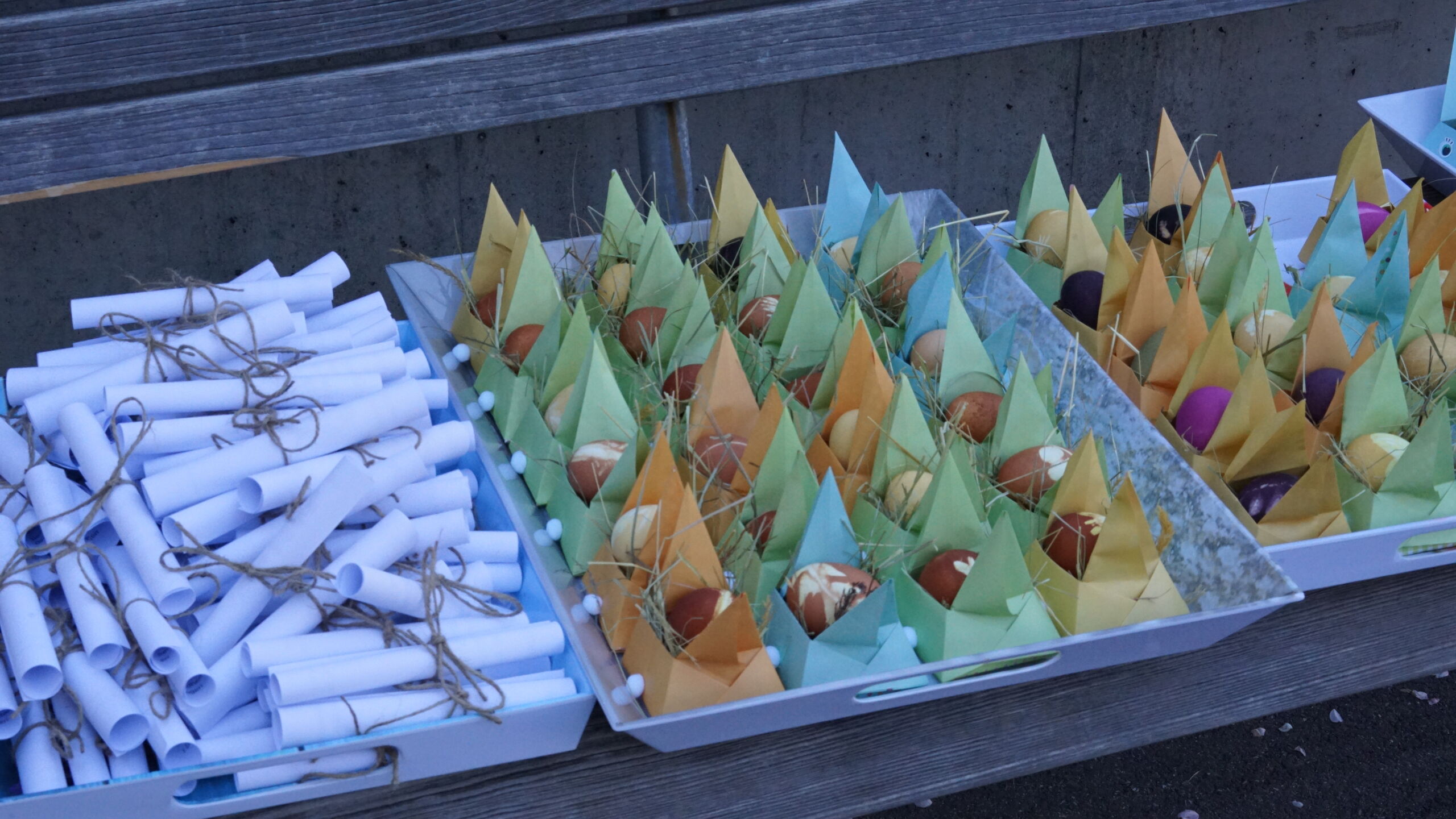 Am vergangenen Samstagabend überraschte das Kernteam der katholischen Kirche Döttingen die Bewohnerinnen und Bewohner des Altersheims Aareperle mit kleinen Ostergeschenken. Bereits zwei Wochen zuvor hatte die Gruppierung 90 kleine Osterhasen-Nester in frühlingshaften Farben gefaltet und gebastelt. Diese wurden anschliessend mit farbigen Eiern befüllt, die in liebevoller Handarbeit von den Ostereierfärbe-Frauen gefärbt wurden. Dazu gab es jeweils ein Gedicht mit herzlichen Ostergrüssen und den besten Wünschen für gute Gesundheit.