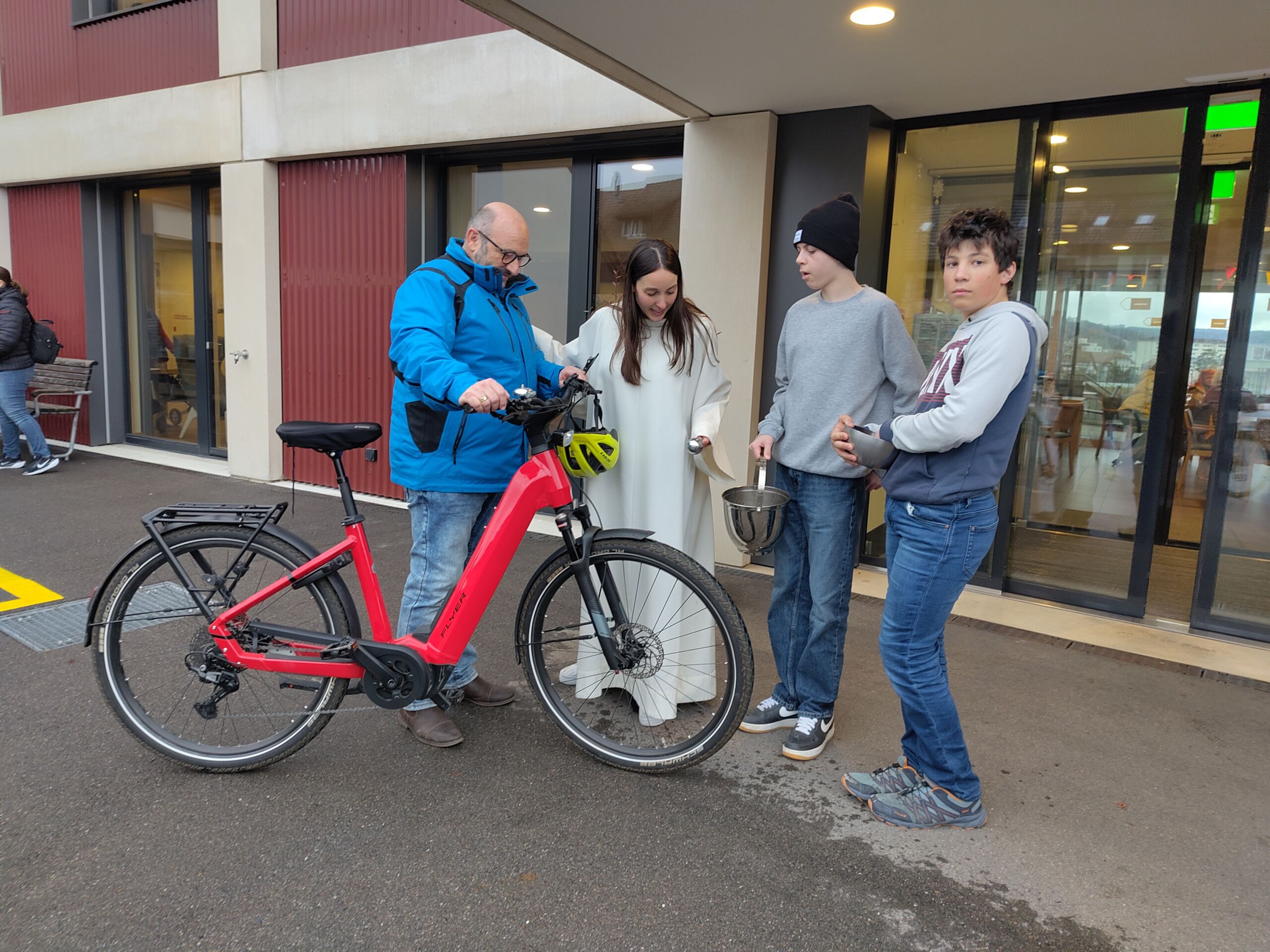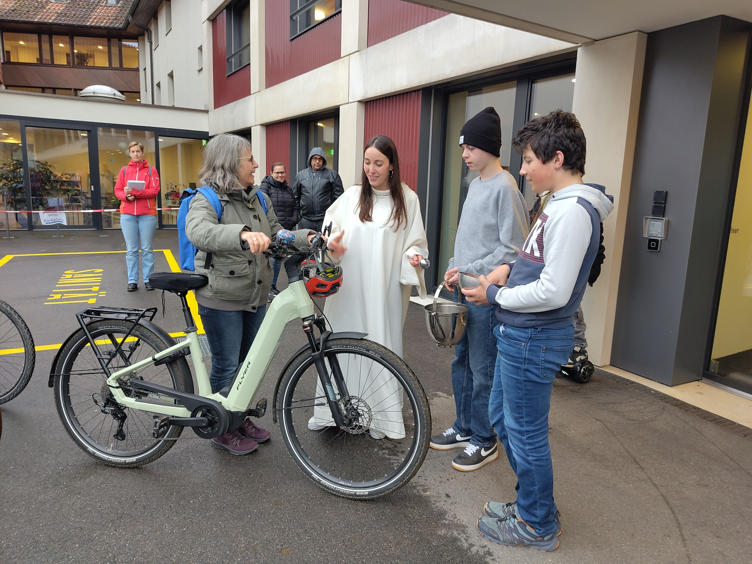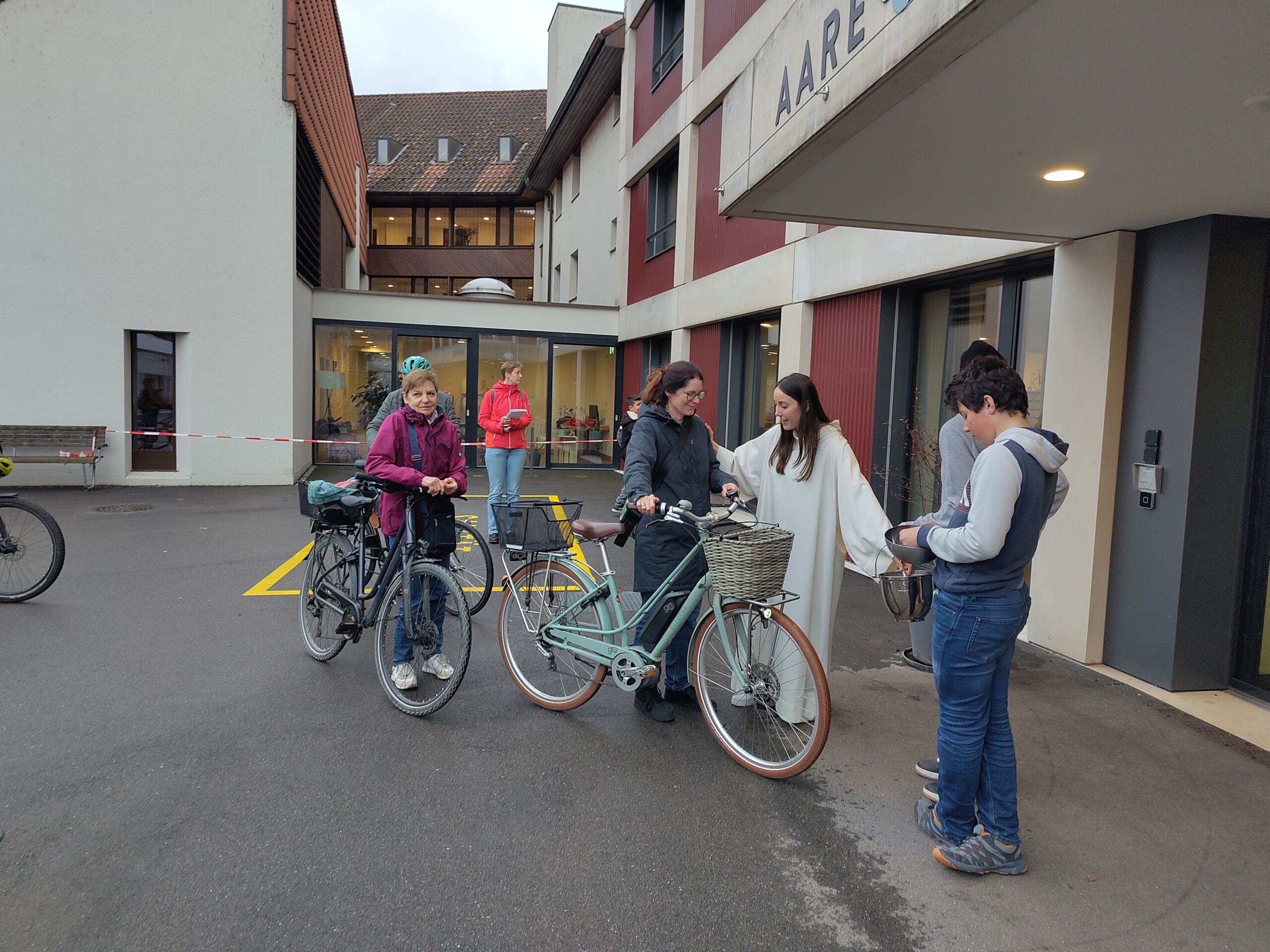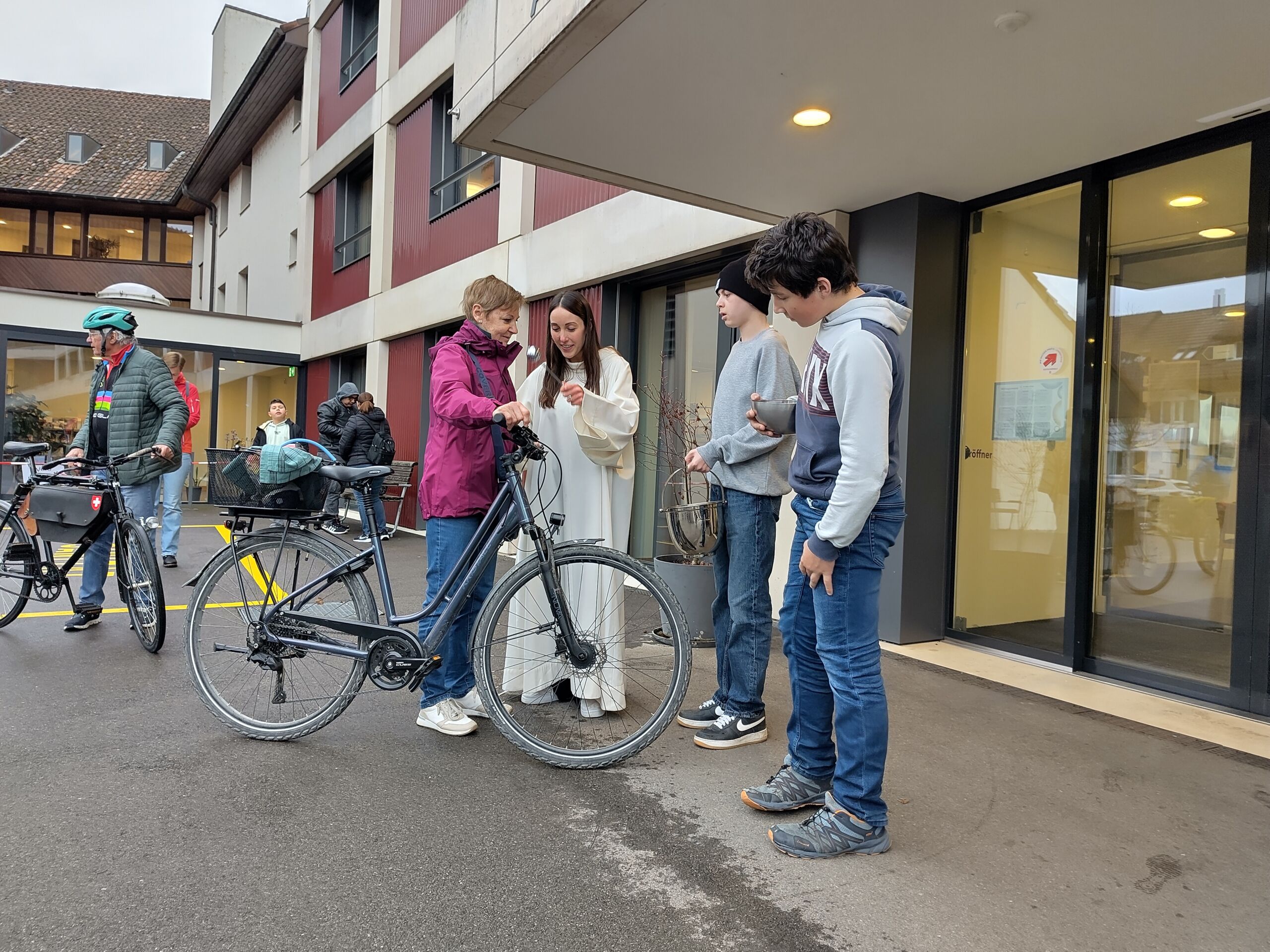 Im Anschluss wurden zunächst die Rollatoren und Menschen im Andachtsraum gesegnet. Alle anderen Fahrzeuge und deren Inhaber erhielten draussen vor dem Haupteingang den Segen von Aline Mumbauer. Unterstützung fand sie dabei von zwei Jugendlichen aus dem Religionsunterricht. Es fanden sich nicht nur alte und neue Velos und Rollatoren ein, sondern auch Rollstühle, ein Scooter und ein Hoverboard. Ein Besucher hatte sogar ein altes Militärvelo dabei. Damit der Segen auch länger anhält, erhielten alle Teilnehmer zusätzlich einen Sticker mit dem Aufdruck «Mit allen Wassern gewaschen, auch mit Weihwasser».