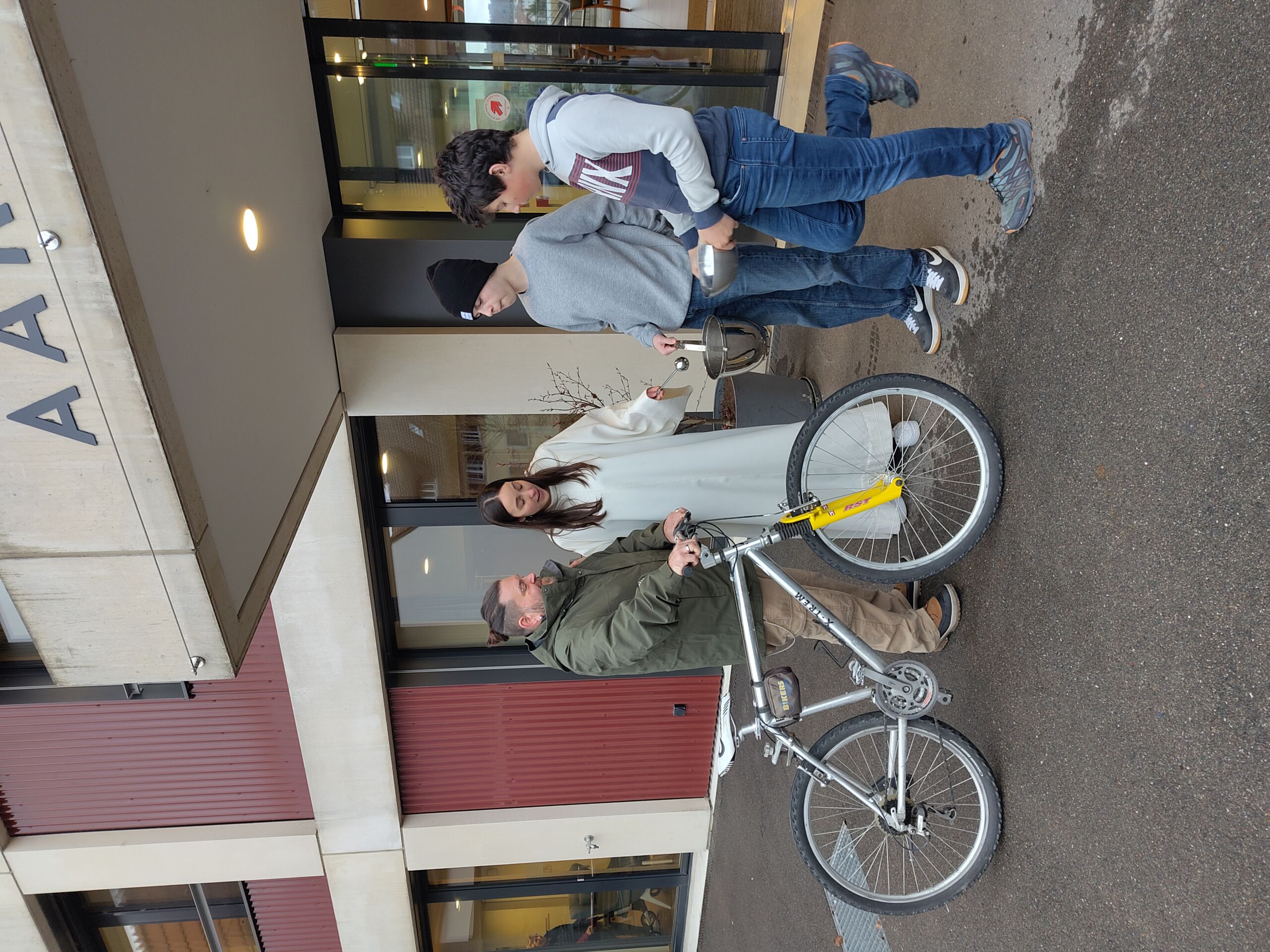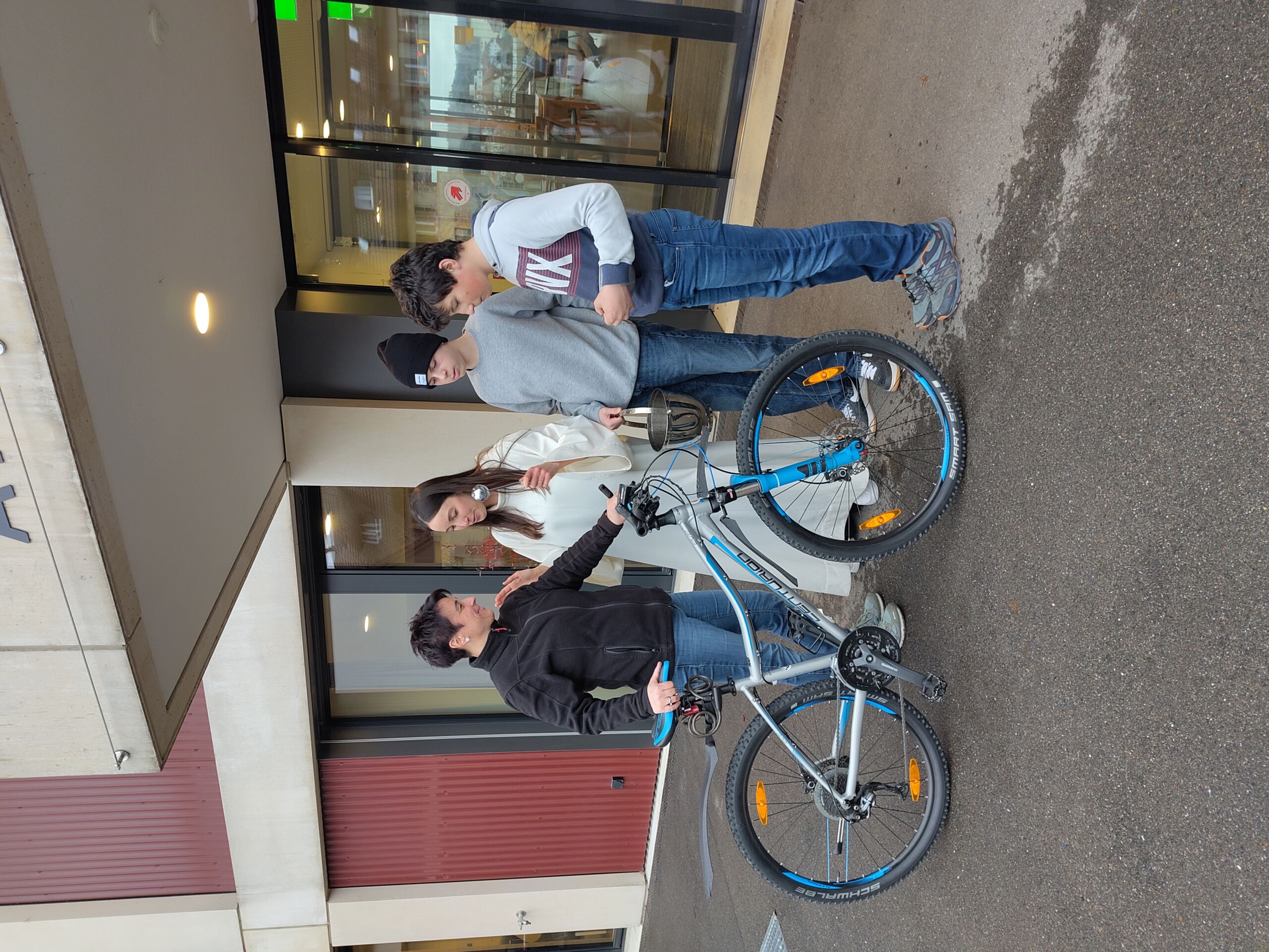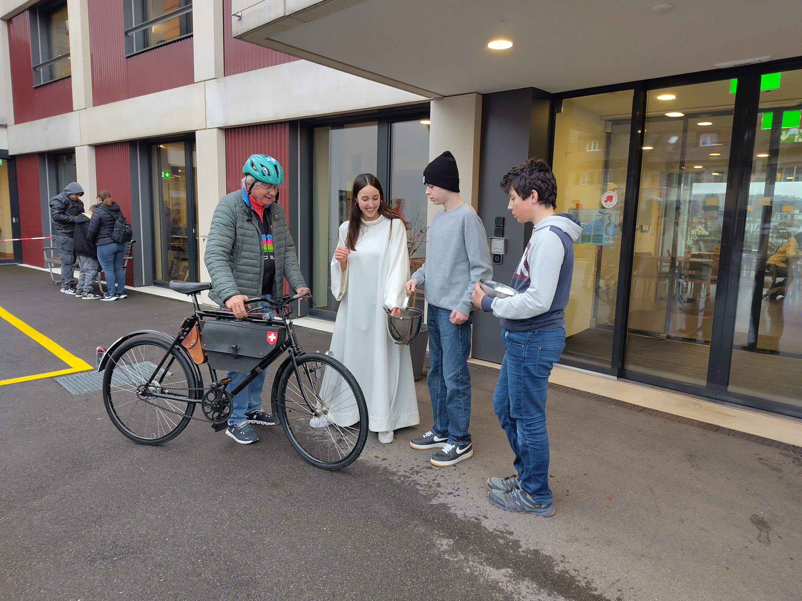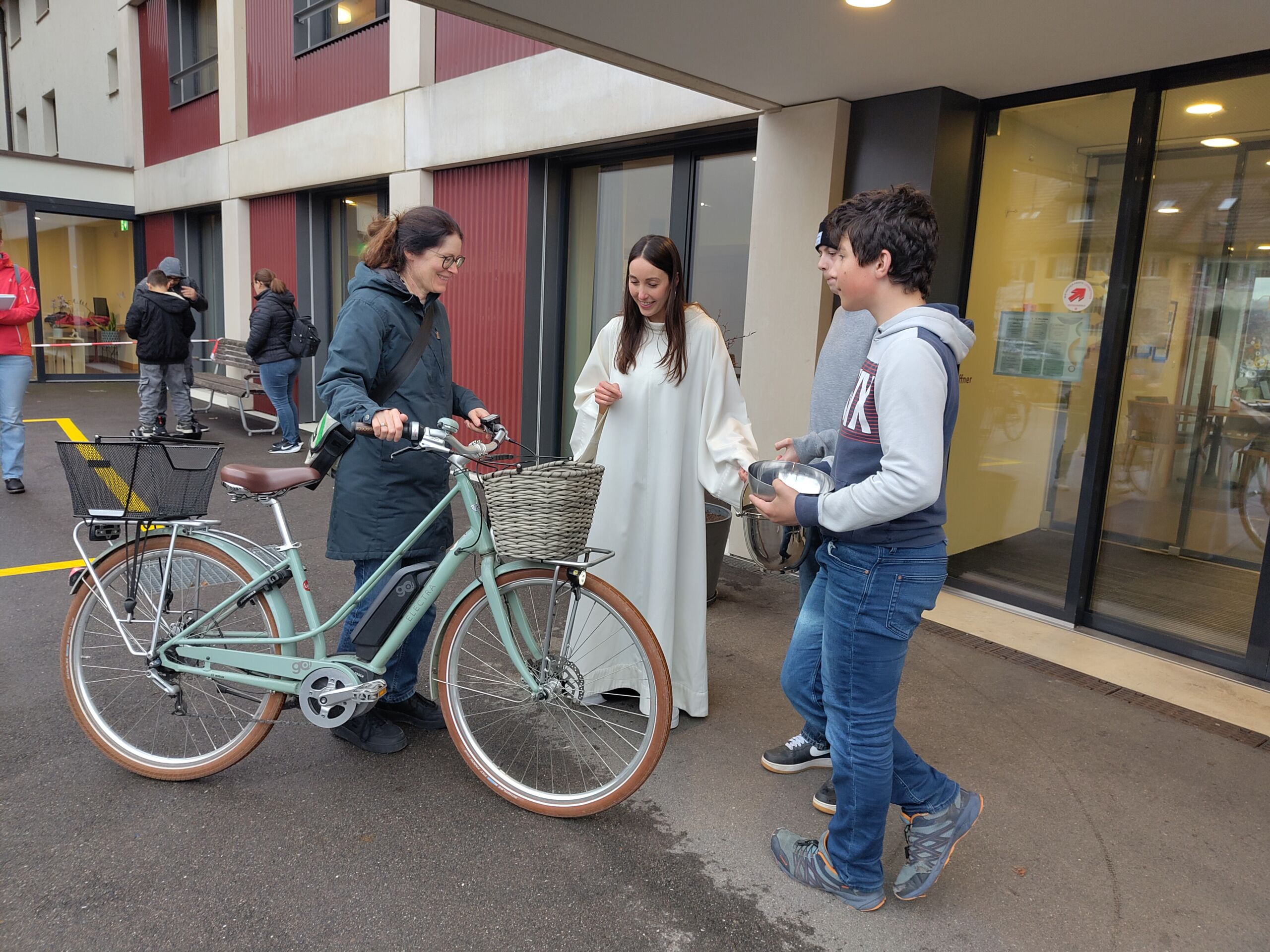 Im Anschluss wurden zunächst die Rollatoren und Menschen im Andachtsraum gesegnet. Alle anderen Fahrzeuge und deren Inhaber erhielten draussen vor dem Haupteingang den Segen von Aline Mumbauer. Unterstützung fand sie dabei von zwei Jugendlichen aus dem Religionsunterricht. Es fanden sich nicht nur alte und neue Velos und Rollatoren ein, sondern auch Rollstühle, ein Scooter und ein Hoverboard. Ein Besucher hatte sogar ein altes Militärvelo dabei. Damit der Segen auch länger anhält, erhielten alle Teilnehmer zusätzlich einen Sticker mit dem Aufdruck «Mit allen Wassern gewaschen, auch mit Weihwasser».