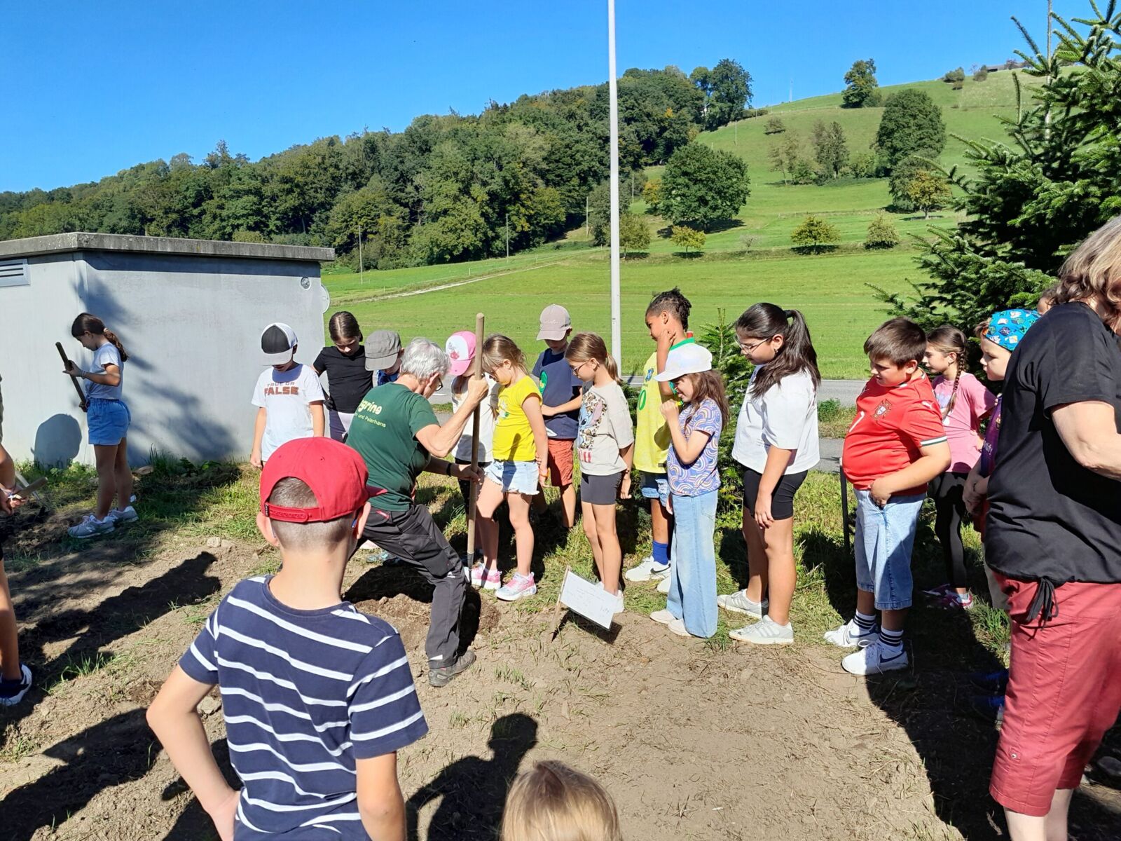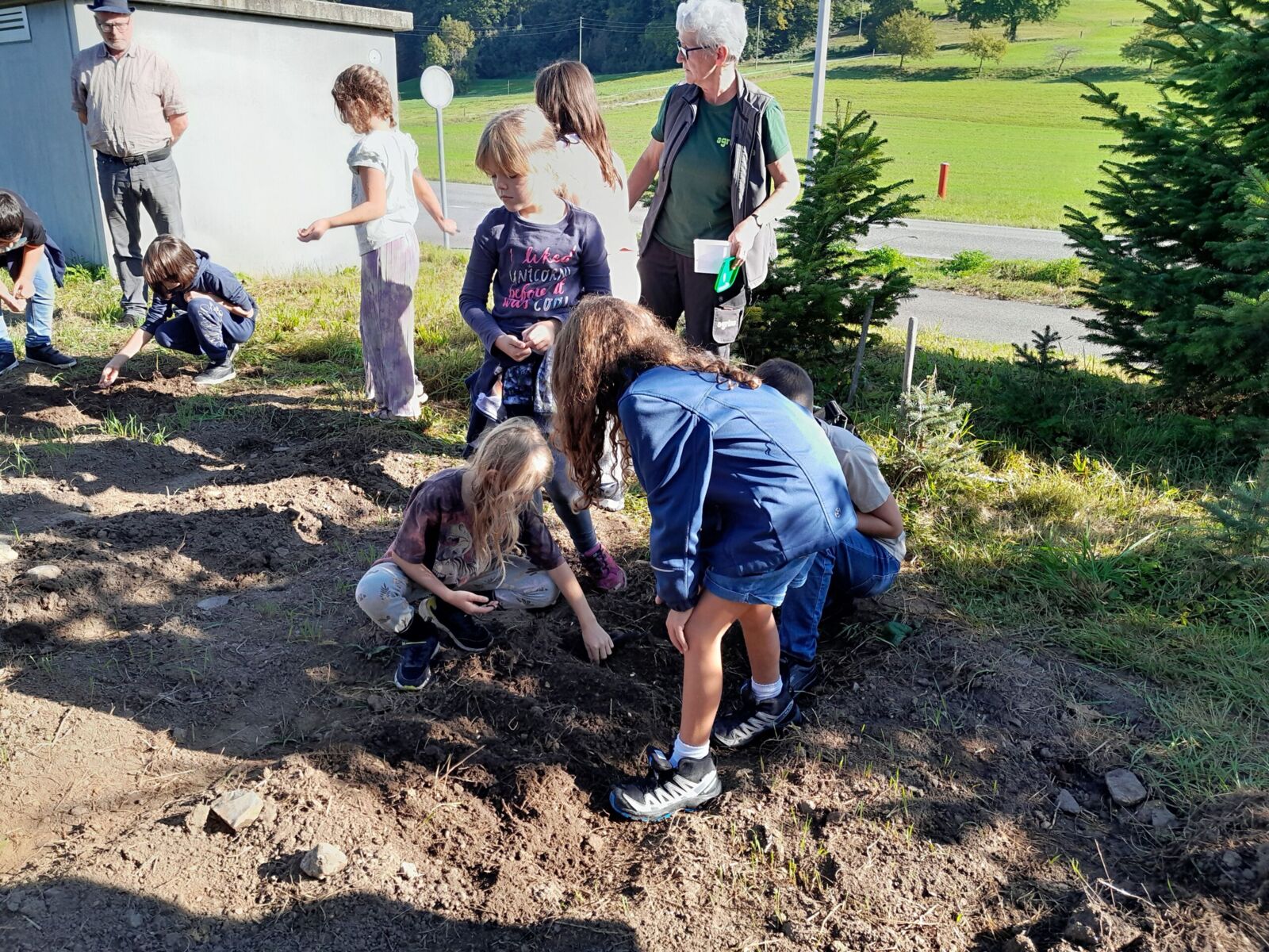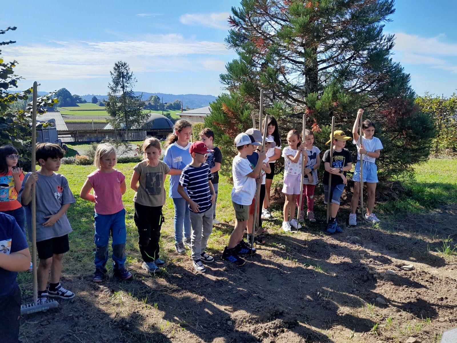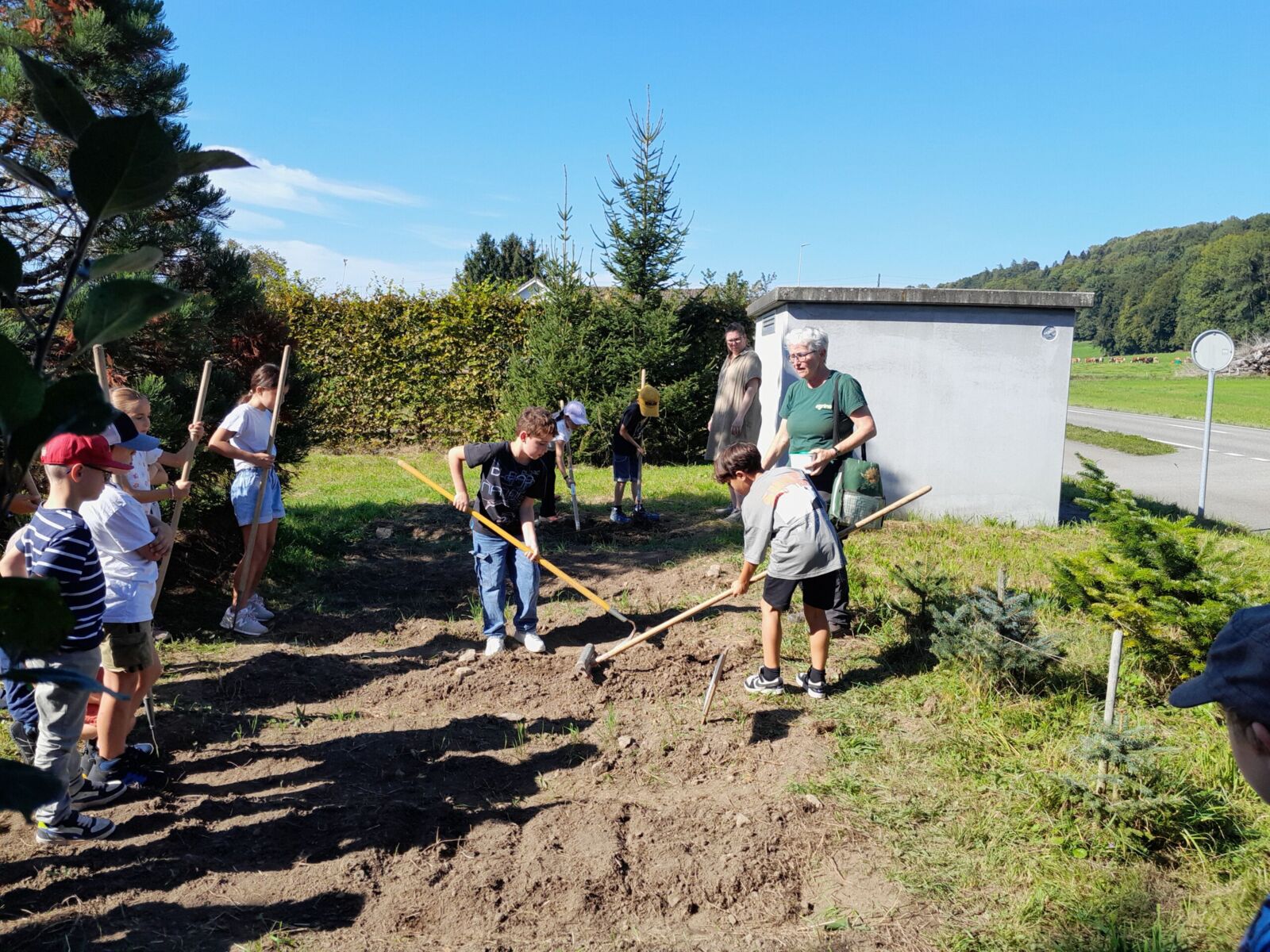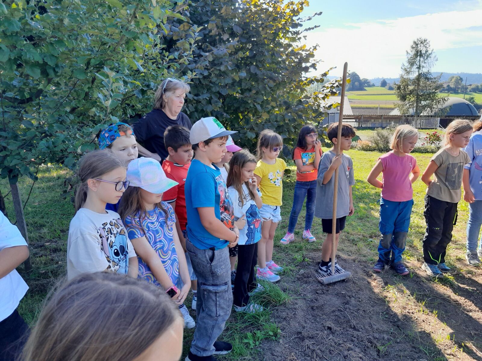 Das Korn auf dem Feld selber säen, den Boden dazu mit Gartengeräten bereit machen, da brauchte es viele Hände. Damit das Korn wachsen und gedeihen kann, braucht es guten Boden, Wasser, Licht, Wärme, gute Pflege und Gottes Segen. Diese Aussage beeindruckte die Kinder.