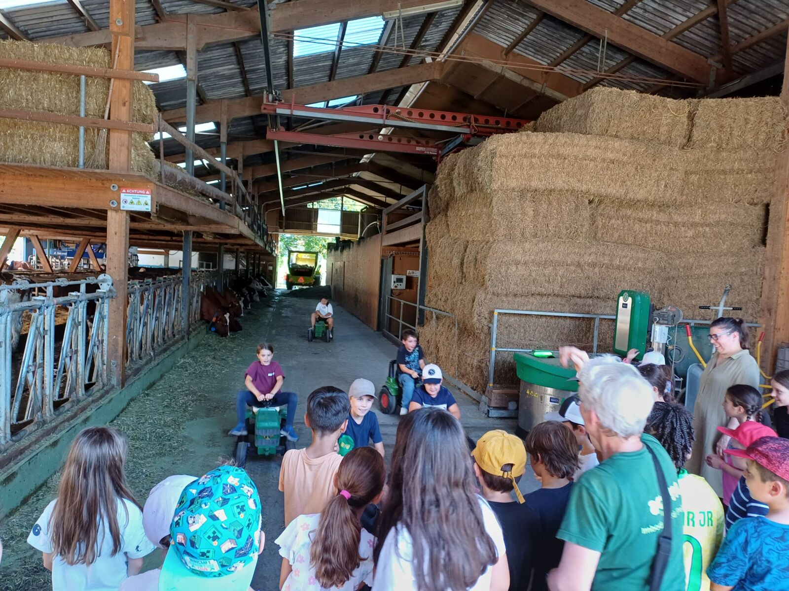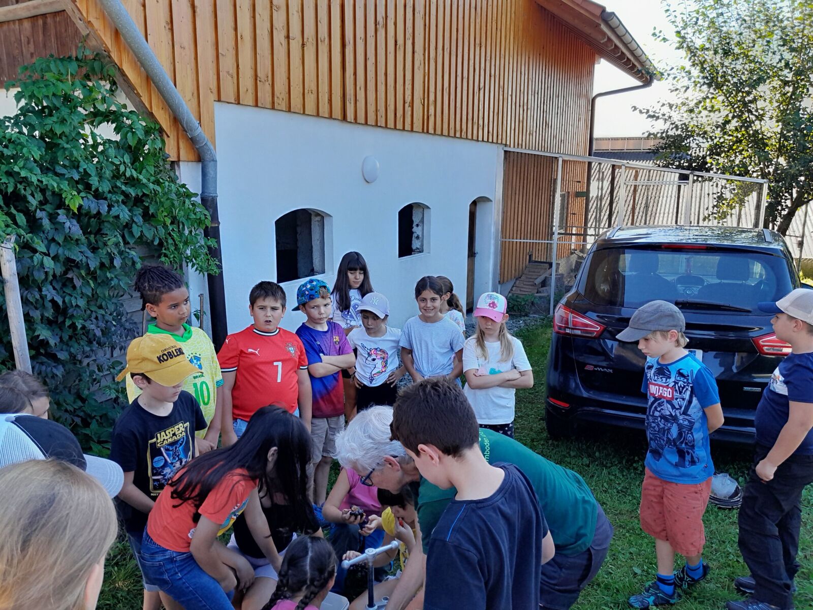 Bis das Brot gebacken war, besichtigten die Kinder mit Vroni Peterhans den Bauernhof. Einen Sprung in den Heuhaufen, die Kühe und Pferde füttern und die vielen kleinen Kälber streicheln, das war toll. Auch die Melkmaschine und die grossen Traktoren bestaunten die Kinder.