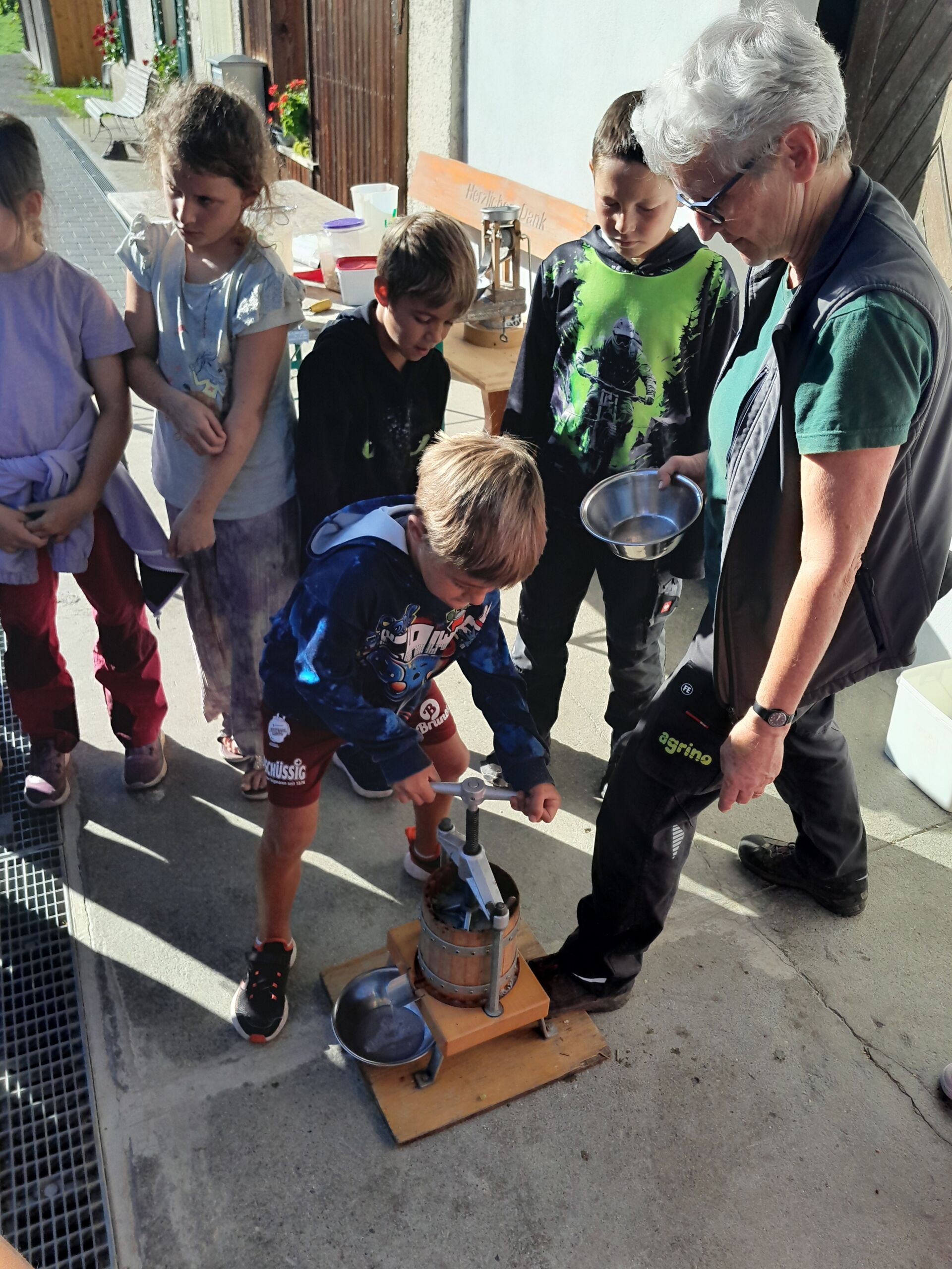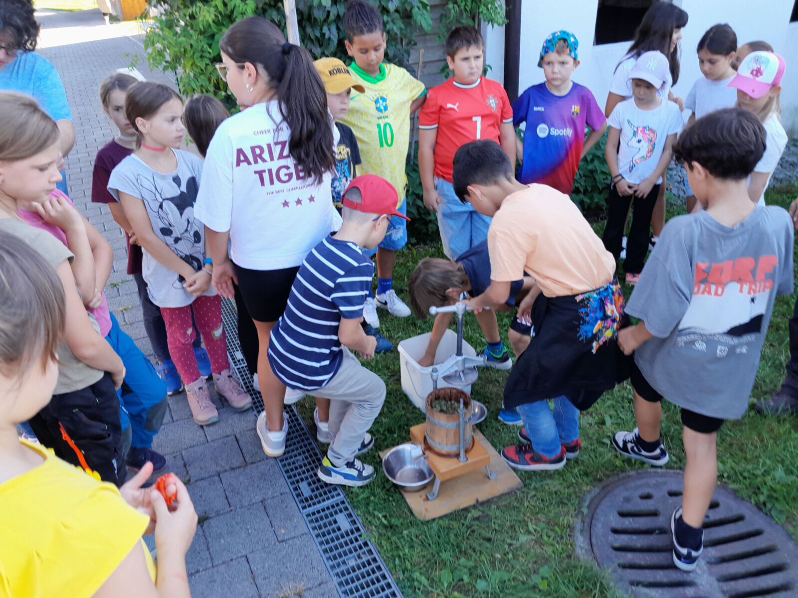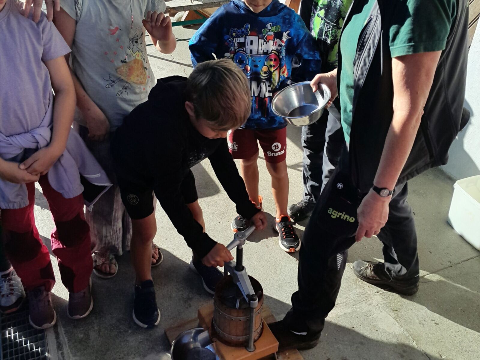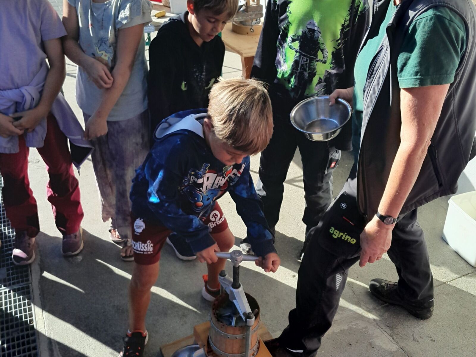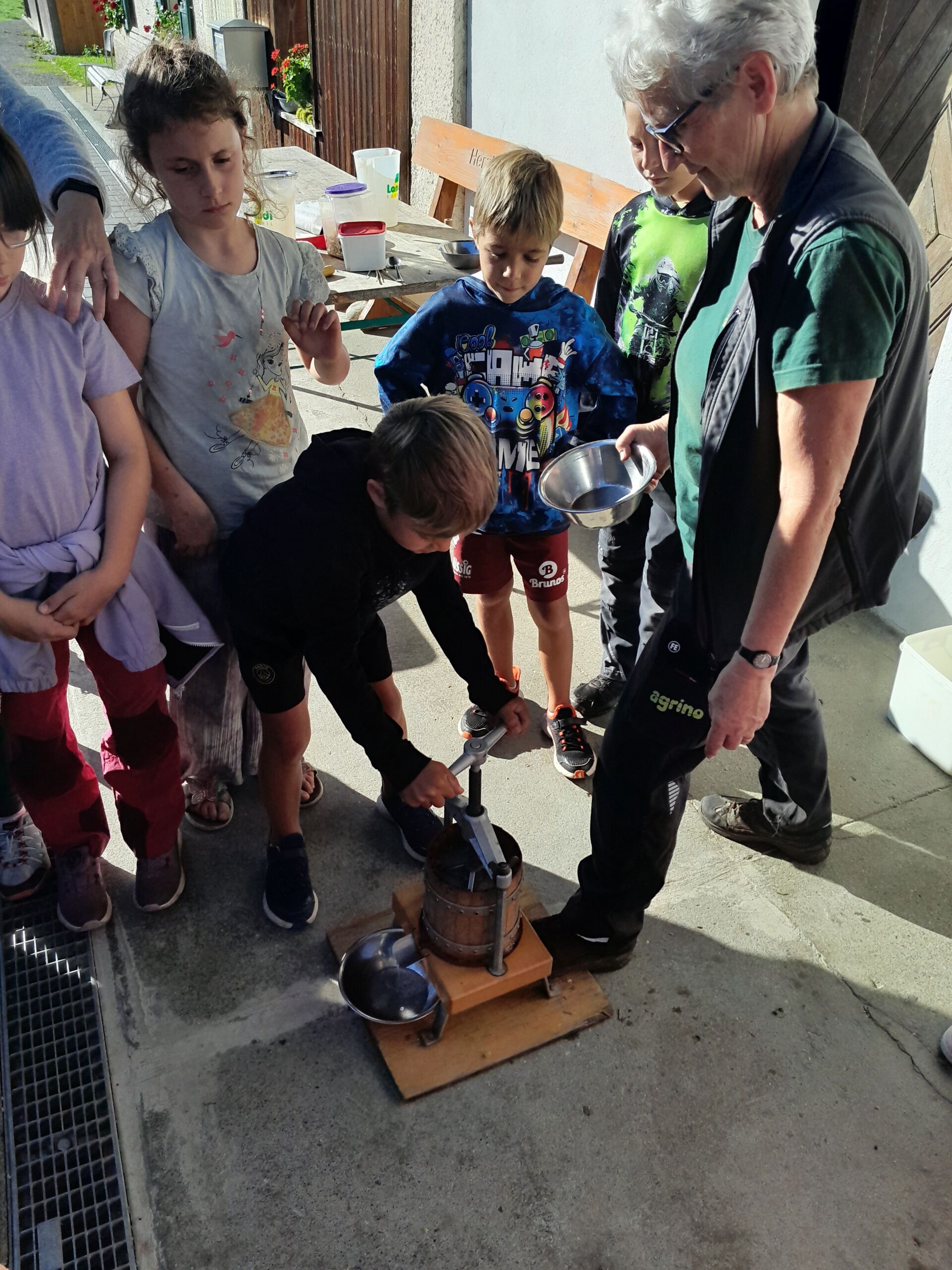 Von der Weintraube zum Traubensaft. Da wurden Trauben vom Weinstock gepflückt, Traubenzucker, Trauben und getrocknete Weinbeeren genascht und Weintrauben in die Presse gelegt. Die Kinder erlebten, wie es mit viel Kraft und Geduld einen süssen, fruchtigen Traubensaft gibt. Den Traubensaft geniessen und gemeinsam auf die bevorstehende Erstkommunion anstossen, war für die Kinder etwas spezielles.