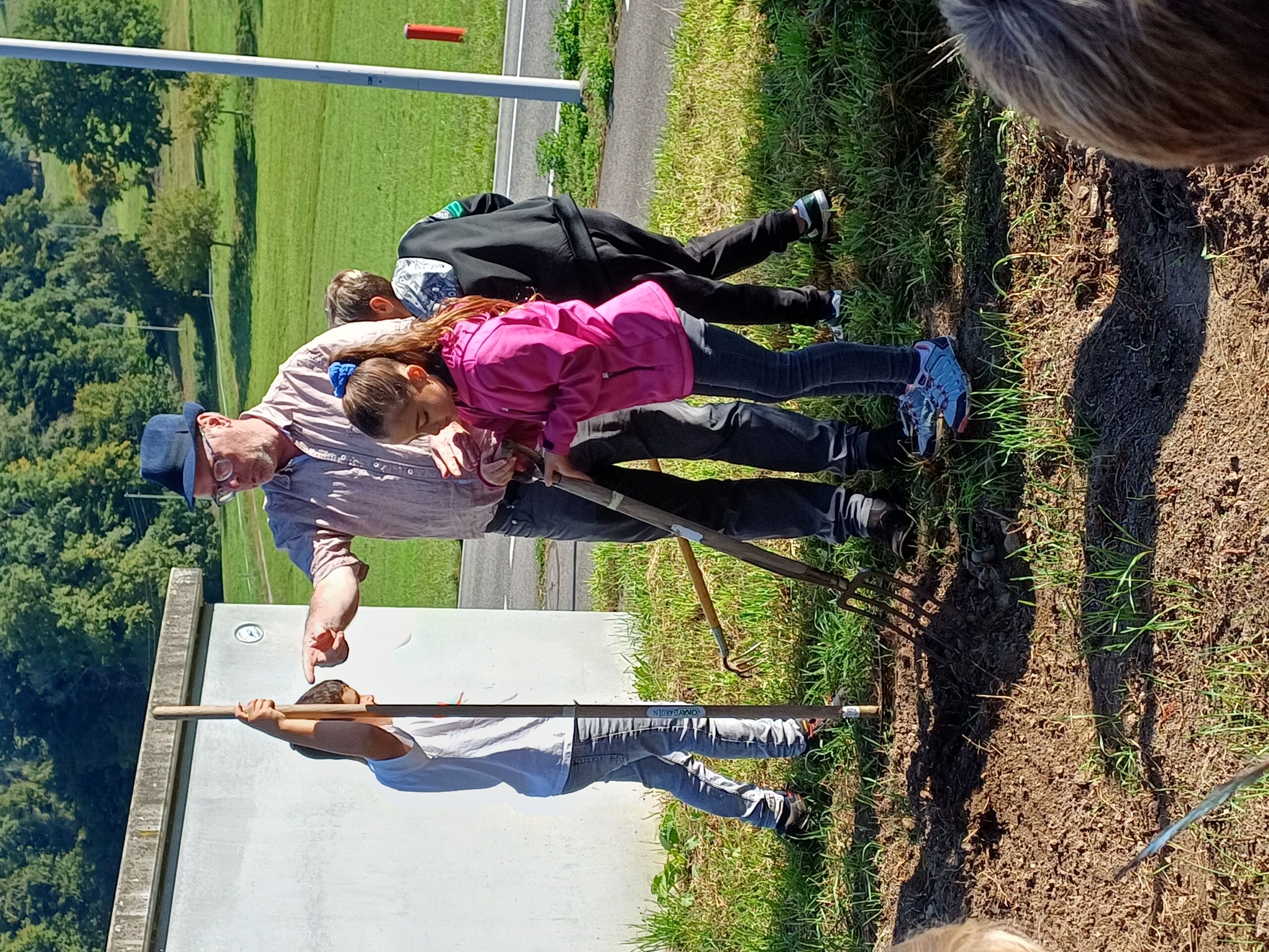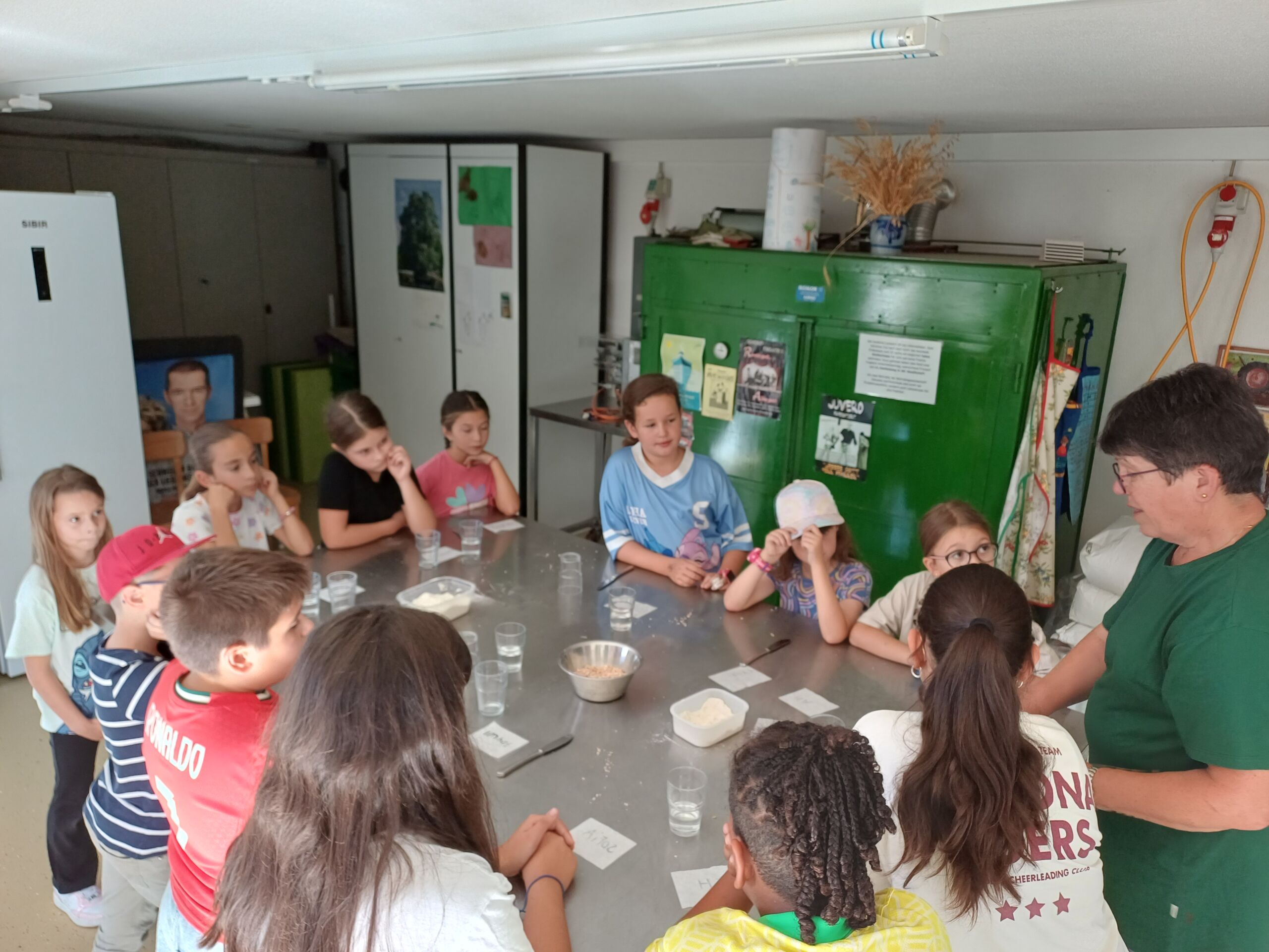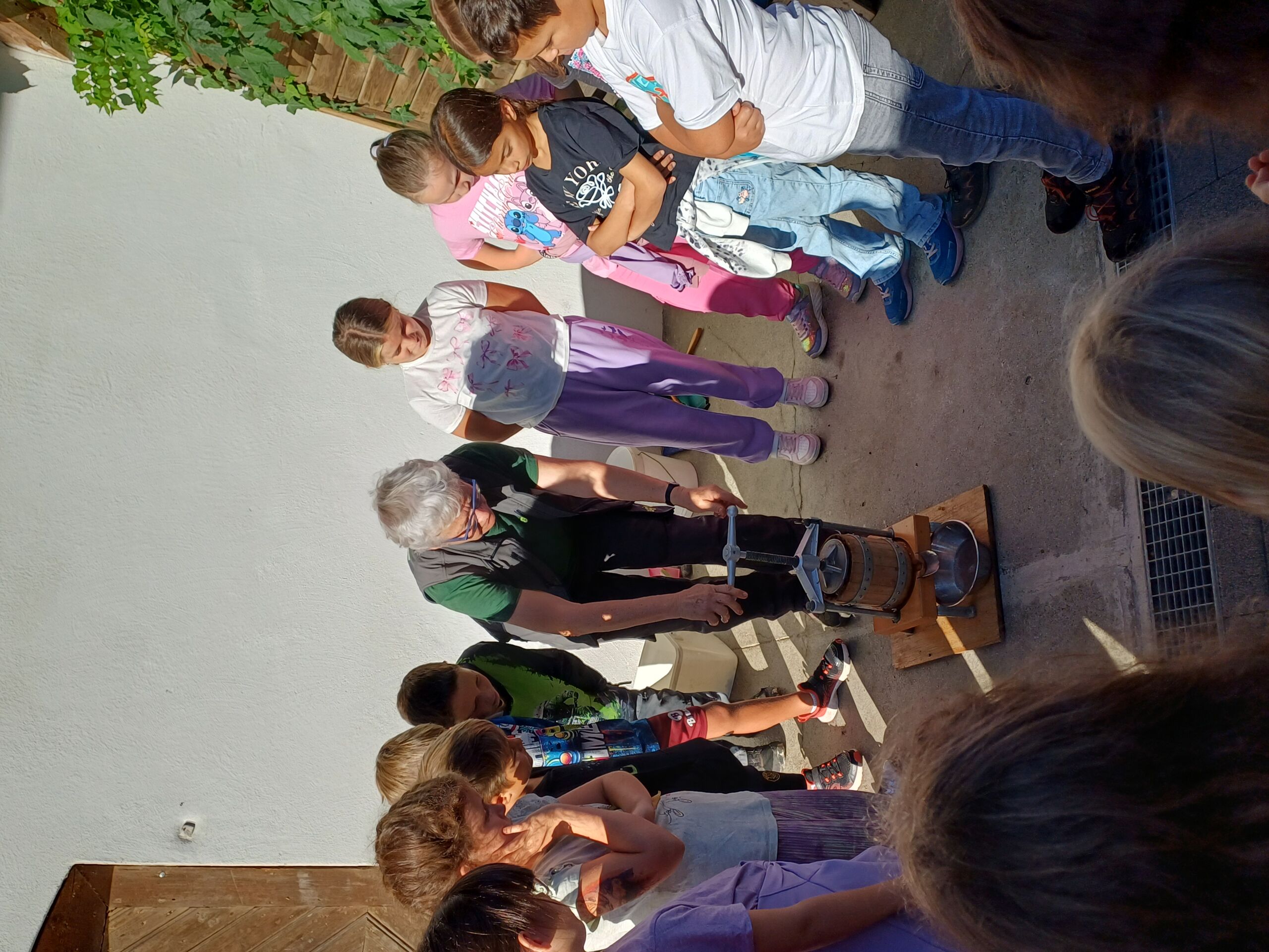 Vroni Peterhans zeigte ihnen nicht nur, was es auf so einem grossen Bauernhof alles zu tun gibt und hat, sondern auch wie aus Getreidekörnern Brot und aus Weintrauben Wein wird. Die Kinder durften auch selber mit Hand anlegen, vieles ausprobieren und am Ende sogar selbst gebackenes Brot mit nach Hause nehmen.