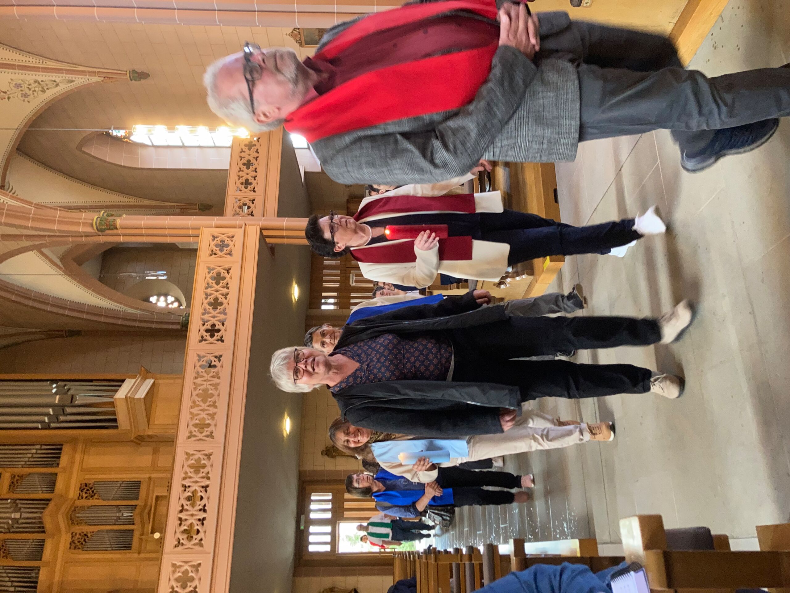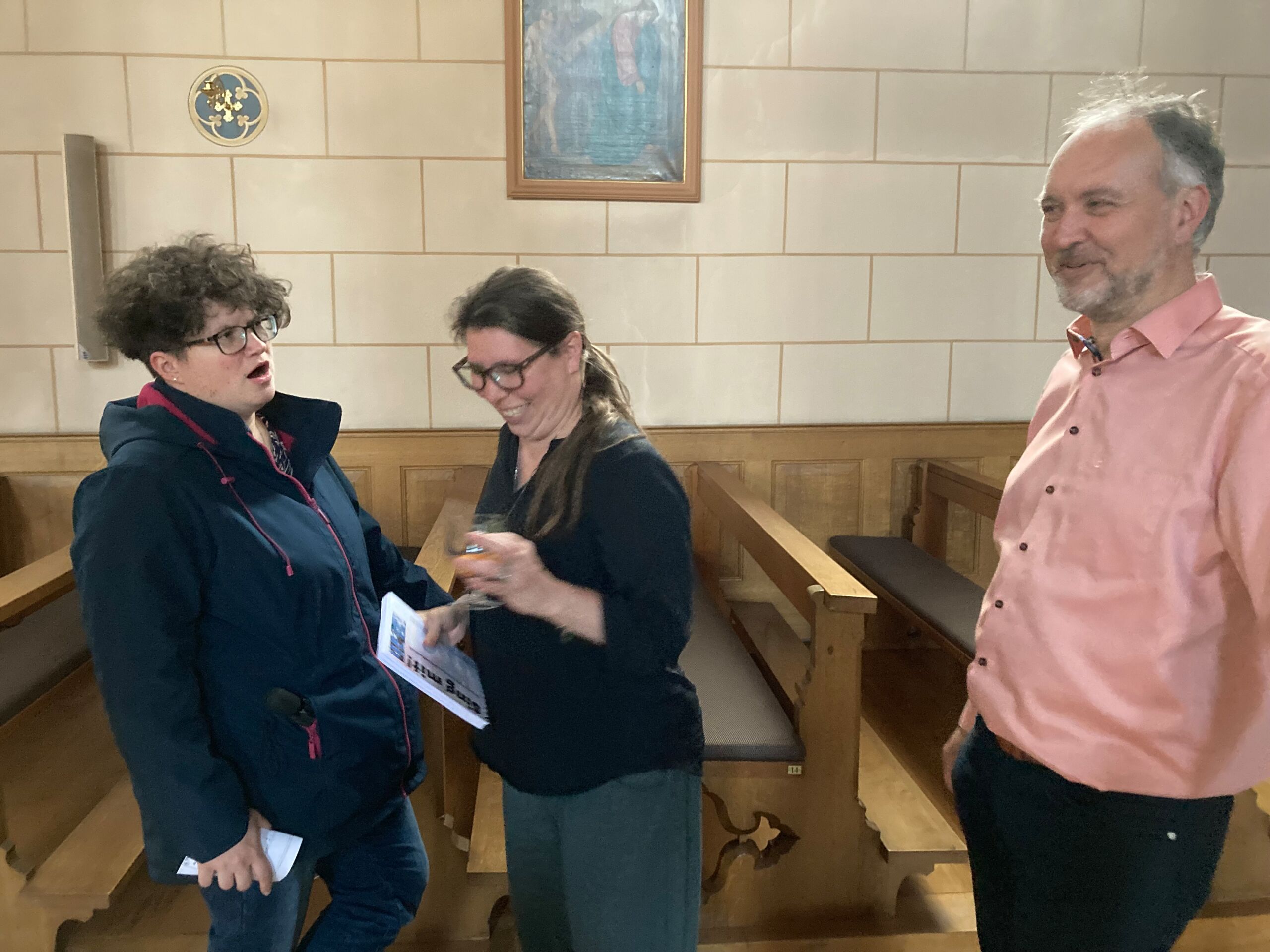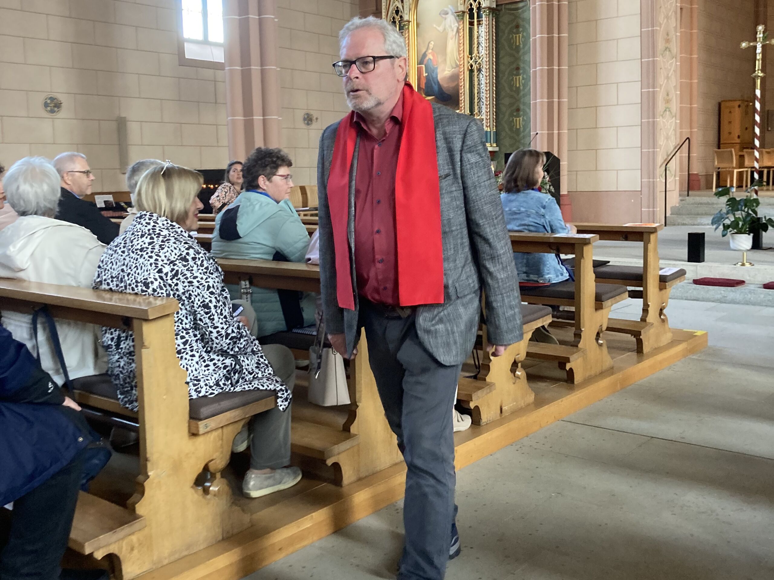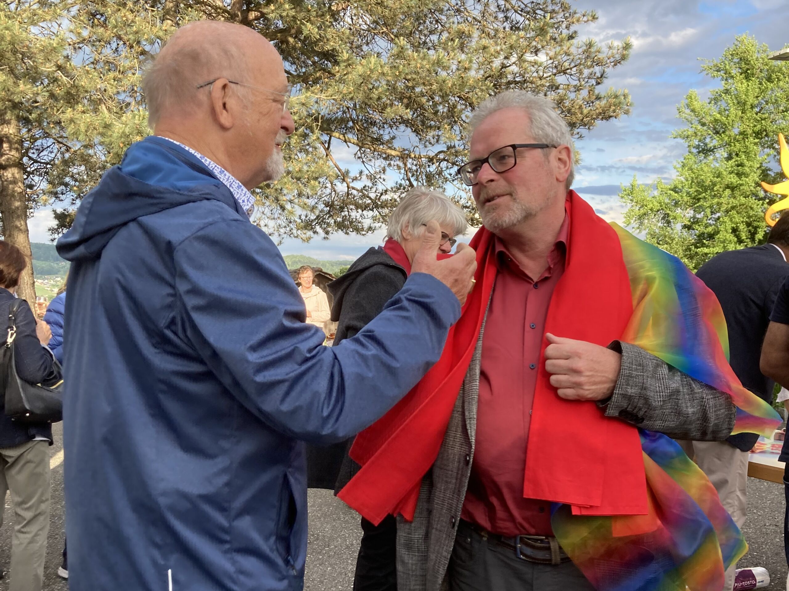 Überhaupt war die Stimmung toll. Die Impulse und Gebete der Seelsorgenden und der Lektor:innen/ Freiwilligen strahlten Dankbarkeit und Wärme aus. Und auch die Botschaft war eine pfingstliche: Zusammenstehen auch auf Durststrecken, Träume behalten, bunt und regenbogenfarben für ALLE Menschen da sein. Dazu verband Peter Zürn den grossen Sieg von Nemo am Eurovision 2024 mit der Geisteshaltung des Pastoralraums Aare-Rhein und legte sich dazu in Solidarität für Menschen, die oftmals ausgeschlossen werden, einen rosa Schal um und einen Regenbogenmantel obendrauf.
