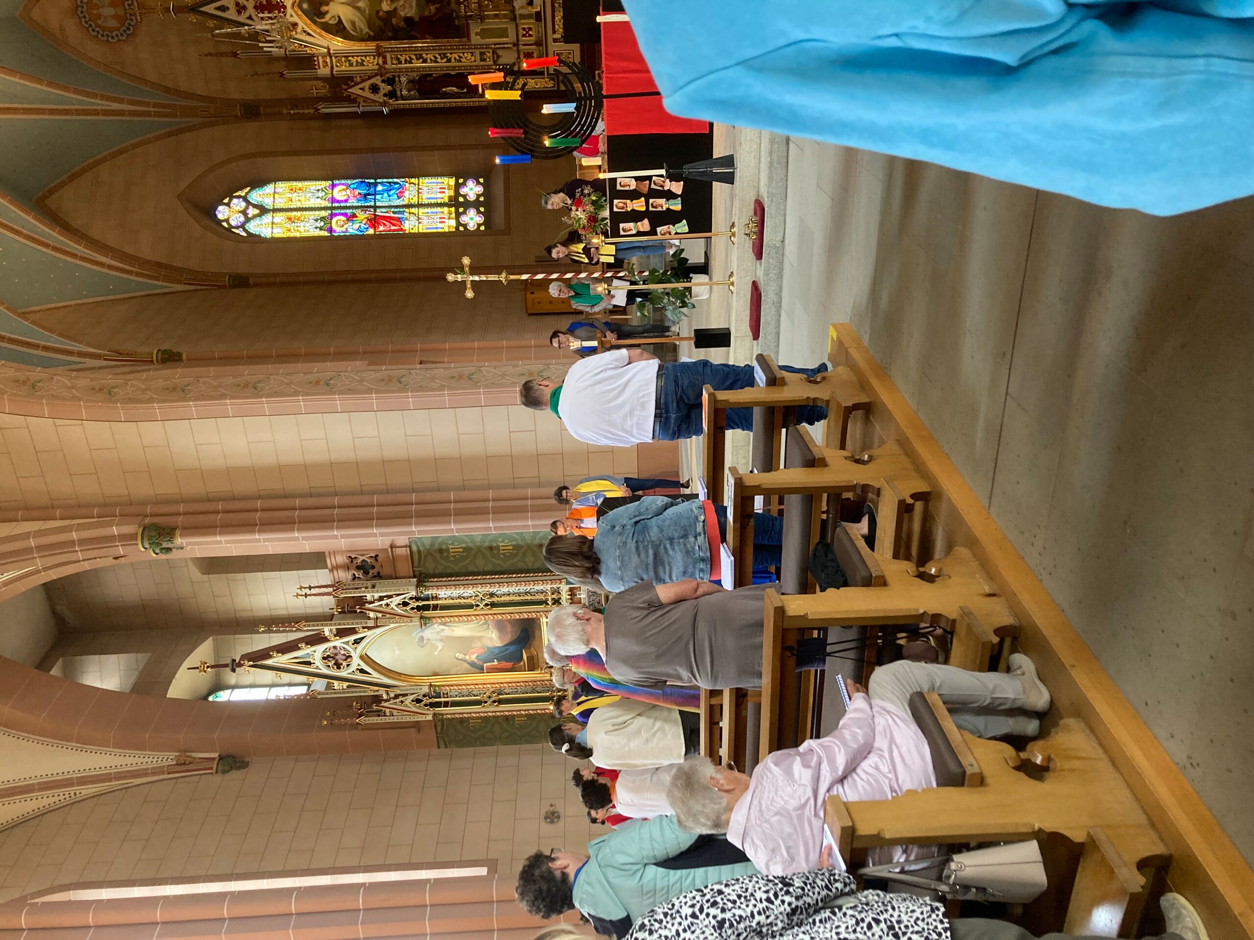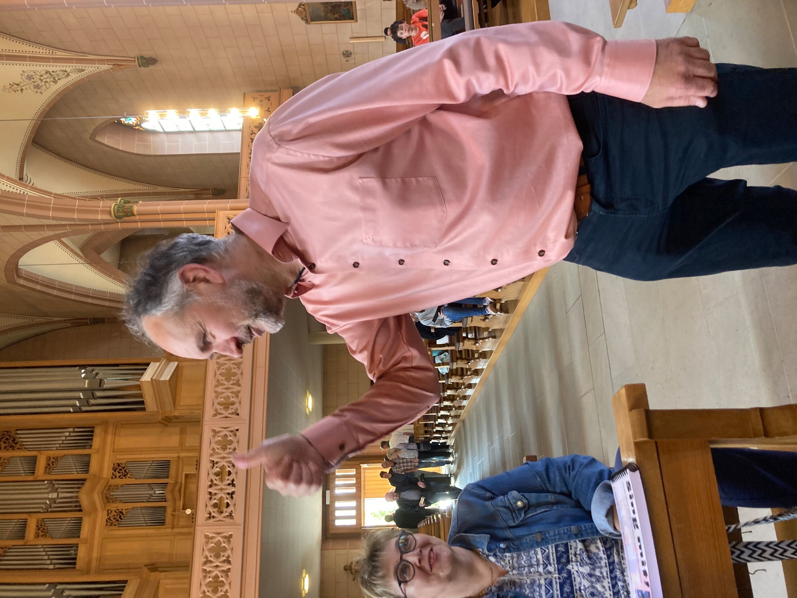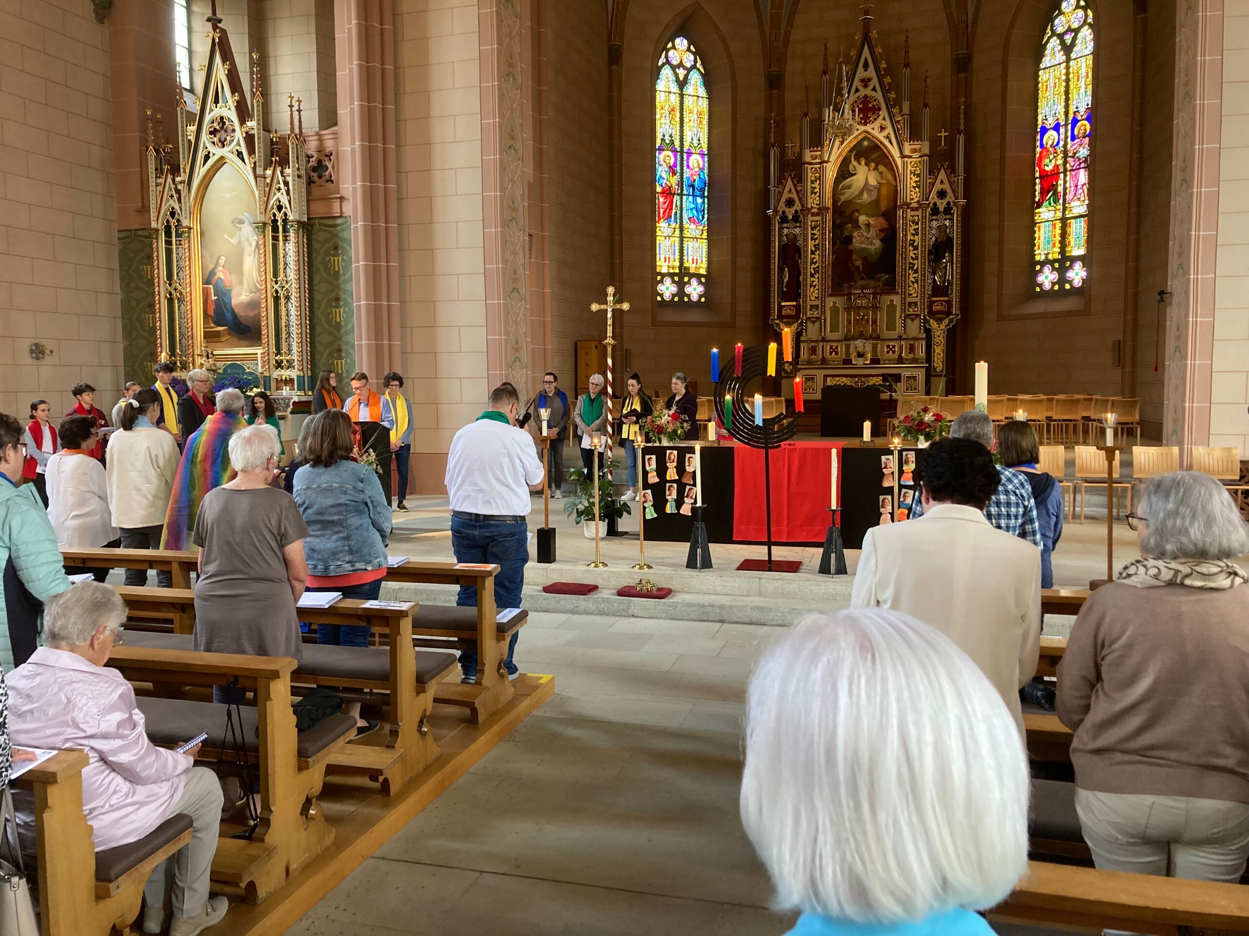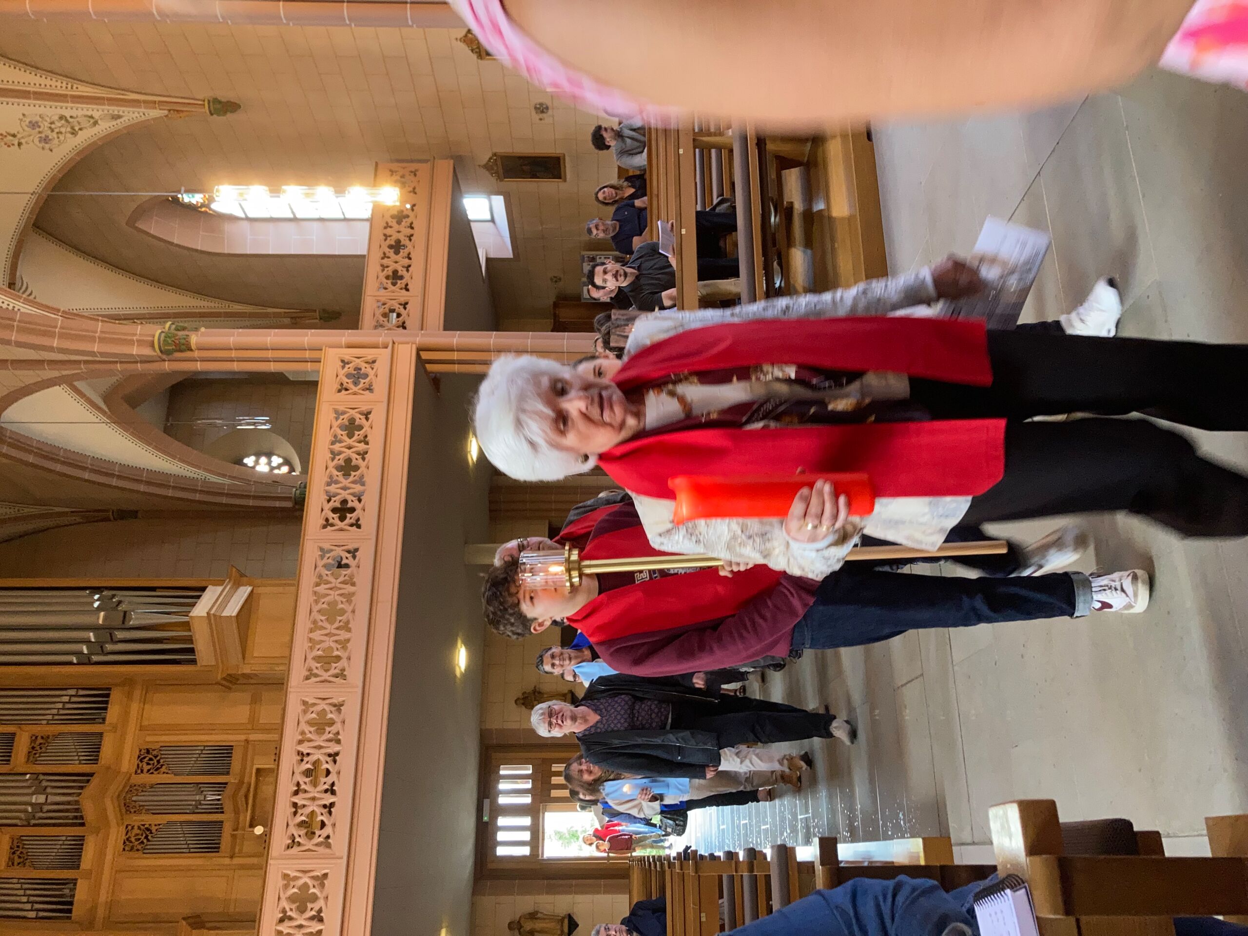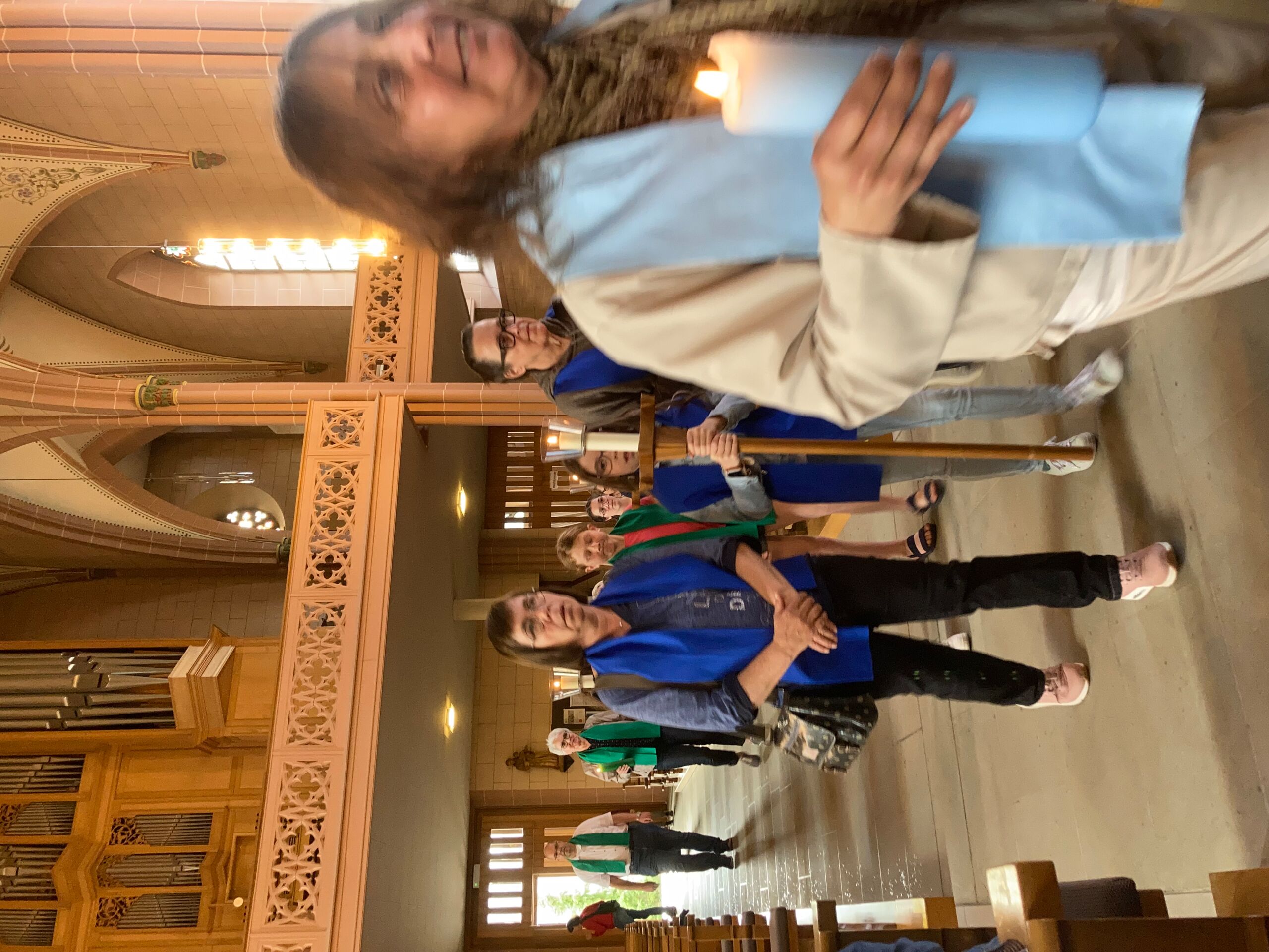 Überhaupt war die Stimmung toll. Die Impulse und Gebete der Seelsorgenden und der Lektor:innen/ Freiwilligen strahlten Dankbarkeit und Wärme aus. Und auch die Botschaft war eine pfingstliche: Zusammenstehen auch auf Durststrecken, Träume behalten, bunt und regenbogenfarben für ALLE Menschen da sein. Dazu verband Peter Zürn den grossen Sieg von Nemo am Eurovision 2024 mit der Geisteshaltung des Pastoralraums Aare-Rhein und legte sich dazu in Solidarität für Menschen, die oftmals ausgeschlossen werden, einen rosa Schal um und einen Regenbogenmantel obendrauf.