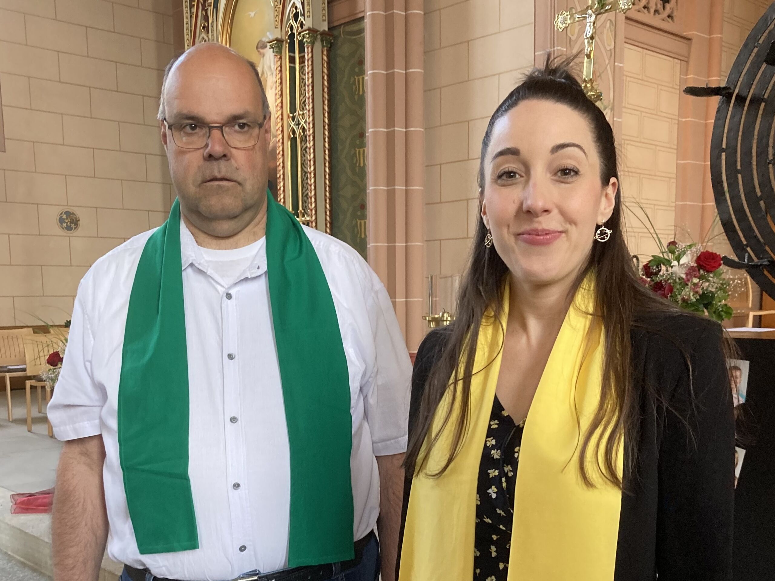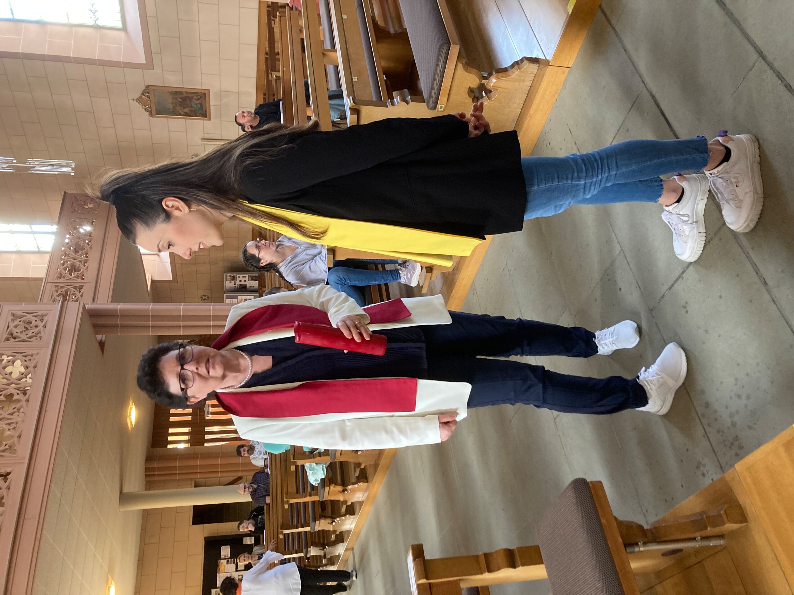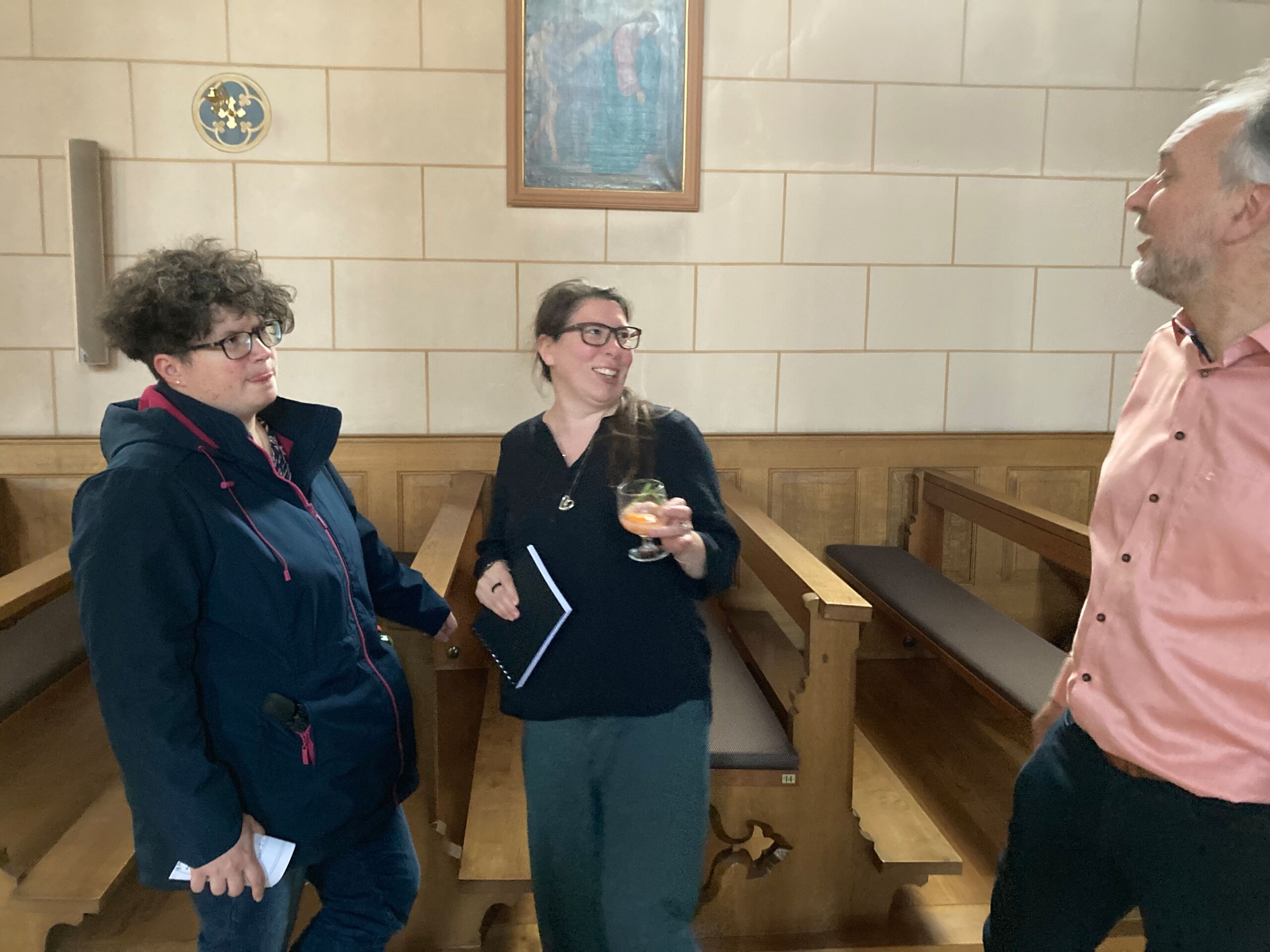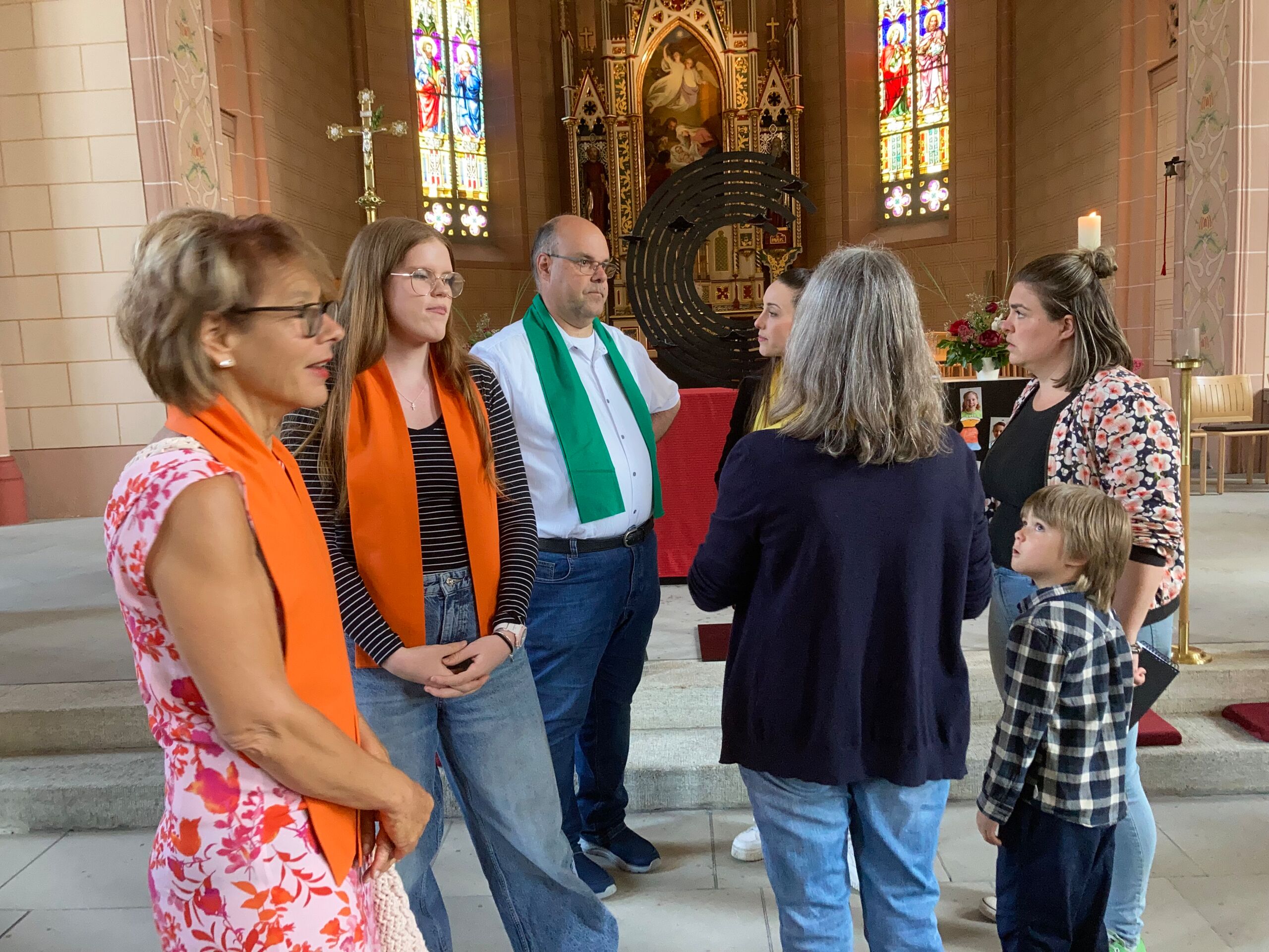 Überhaupt war die Stimmung toll. Die Impulse und Gebete der Seelsorgenden und der Lektor:innen/ Freiwilligen strahlten Dankbarkeit und Wärme aus. Und auch die Botschaft war eine pfingstliche: Zusammenstehen auch auf Durststrecken, Träume behalten, bunt und regenbogenfarben für ALLE Menschen da sein. Dazu verband Peter Zürn den grossen Sieg von Nemo am Eurovision 2024 mit der Geisteshaltung des Pastoralraums Aare-Rhein und legte sich dazu in Solidarität für Menschen, die oftmals ausgeschlossen werden, einen rosa Schal um und einen Regenbogenmantel obendrauf.