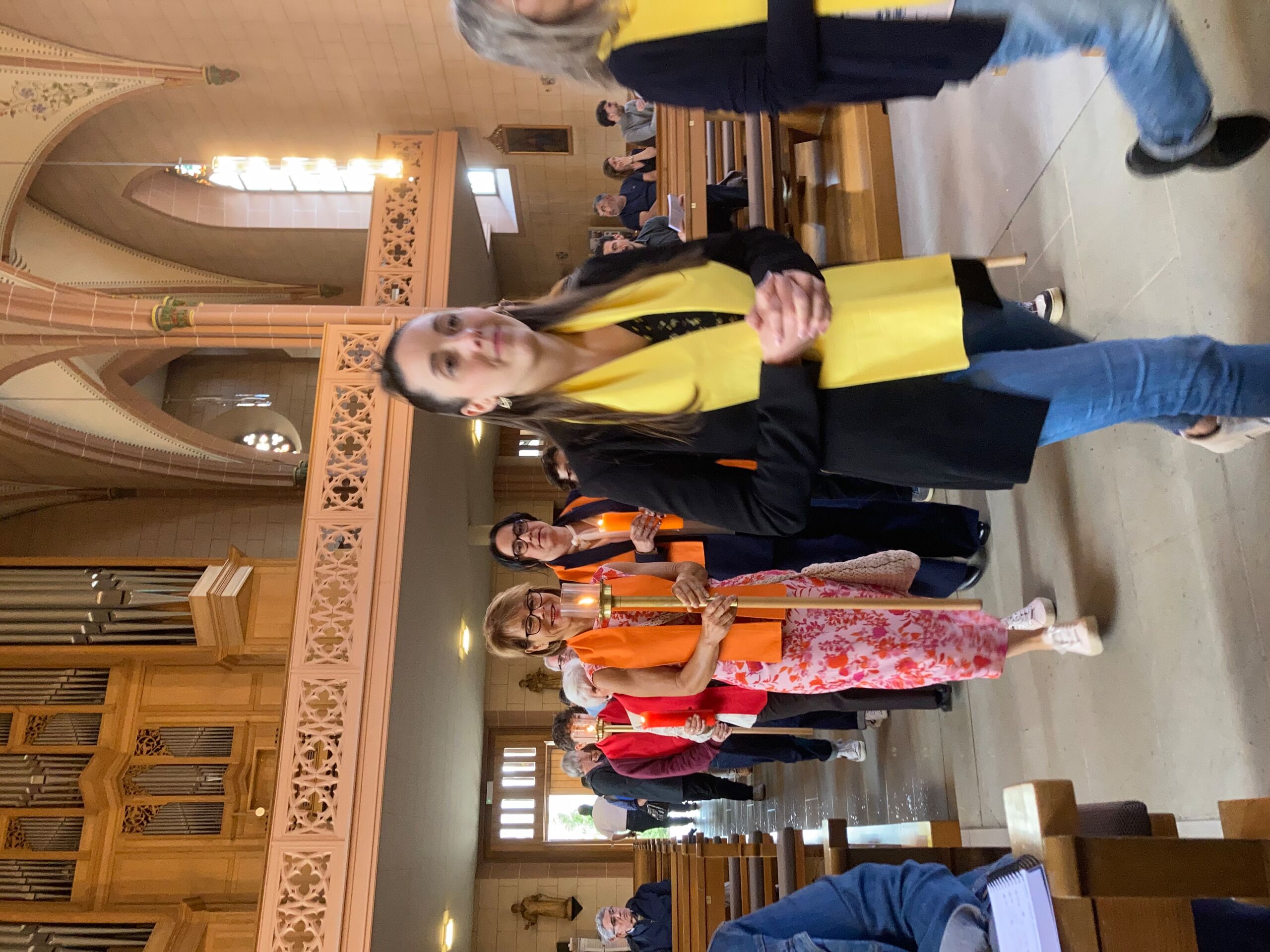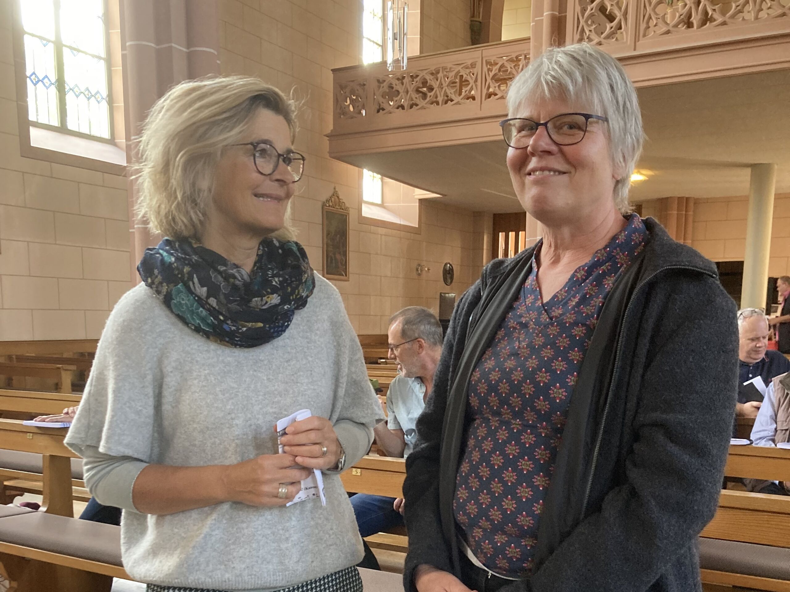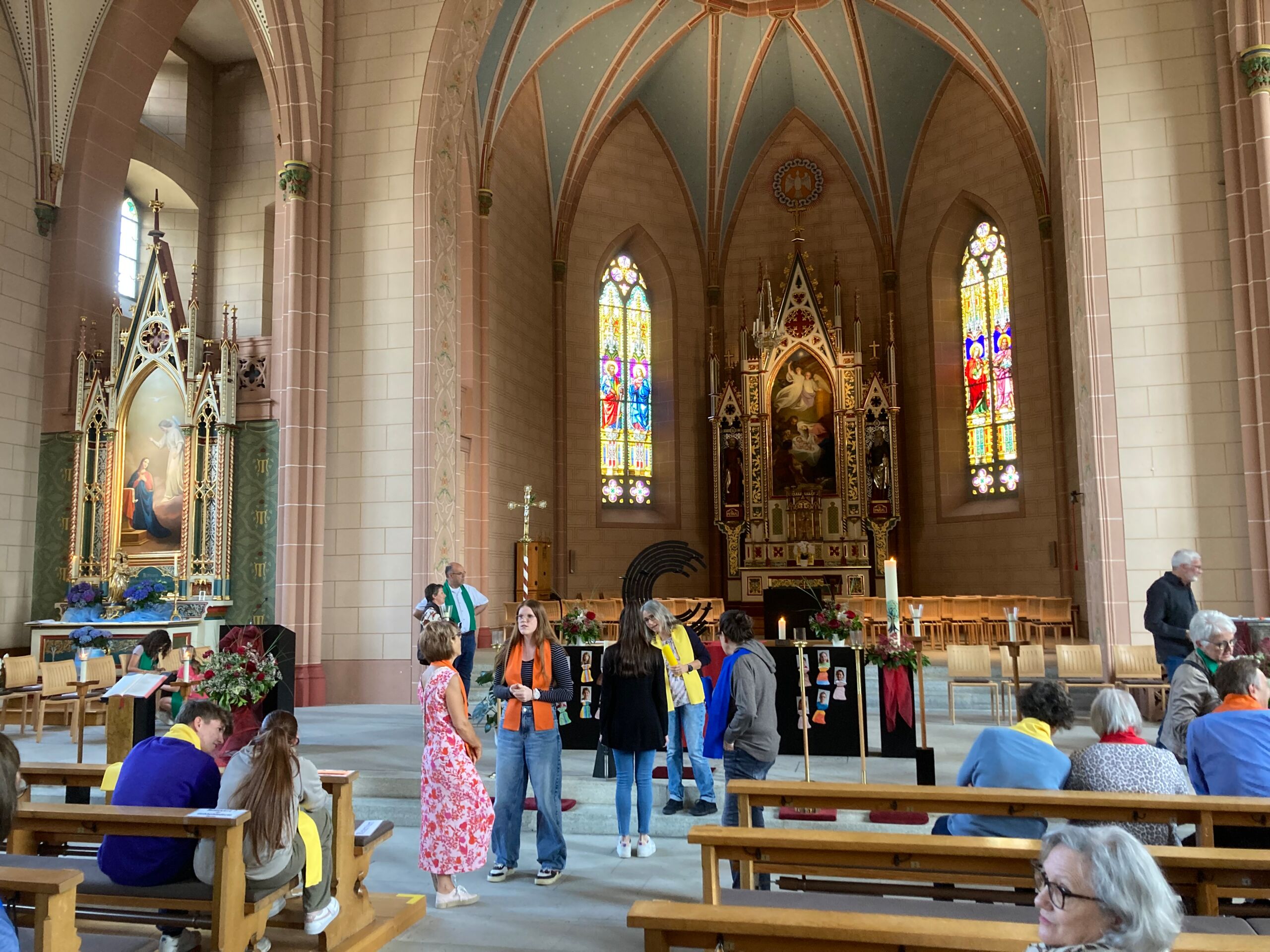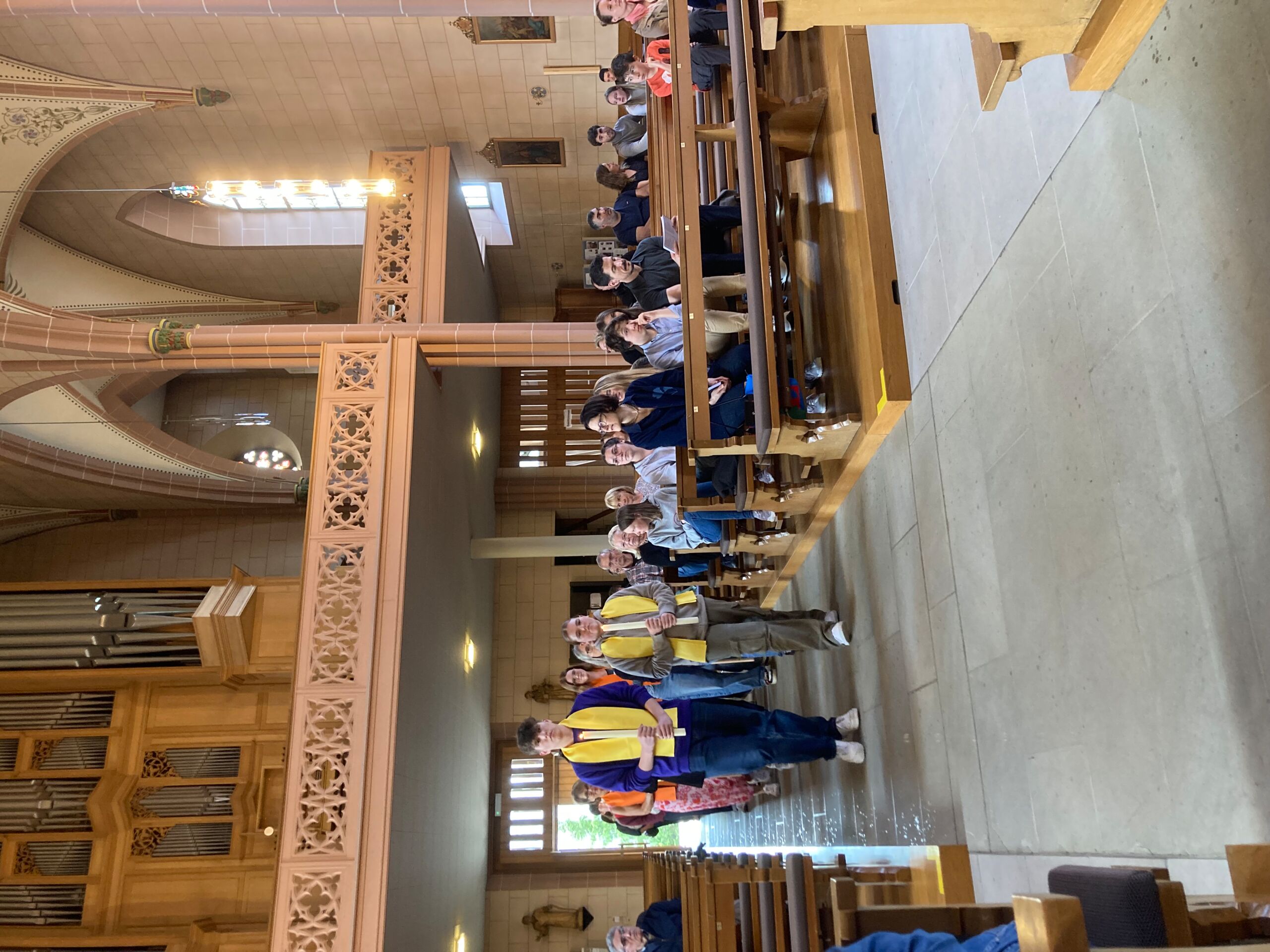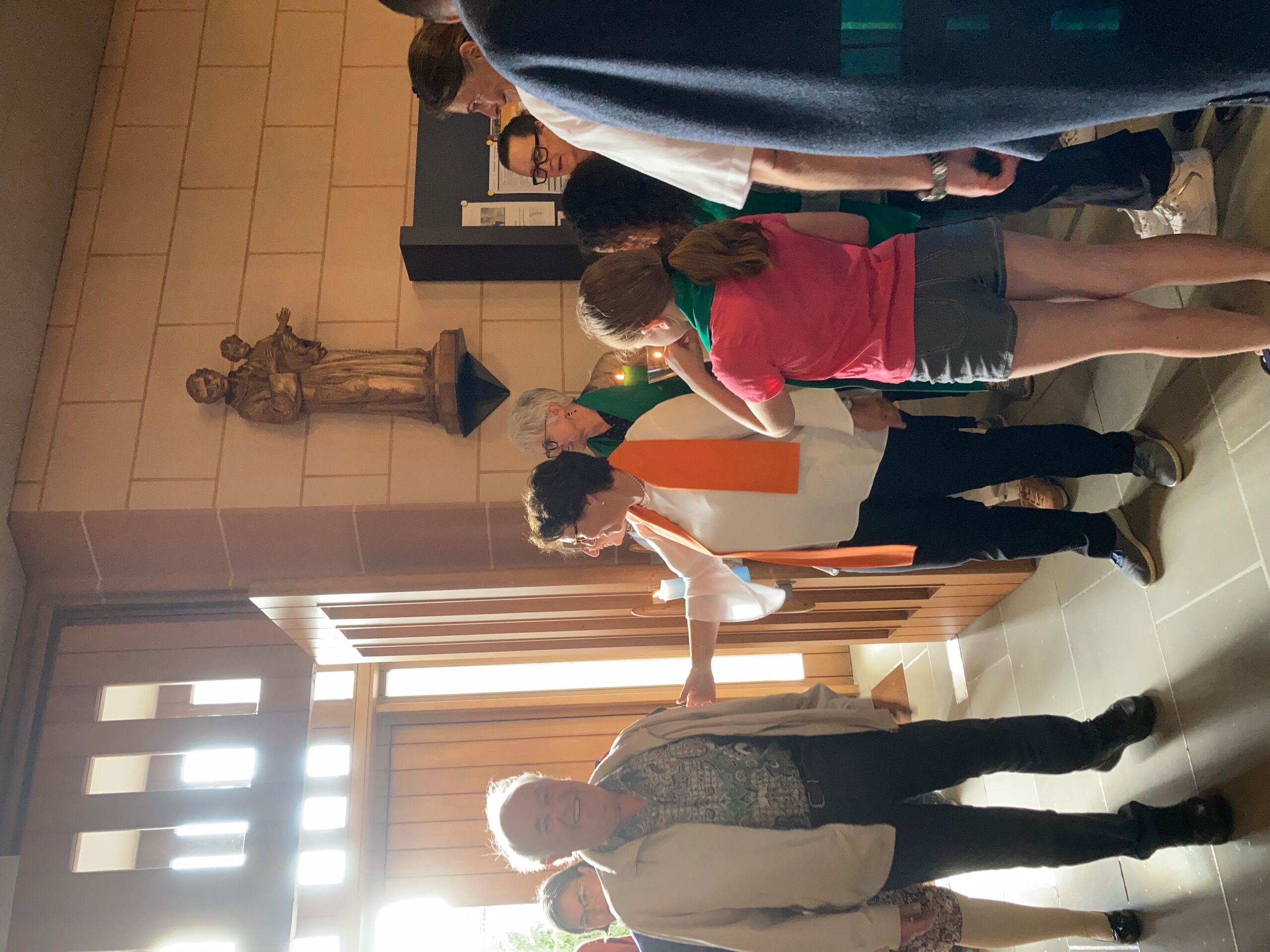 Überhaupt war die Stimmung toll. Die Impulse und Gebete der Seelsorgenden und der Lektor:innen/ Freiwilligen strahlten Dankbarkeit und Wärme aus. Und auch die Botschaft war eine pfingstliche: Zusammenstehen auch auf Durststrecken, Träume behalten, bunt und regenbogenfarben für ALLE Menschen da sein. Dazu verband Peter Zürn den grossen Sieg von Nemo am Eurovision 2024 mit der Geisteshaltung des Pastoralraums Aare-Rhein und legte sich dazu in Solidarität für Menschen, die oftmals ausgeschlossen werden, einen rosa Schal um und einen Regenbogenmantel obendrauf.