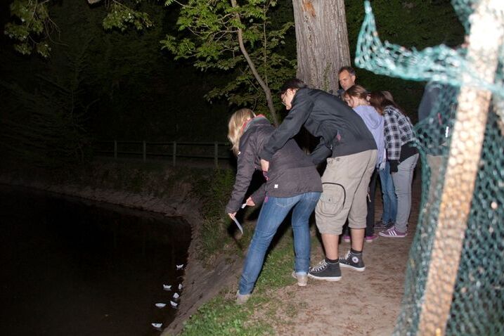 An verschiedenen Stationen wurden die Bilder betrachtet und durch entsprechende Impulse und Aktivitäten ergänzt. Beim Ölberg-Bildnis hinter der Waldshuter Gottesackerkapelle zum Beispiel stellten sich alle die Frage: Wer ist dieser Jesus eigentlich für mich? Und legten ihre Antwort mit Buchstaben auf dem Gelände des alten Friedhofs. Vor der Justizvollzugsanstalt stand zu späterer Stunde die Verurteilung Jesu durch Pilatus im Mittelpunkt. Hier stellten sich alle in Form einer Versteigerung die Frage: Was ist wirklich wichtig und entscheidend? Weitere Stationen waren am „Hechtloch“ an der Rheinuferpromenade (wo die jungen Christen unangenehme Situationen in Form von Papierschiffchen dem Rhein anvertrauten) an der Halbinsel gegenüber der Aare-Mündung (wo mit schwimmenden Teelichten kleine Hoffnungszeichen gesetzt wurden) sowie auf dem Weg zum Aarberg, wo sich jeder von seinem Partner ein Stück des Weges blind führen lassen konnte.