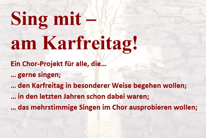 Der Gottesdienst mit Karin Klemm am Karfreitag, 3. April um 10.30 Uhr in der Antoniuskirche Kleindöttingen wird wieder von einem Projektchor u.a. mit Gesängen aus Taizé musikalisch gestaltet.