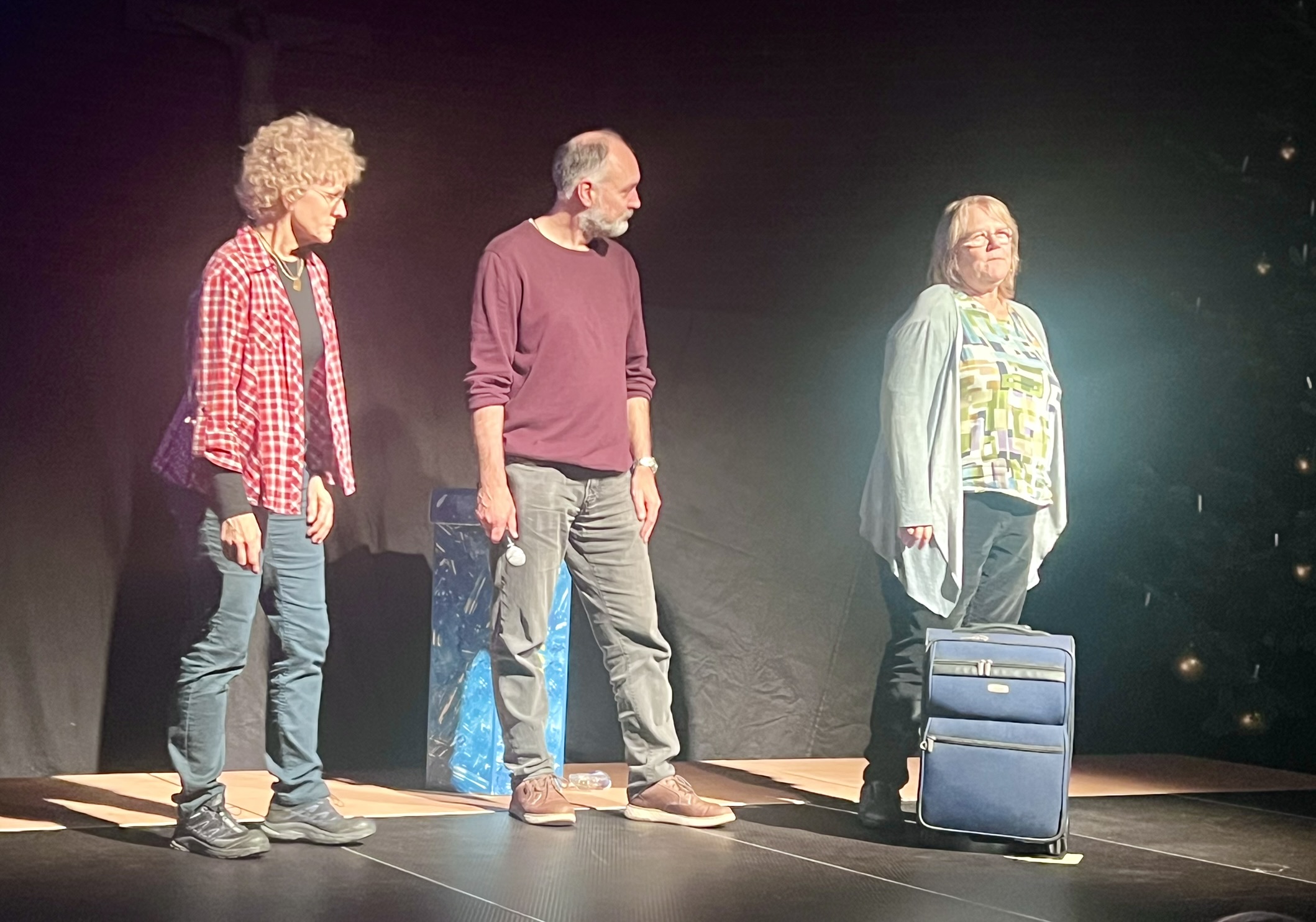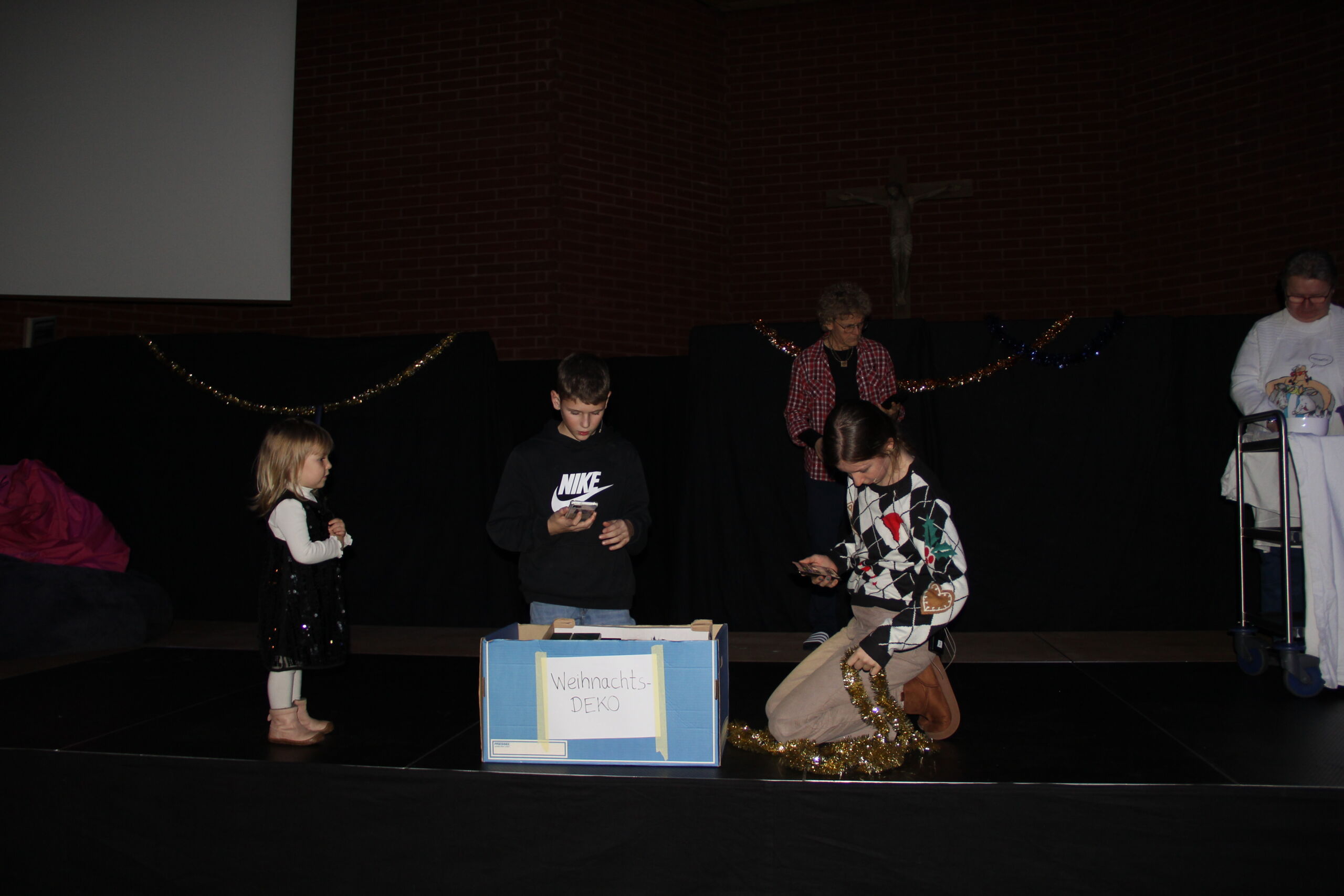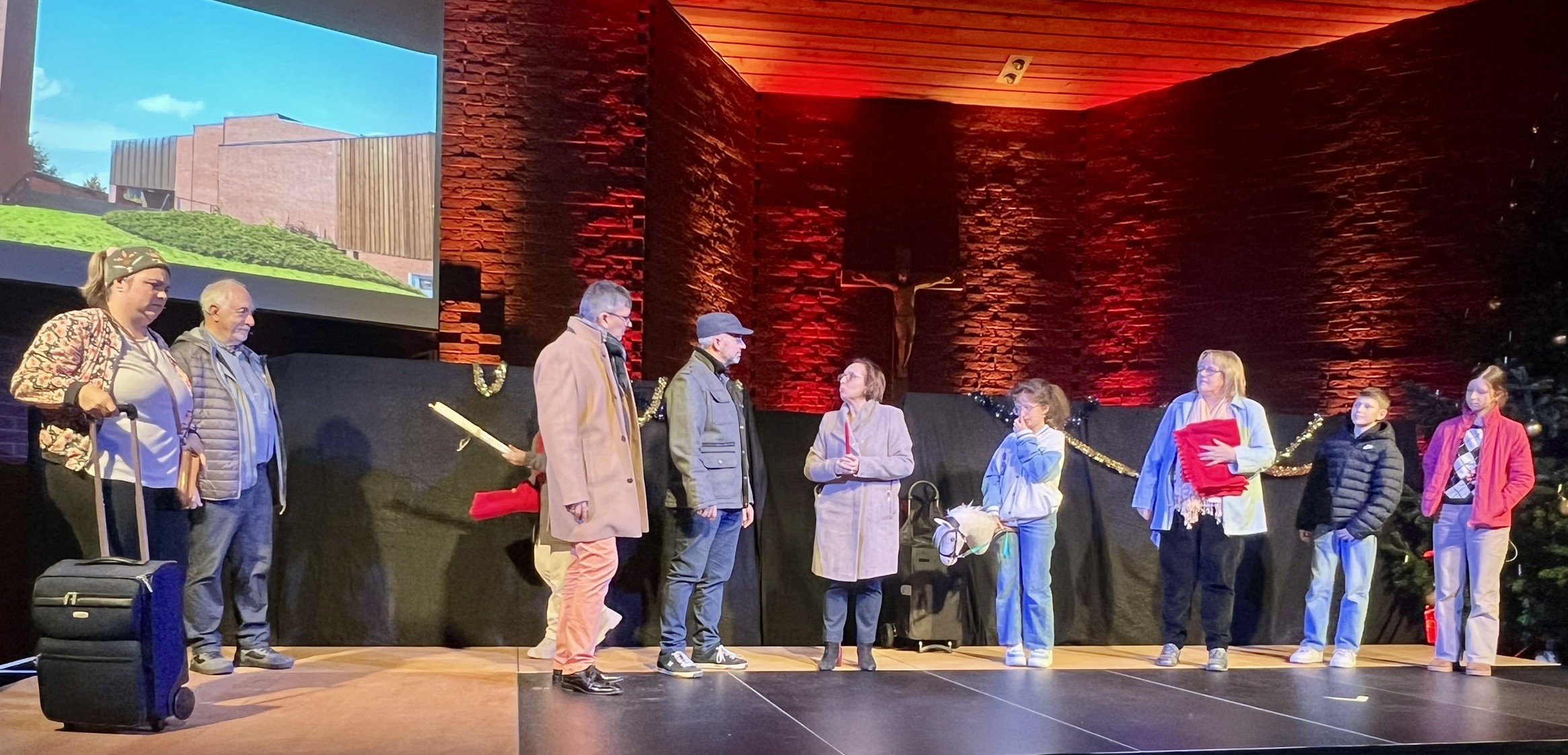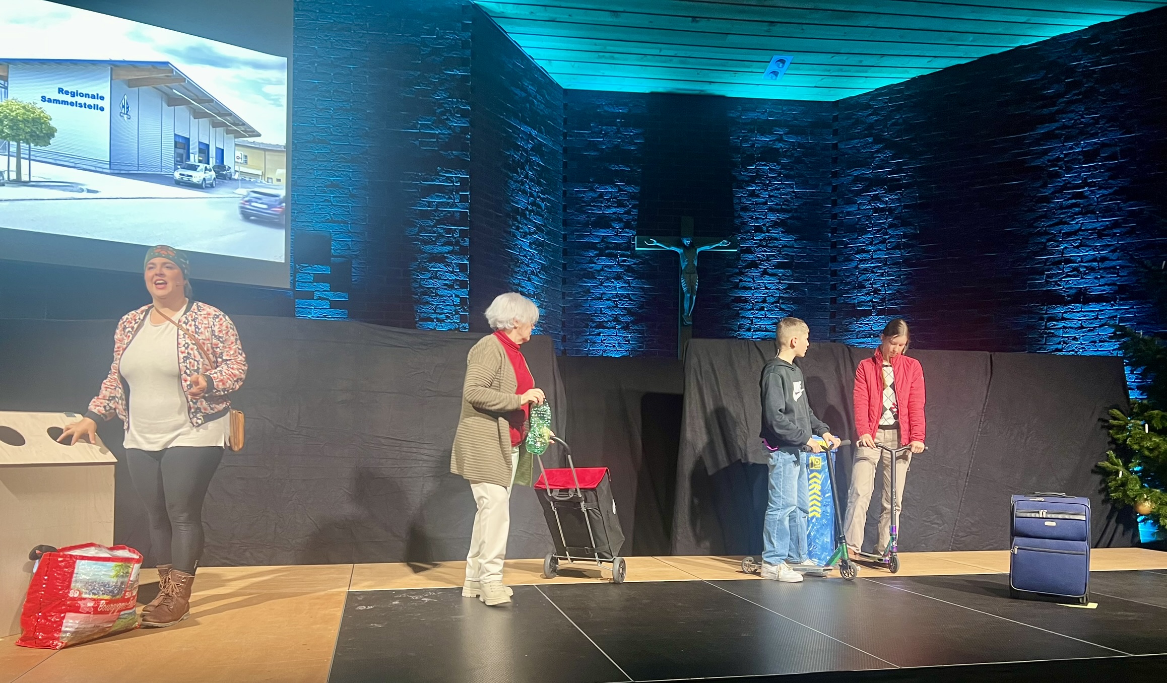 In diesem Jahr waren es nicht Maria und Josef, Hirten und Könige, sondern Menschen wie du und ich, die sich zunächst ganz normal auf die Weihnachtsfeiertage vorbereiteten. Den eigentlichen Sinn von Weihnachten kennen nur noch wenige, wie z. B. der Grossvater Nonno Pi (gespielt von Giuseppe Longo). Der jungen Mutter Angie (gespielt von Clia Bugmann) geht es vor allem um coole Fotos für ihren SocialMedia-Account, und die Krippenfiguren, die sie zufällig in einem alten Koffer auf dem Recycling-Hof finden, sind für die Teenies (gepsielt von Jette John und Til Schmidt-Taube) ziemlich uninteressant. Nur die etwas verwirrt scheinende ältere Dame Hannah (gespielt von Maria Longo) scheint mehr zu wissen als alle anderen. Sie ist immer im richtigen Moment am richtigen Ort und macht die richtigen Dinge, die aber oft erst später Sinn ergeben.