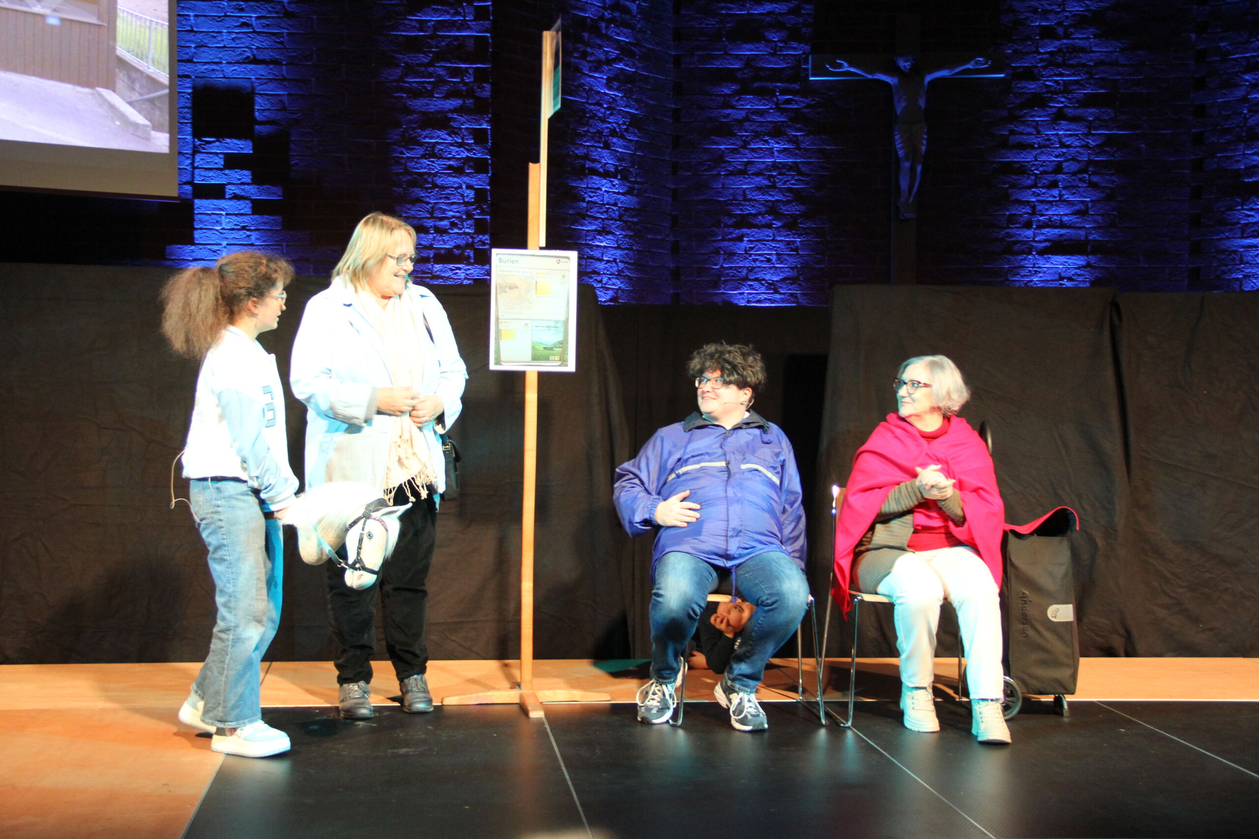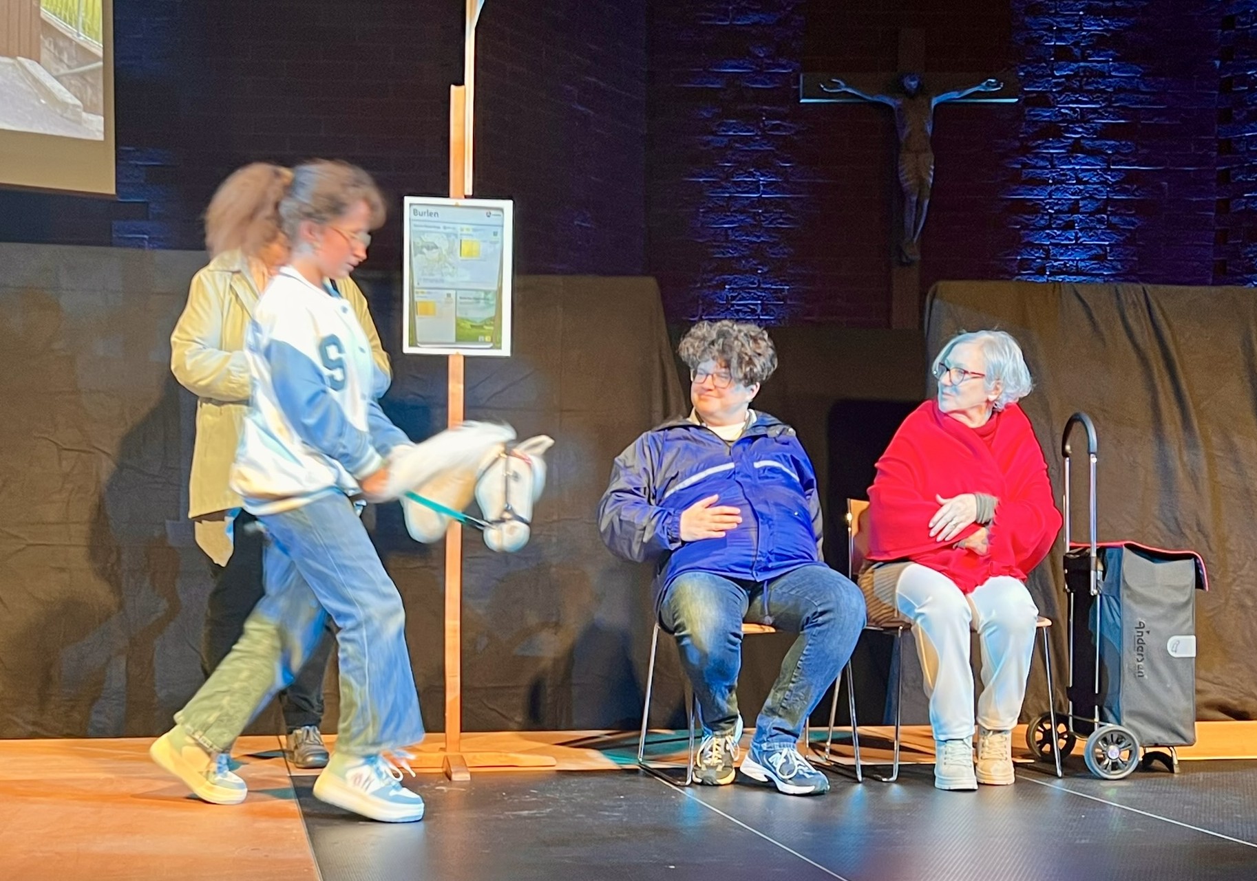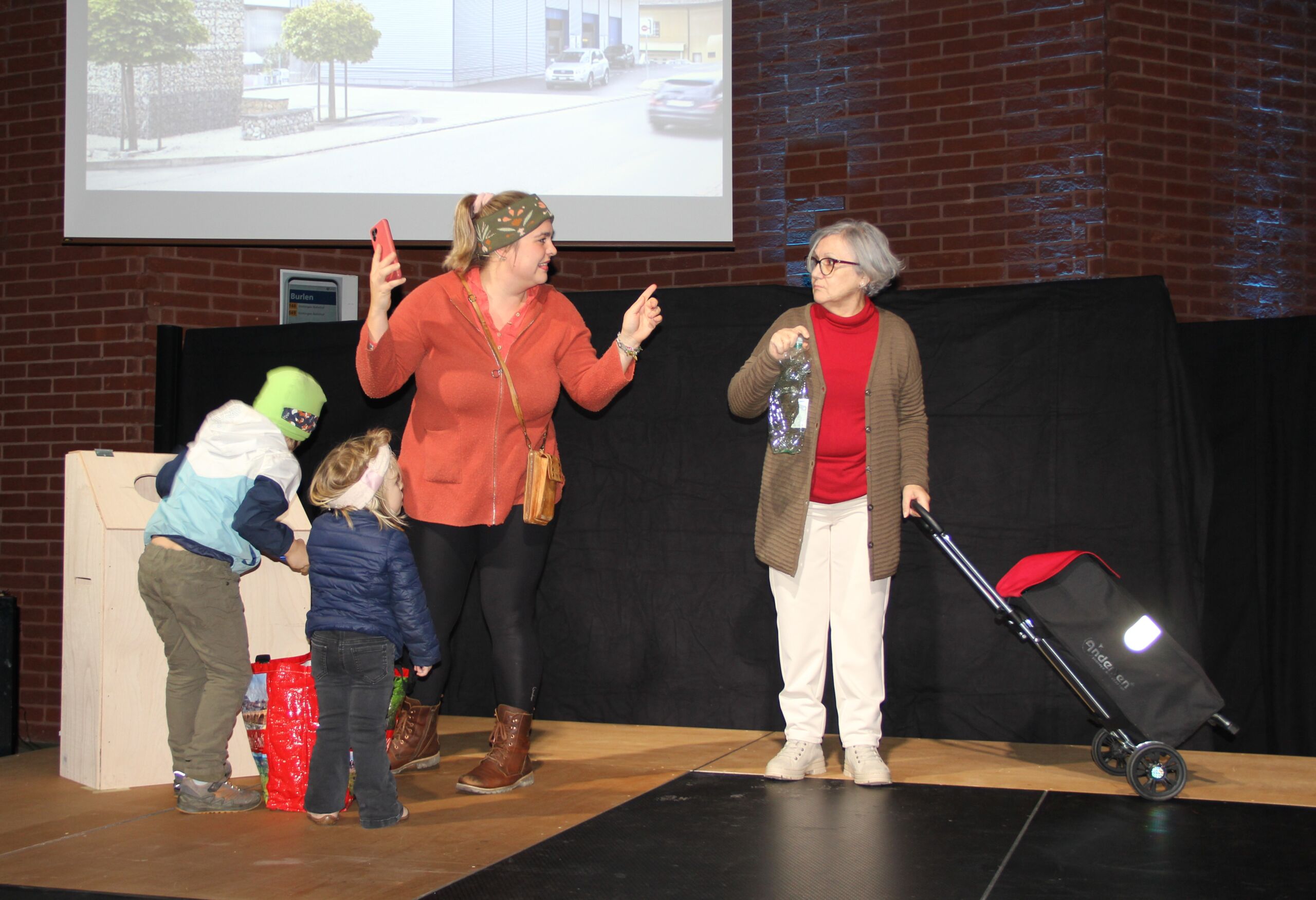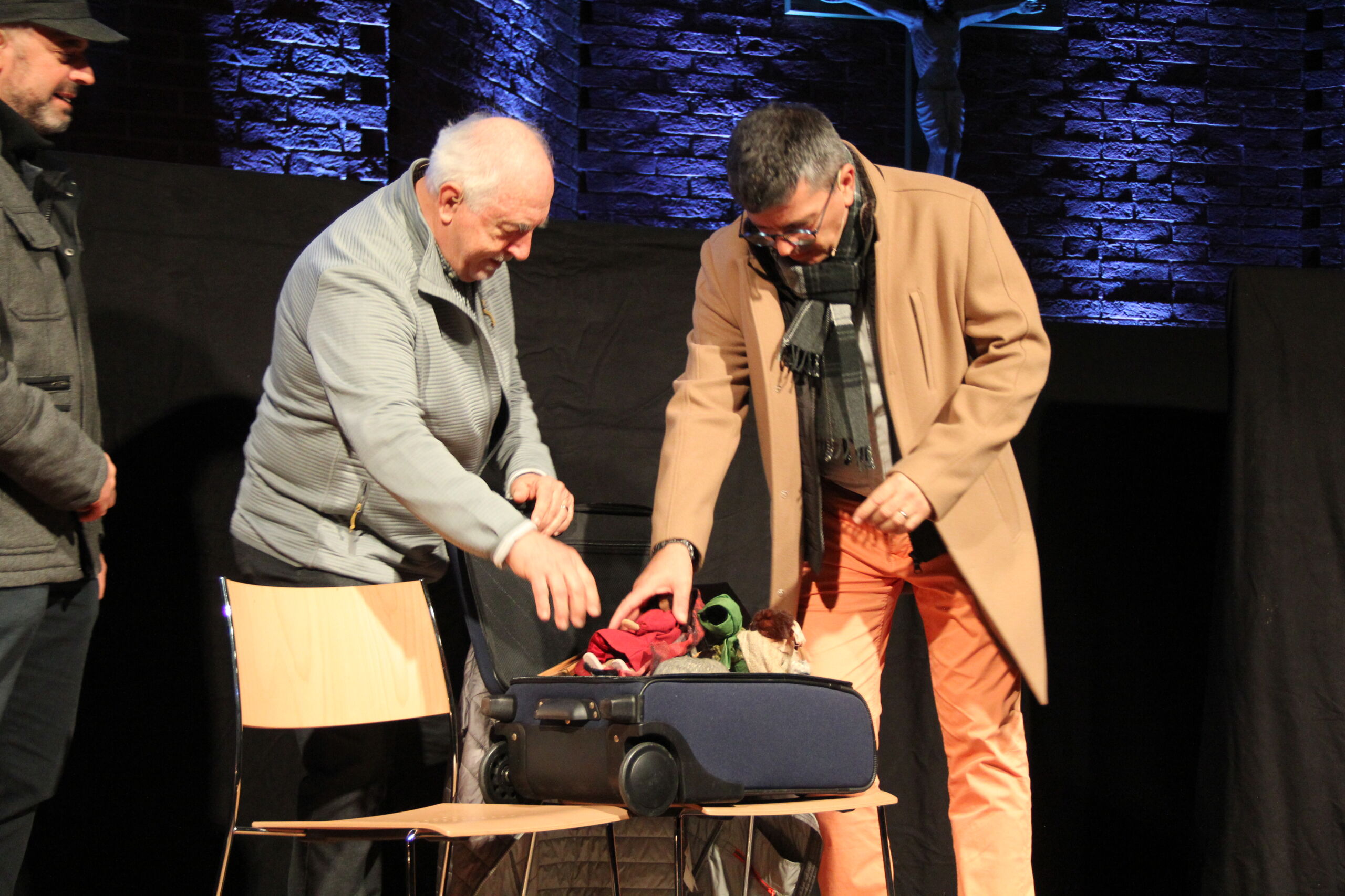 In diesem Jahr waren es nicht Maria und Josef, Hirten und Könige, sondern Menschen wie du und ich, die sich zunächst ganz normal auf die Weihnachtsfeiertage vorbereiteten. Den eigentlichen Sinn von Weihnachten kennen nur noch wenige, wie z. B. der Grossvater Nonno Pi (gespielt von Giuseppe Longo). Der jungen Mutter Angie (gespielt von Clia Bugmann) geht es vor allem um coole Fotos für ihren SocialMedia-Account, und die Krippenfiguren, die sie zufällig in einem alten Koffer auf dem Recycling-Hof finden, sind für die Teenies (gepsielt von Jette John und Til Schmidt-Taube) ziemlich uninteressant. Nur die etwas verwirrt scheinende ältere Dame Hannah (gespielt von Maria Longo) scheint mehr zu wissen als alle anderen. Sie ist immer im richtigen Moment am richtigen Ort und macht die richtigen Dinge, die aber oft erst später Sinn ergeben.