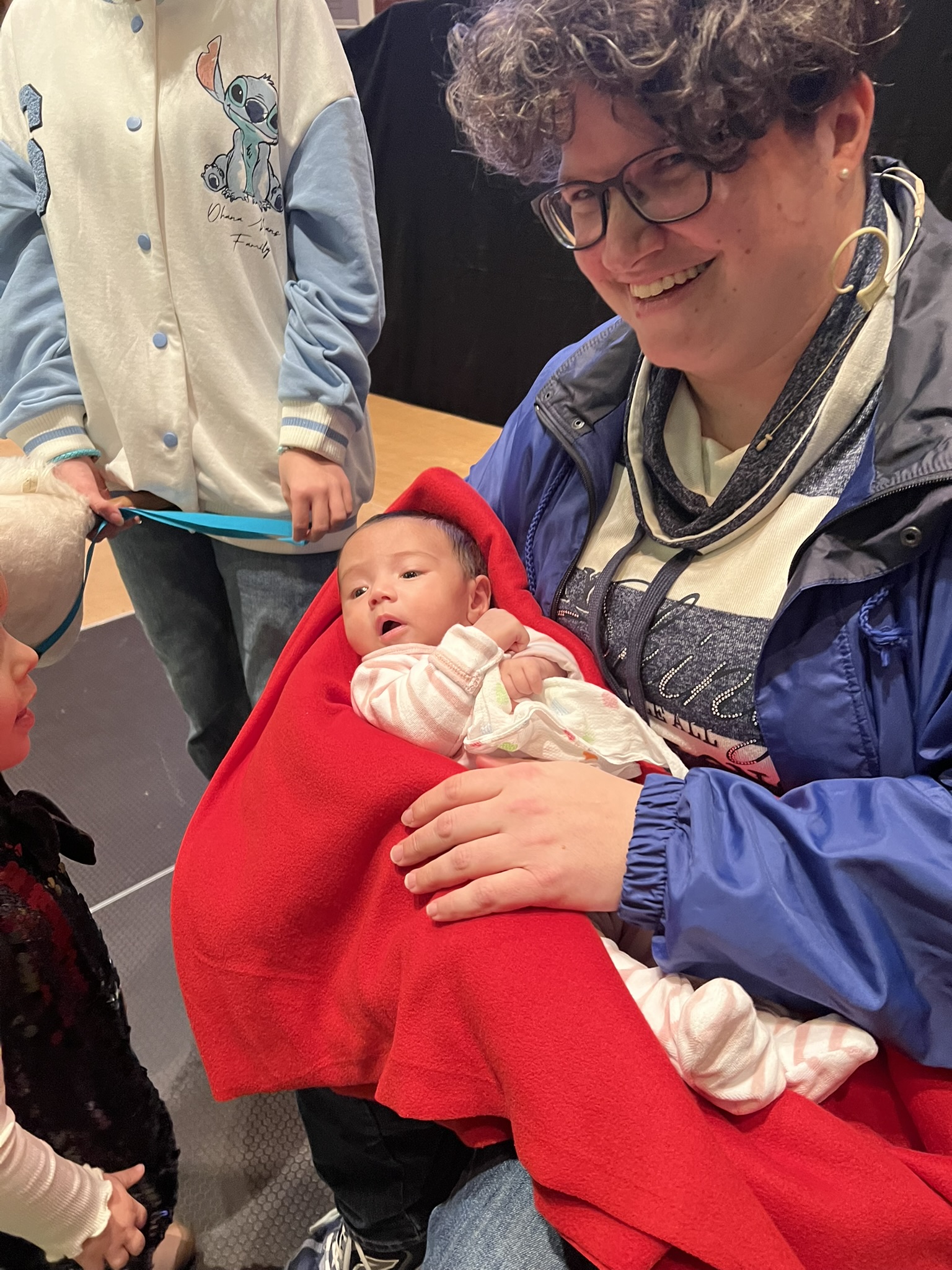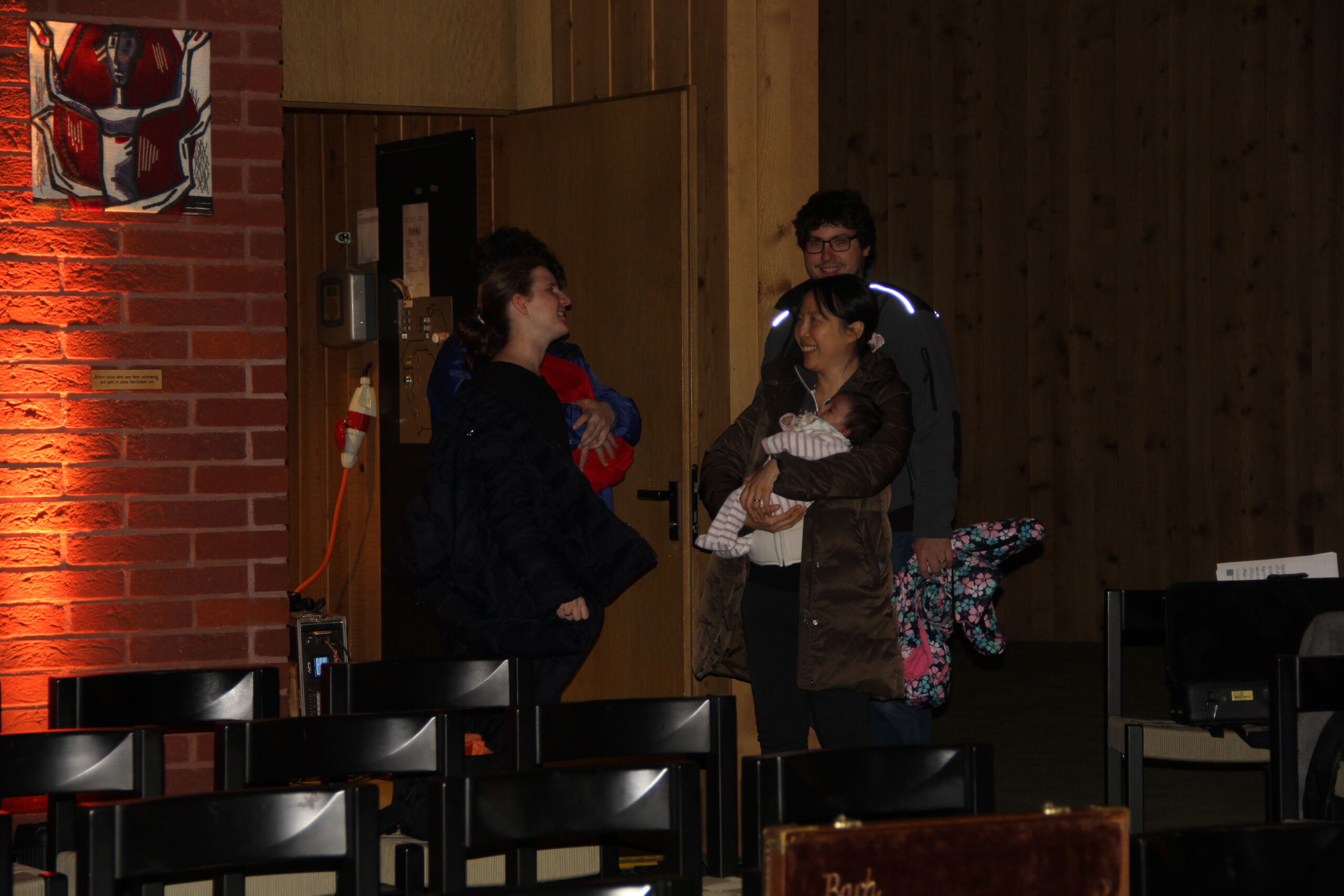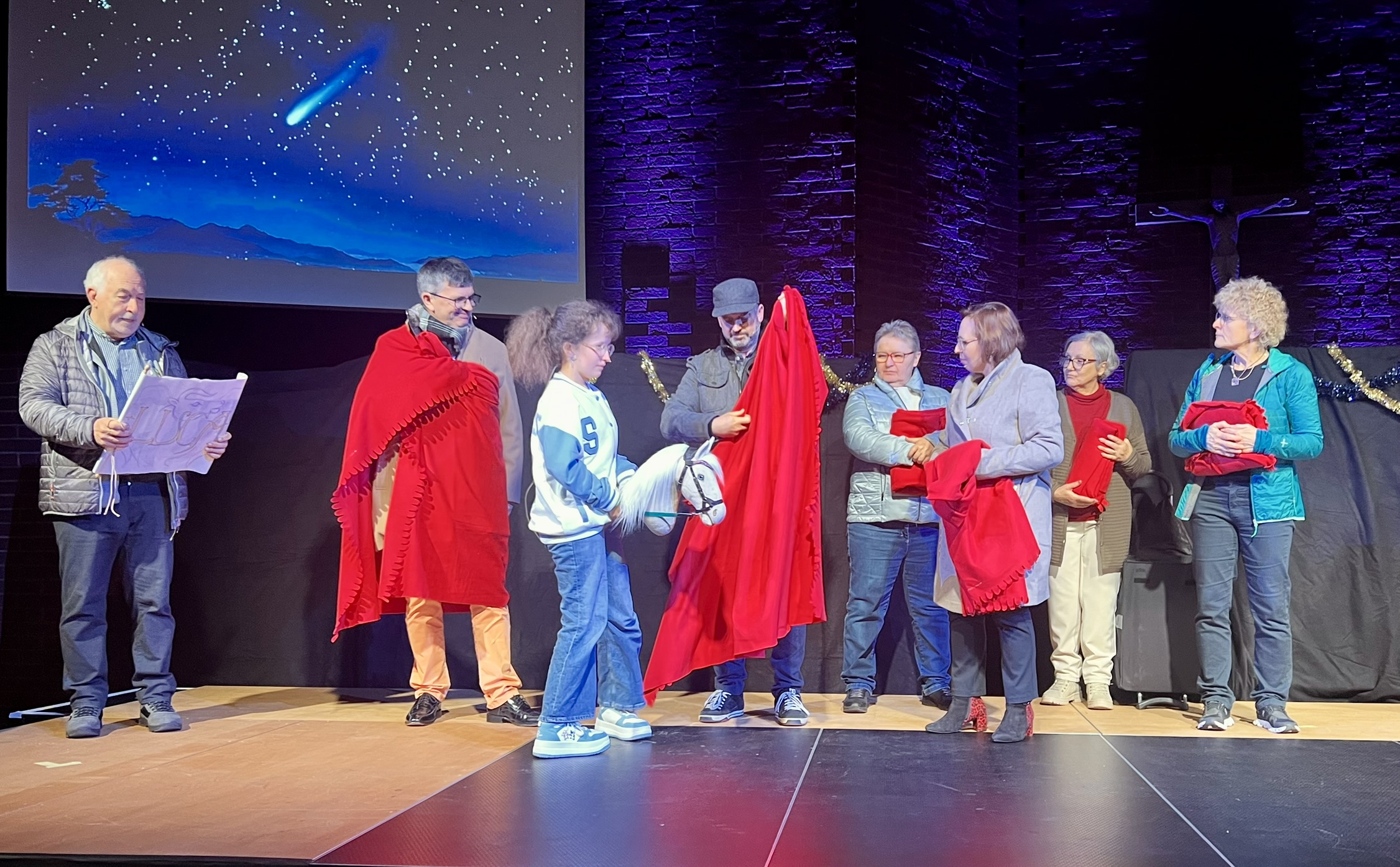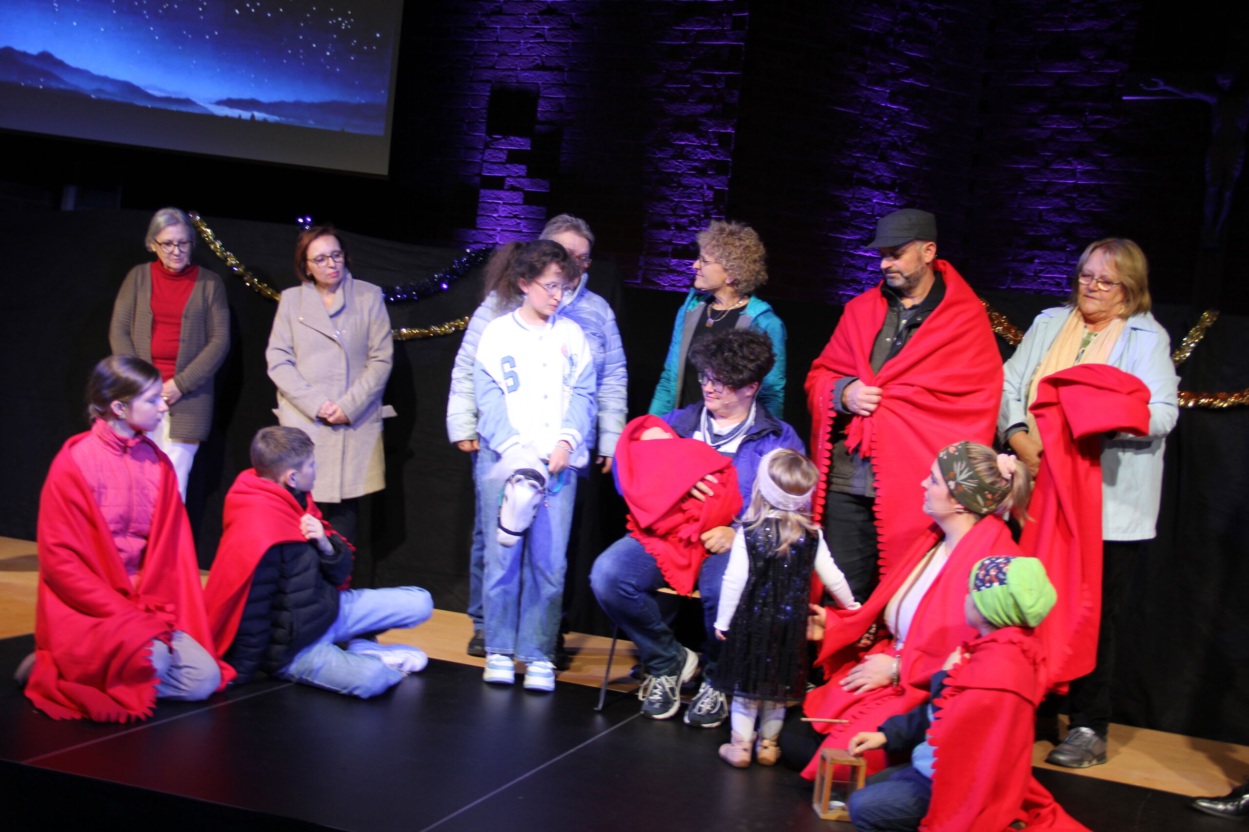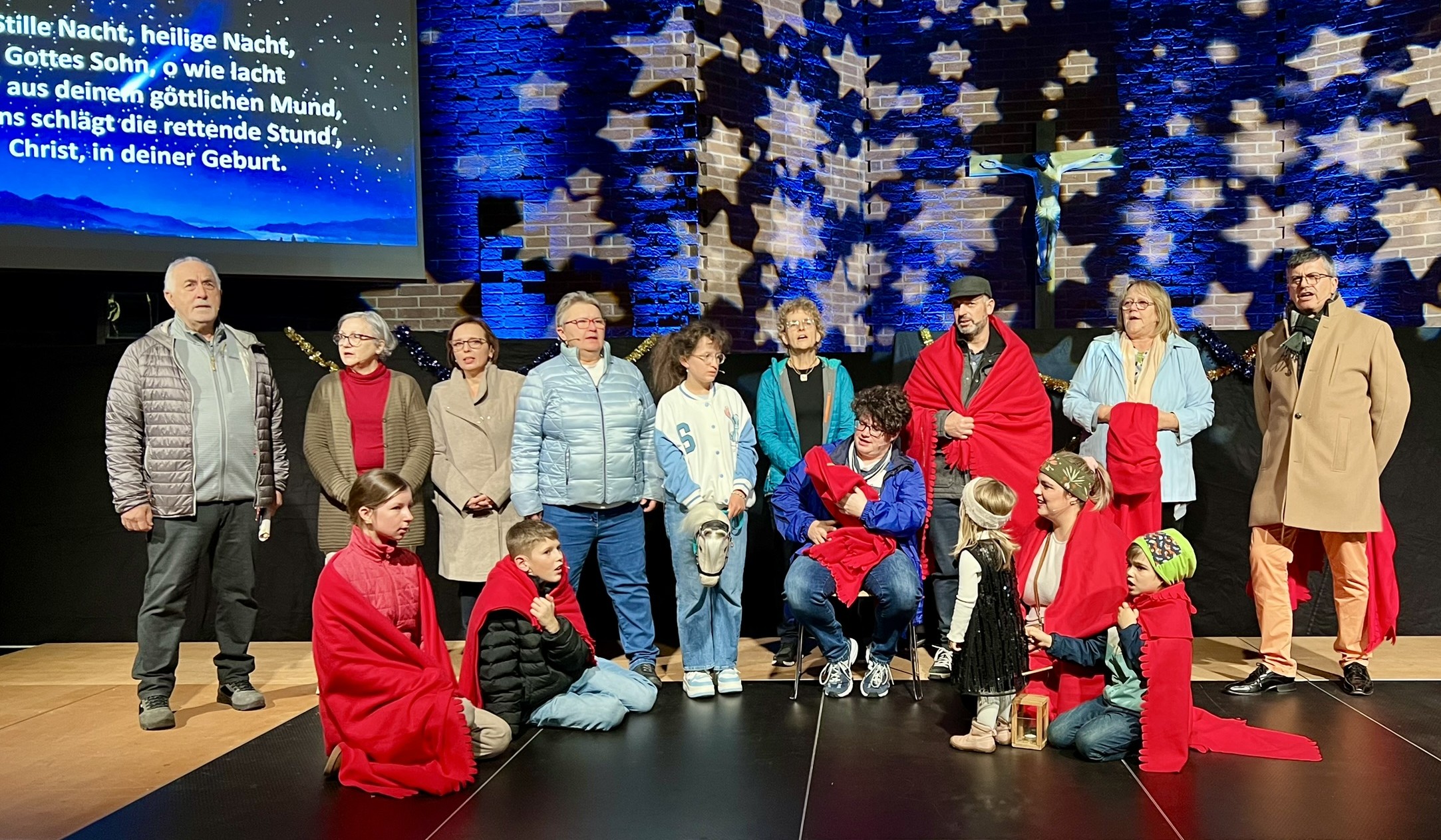Am Ende treffen alle vor der Kirche zusammen, spielen die Weihnachtsgeschichte nach und freuen sich über die Geburt des Kindes (gespielt von Eileen Renner, geb. 17.10.2024) Weihnachten bringt Menschen zusammen! Das wird auch beim Schlussgebet und beim gemeinsamen "Amen" deutlich.