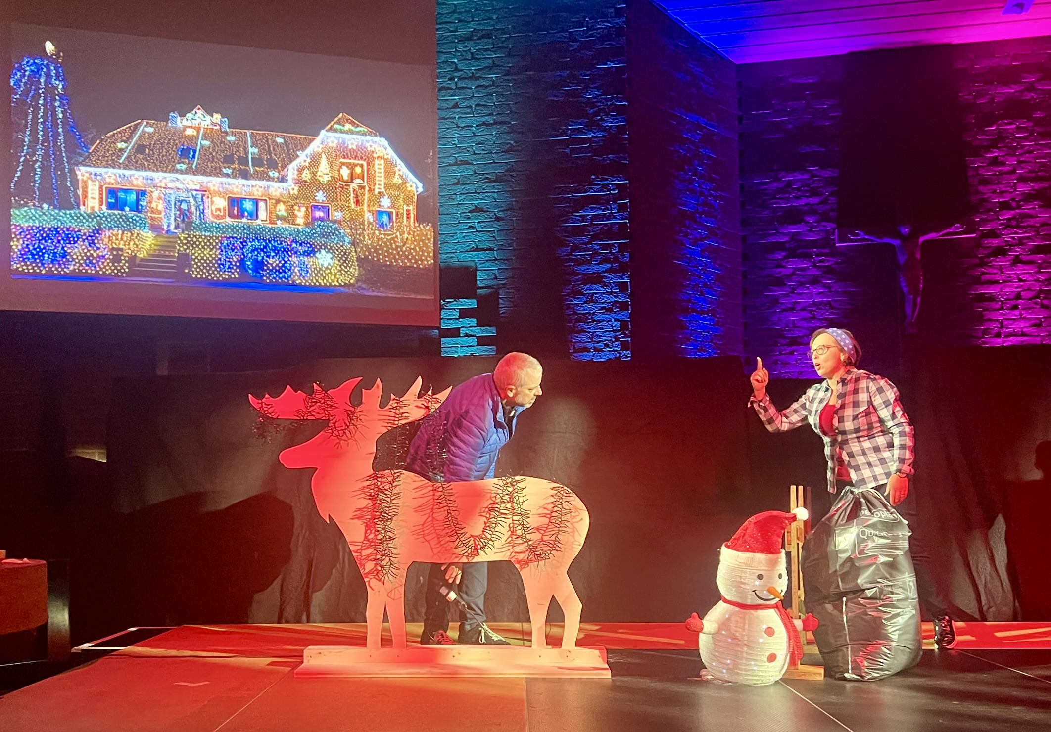 Zwei Nachbarn (gespielt von Carmelina Cristallo und Lukas Bigger) streiten sich über die richtige Weihnachtsdekoration.