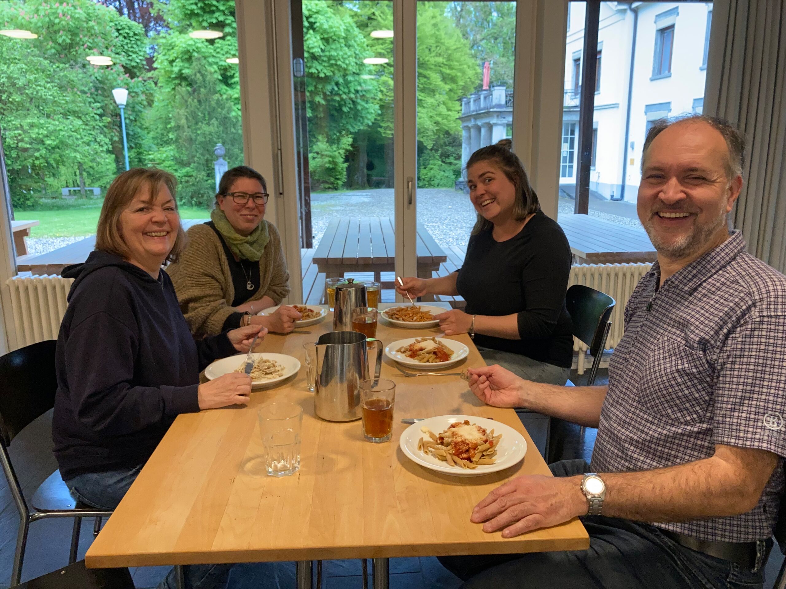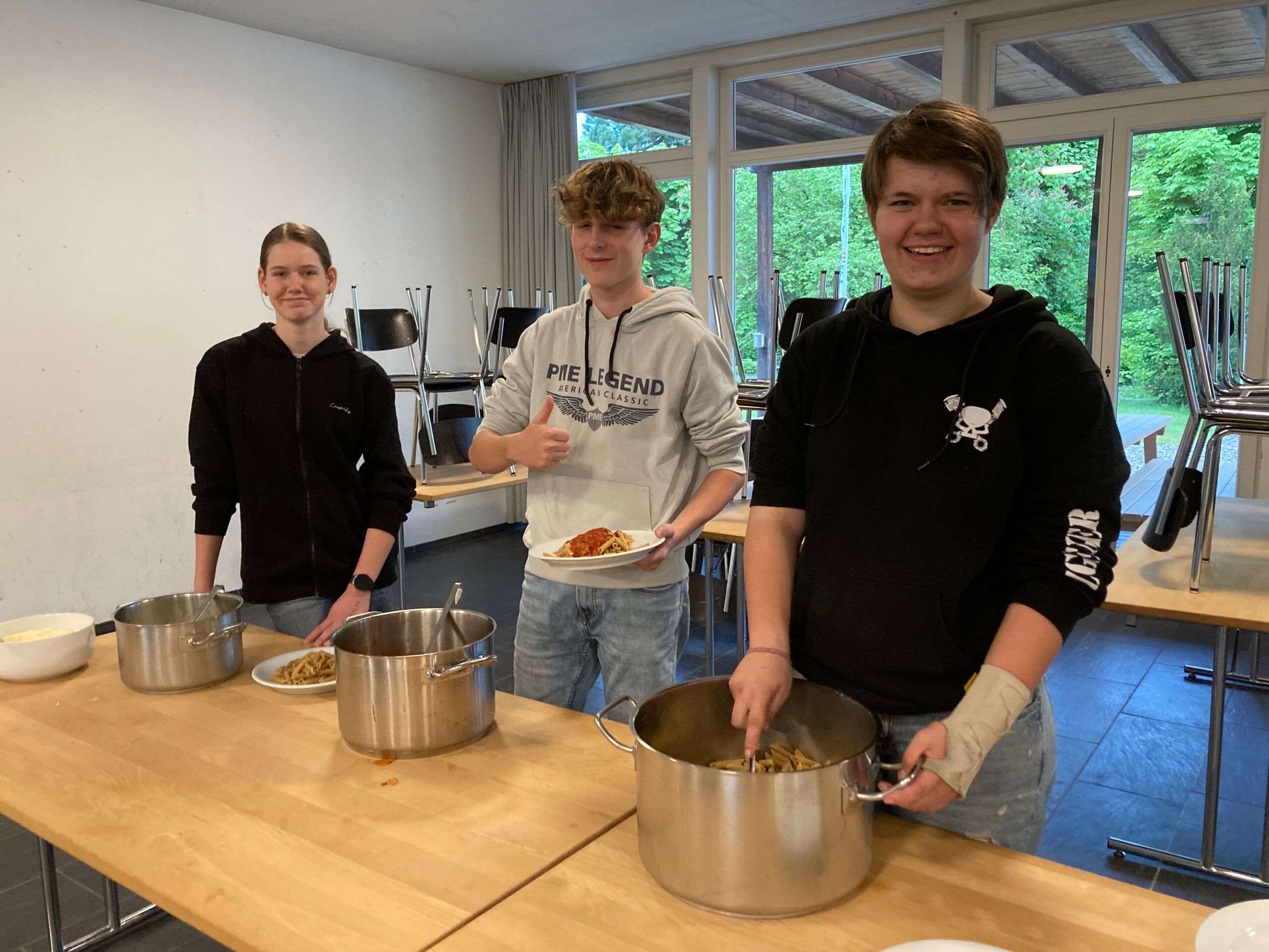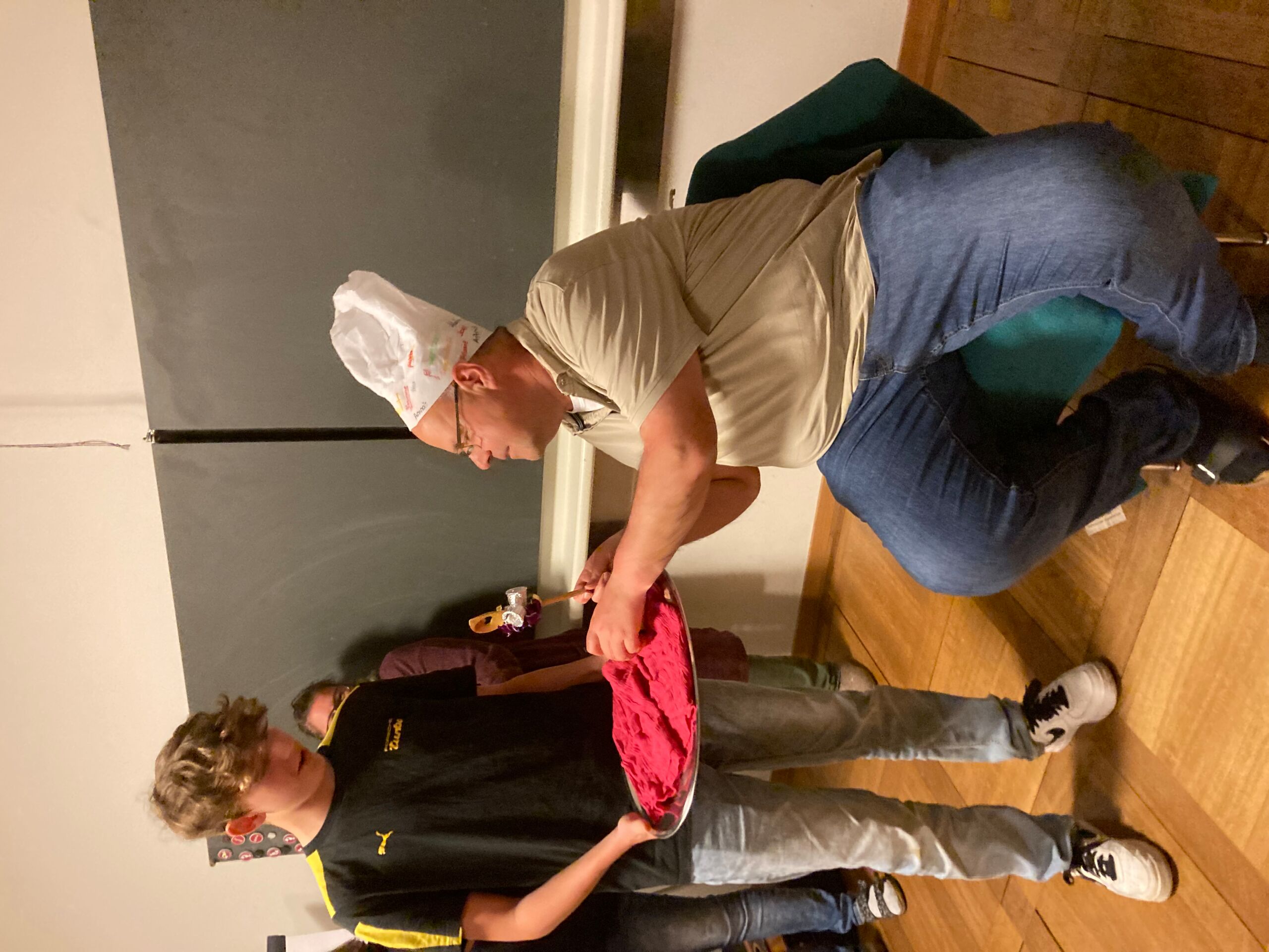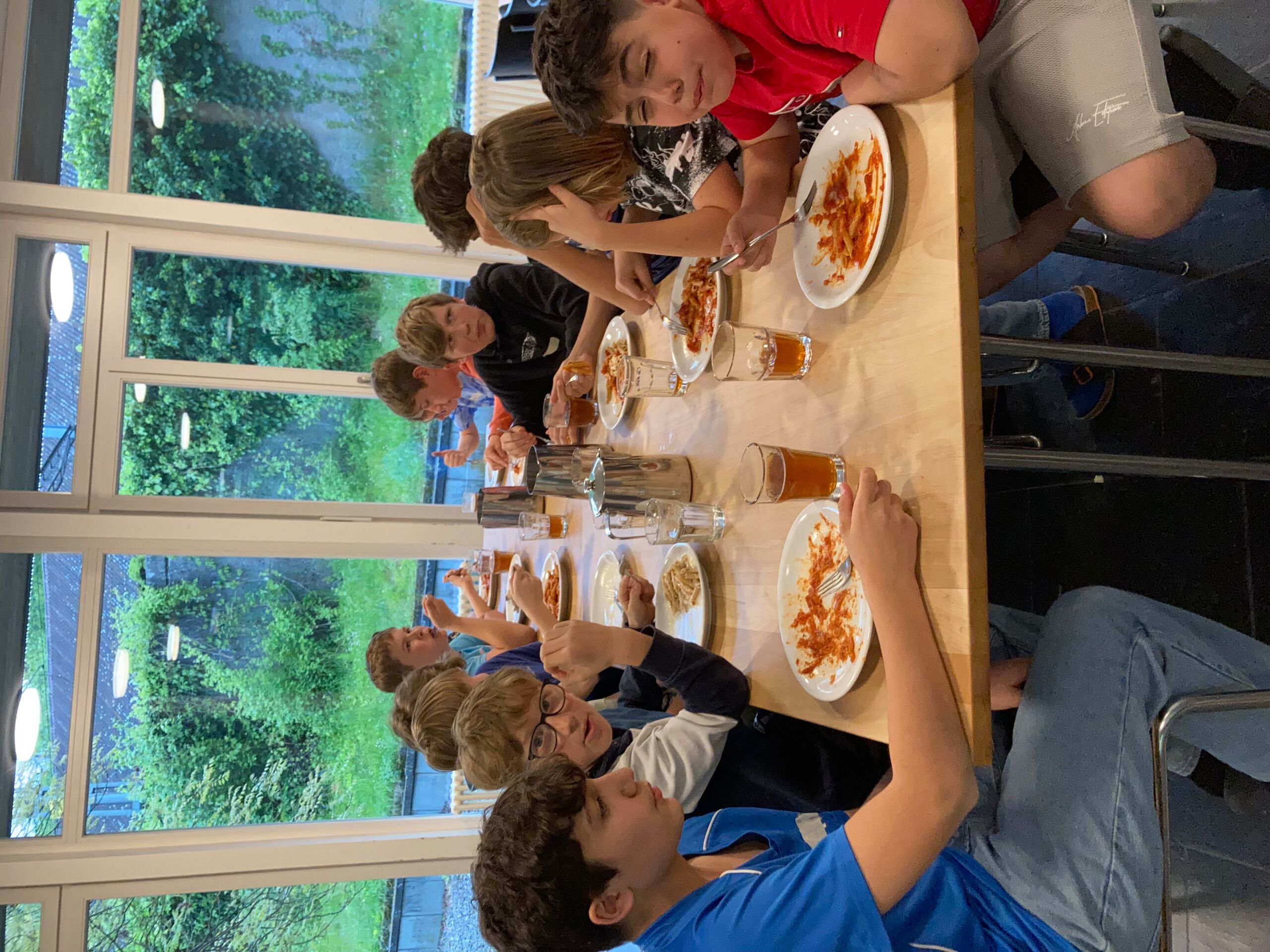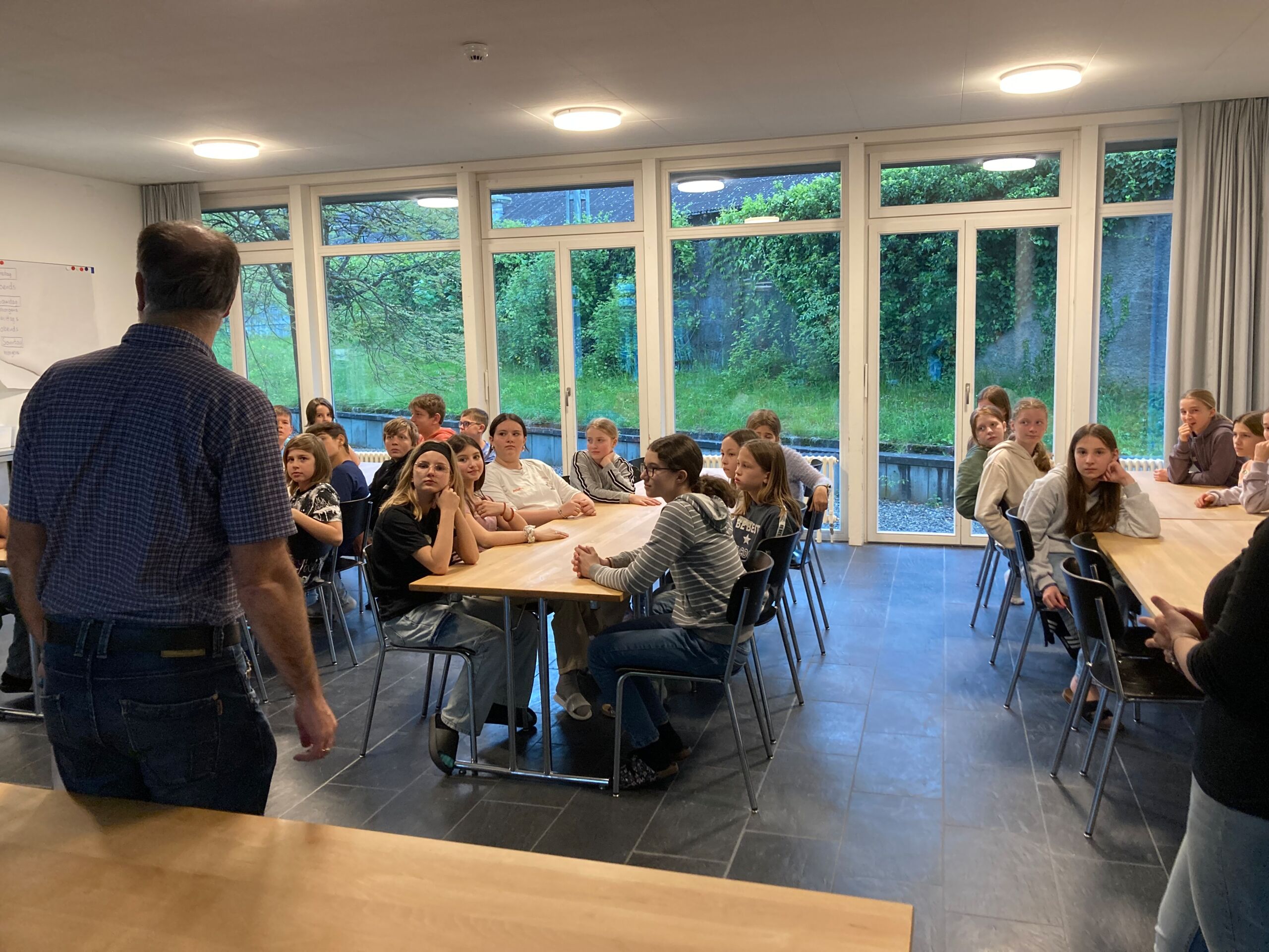 Schon bei der Abfahrt am Freitagnachmittag am Bahnhof Döttingen war die Spannung und Vorfreude spürbar. Nach einer rund einstündigen Zugfahrt und einem kurzen Fussweg vom Bahnhof Aarburg-Oftringen stand die Gruppe im herrlichen Park der „Villa Jugend“ und richtete sich kurz darauf in den 8er-Zimmern ein. Zum letzten Mal stand Pfarrer Stefan Essig in der Küche, unterstützt von drei Oberstufenschüler*innen. Mit Teigwaren und verschiedenen Saussen konnten sich alle für die Kennenlernspiele am Abend stärken. Und vor dem Schlafengehen gab es noch feinen Kuchen, den die Eltern ihren Kindern mitgegeben hatten.