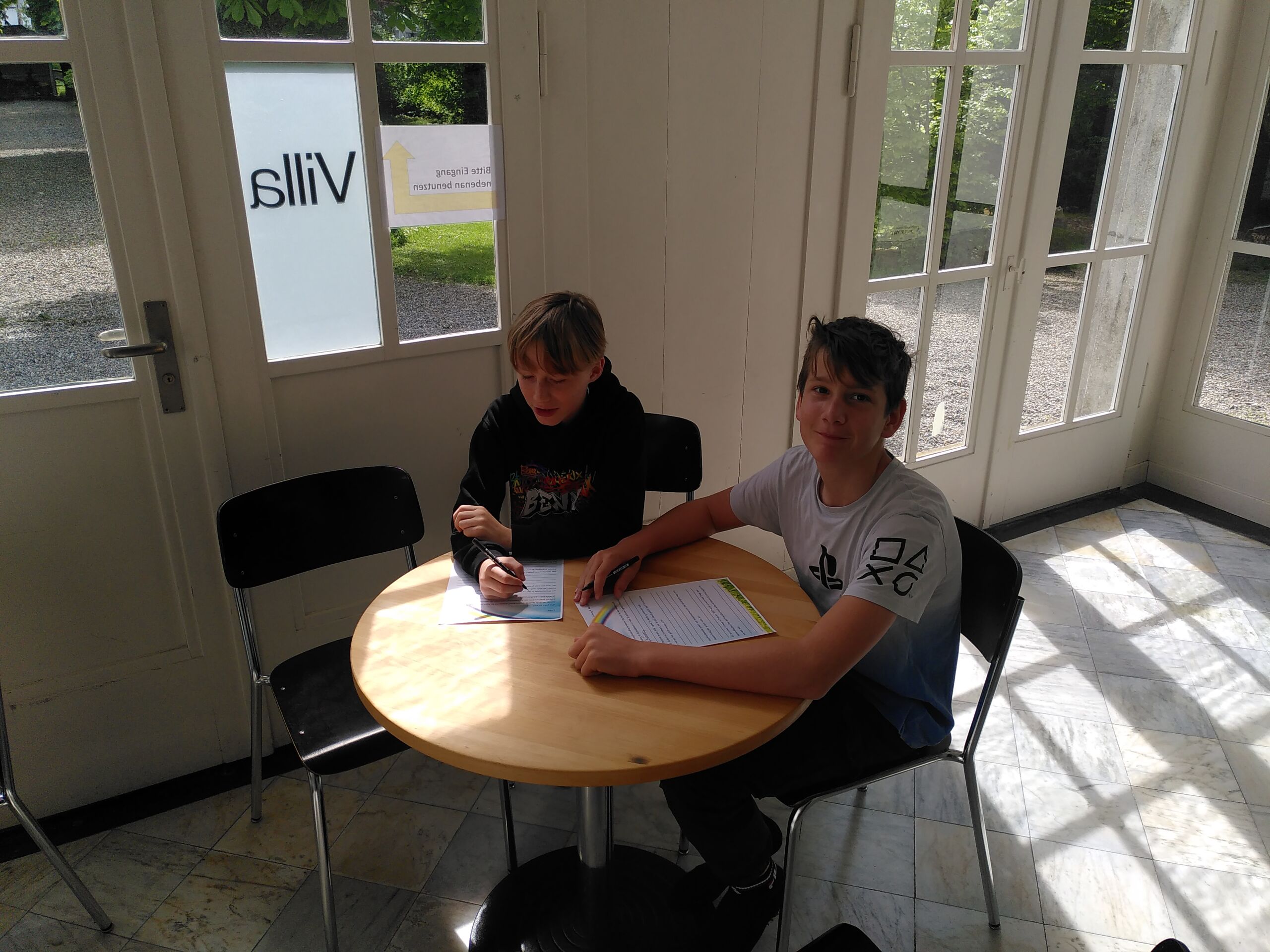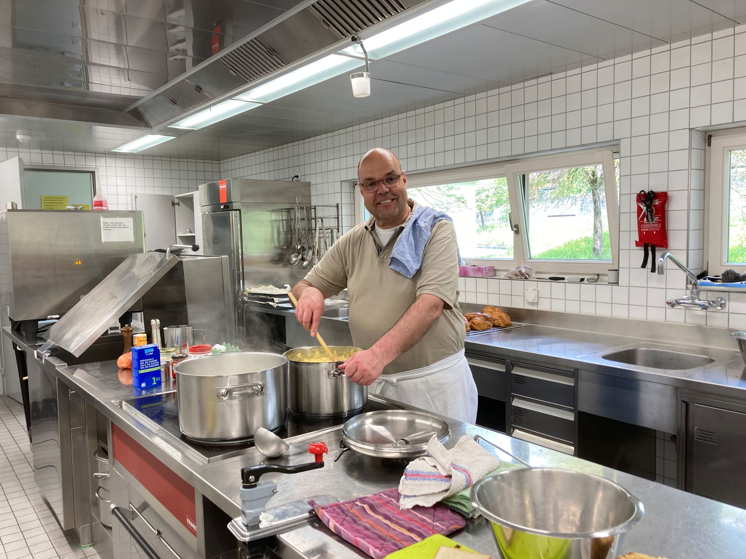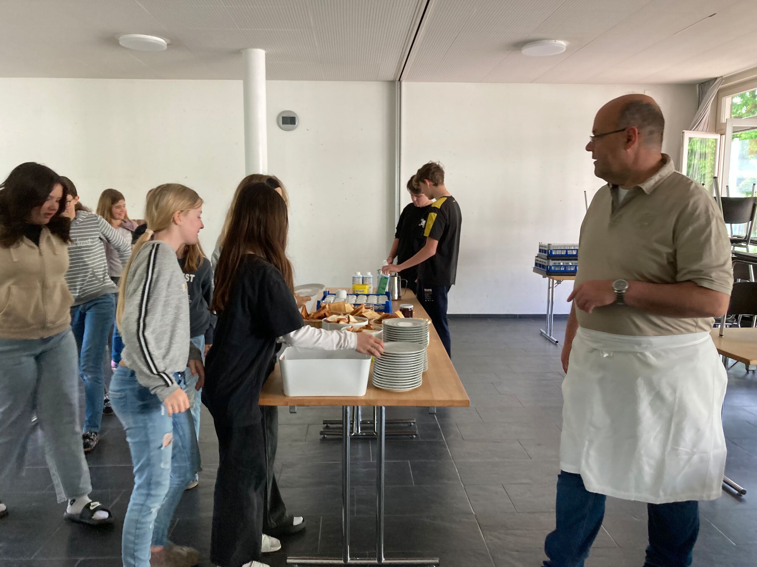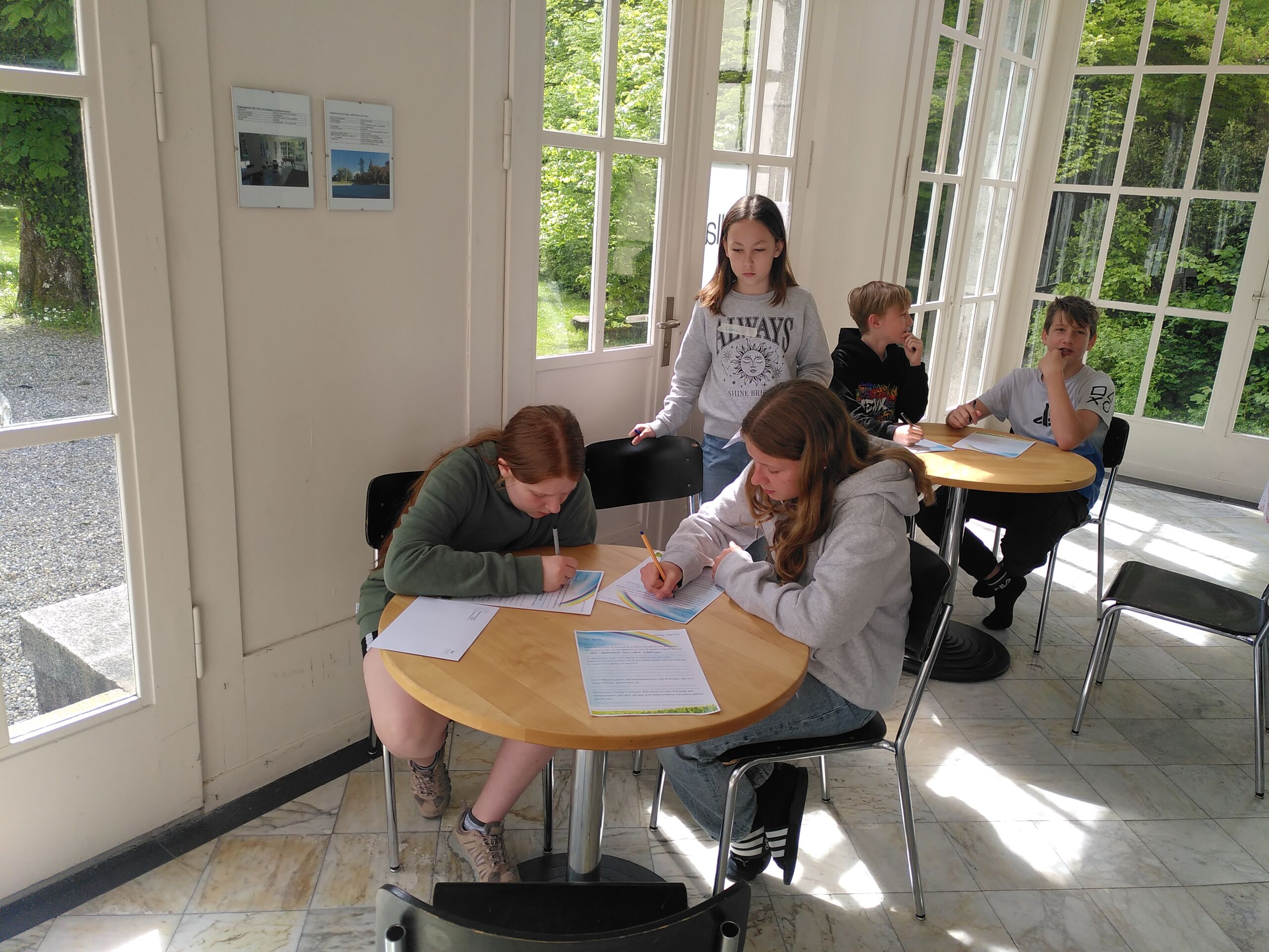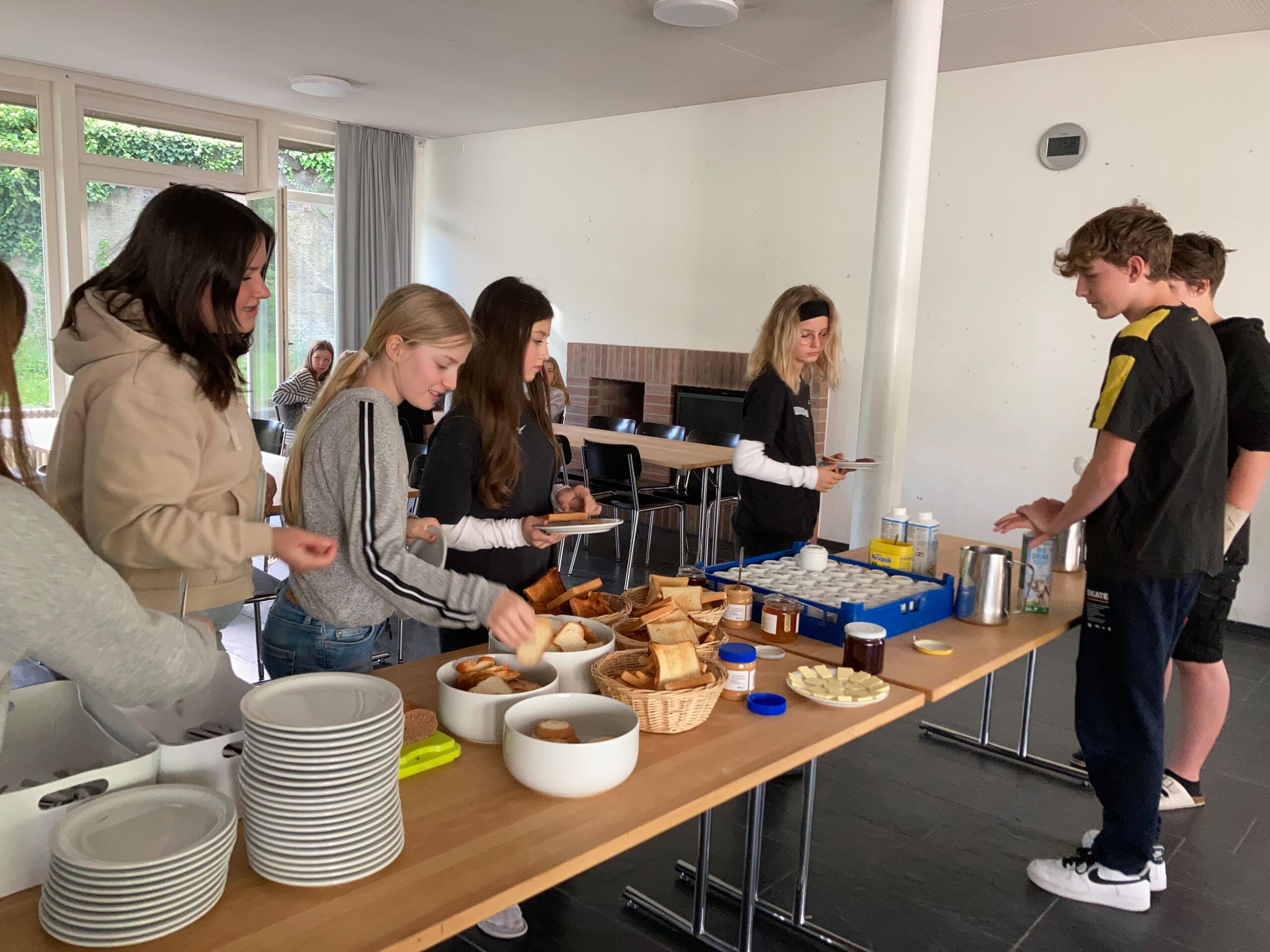 Schon bei der Abfahrt am Freitagnachmittag am Bahnhof Döttingen war die Spannung und Vorfreude spürbar. Nach einer rund einstündigen Zugfahrt und einem kurzen Fussweg vom Bahnhof Aarburg-Oftringen stand die Gruppe im herrlichen Park der „Villa Jugend“ und richtete sich kurz darauf in den 8er-Zimmern ein. Zum letzten Mal stand Pfarrer Stefan Essig in der Küche, unterstützt von drei Oberstufenschüler*innen. Mit Teigwaren und verschiedenen Saussen konnten sich alle für die Kennenlernspiele am Abend stärken. Und vor dem Schlafengehen gab es noch feinen Kuchen, den die Eltern ihren Kindern mitgegeben hatten.